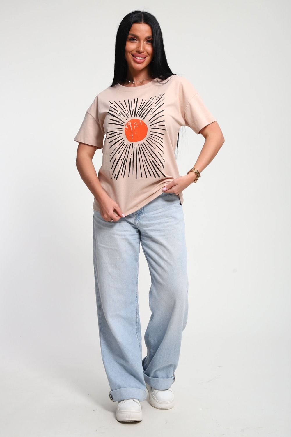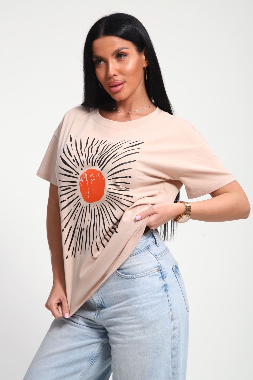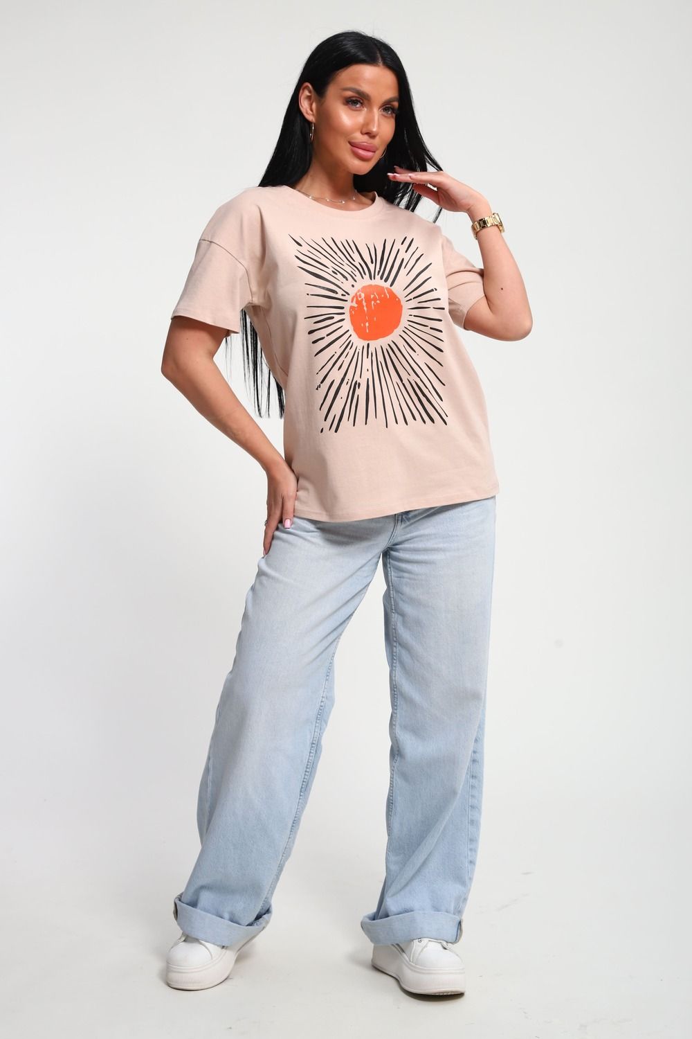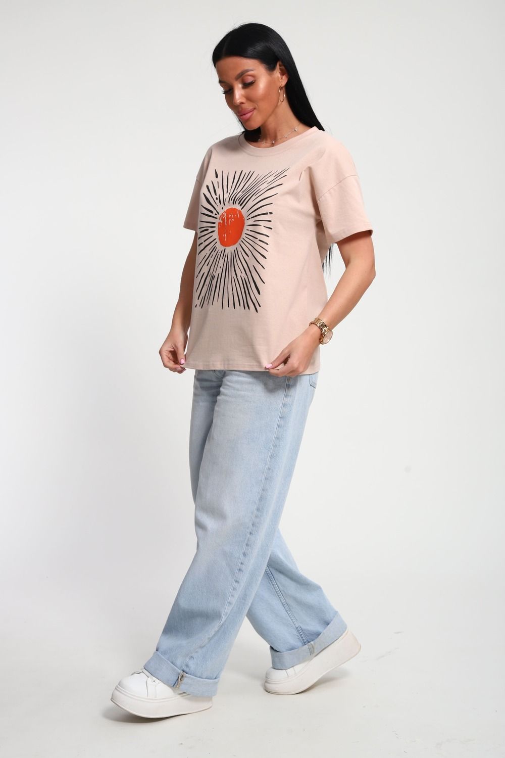 Футболка женская из гладкокрашенного трикотажа, хлопок 100%. Прямого силуэта, свободного облегания. горловина круглой формы. Рукав короткий. Низ изделия прямой. На полочке принт, шелкография.