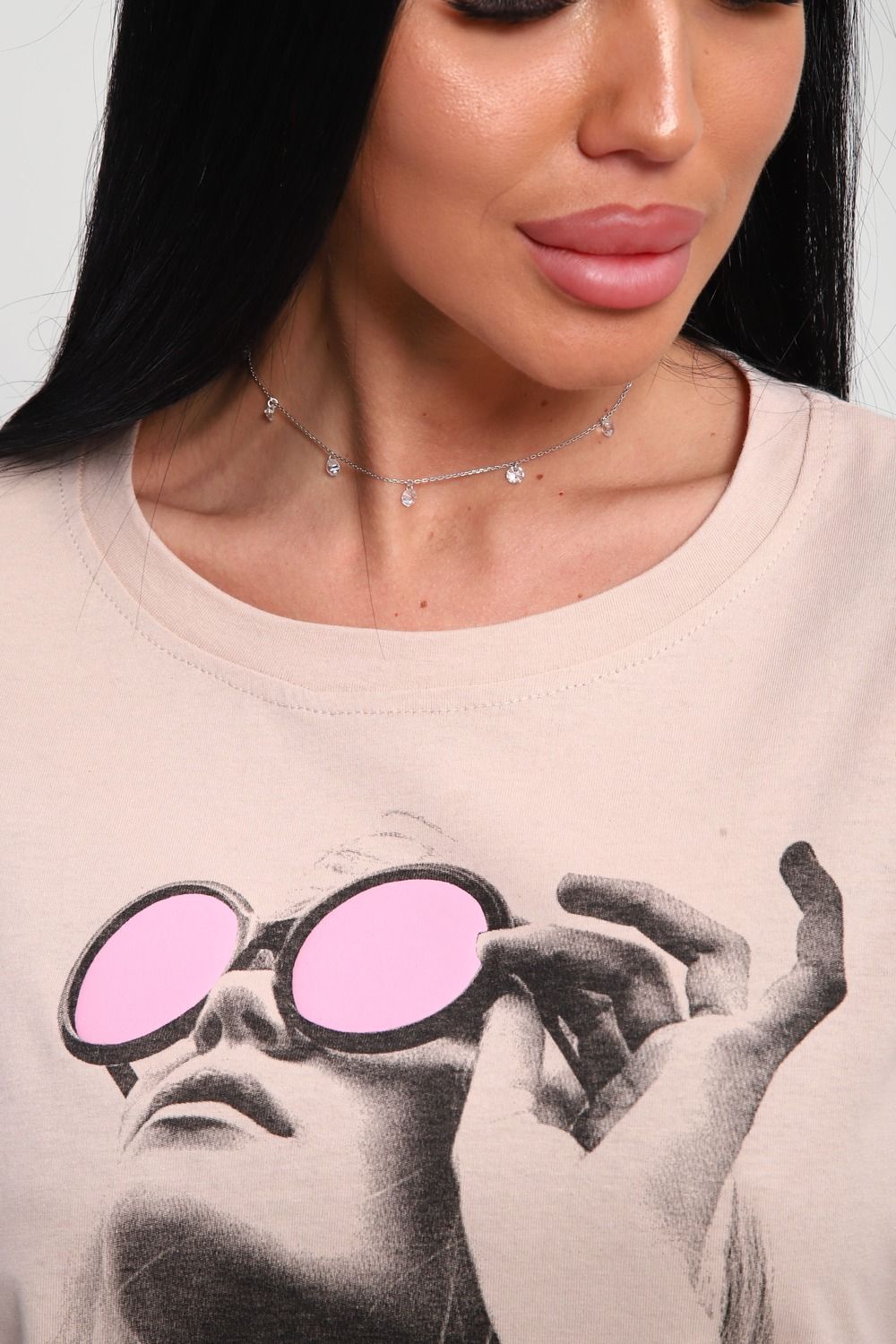 Футболка женская из гладкокрашенного трикотажа, хлопок 100%. Прямого силуэта, свободного облегания. горловина круглой формы. Рукав короткий. Низ изделия прямой. На полочке объемный принт, шелкография.