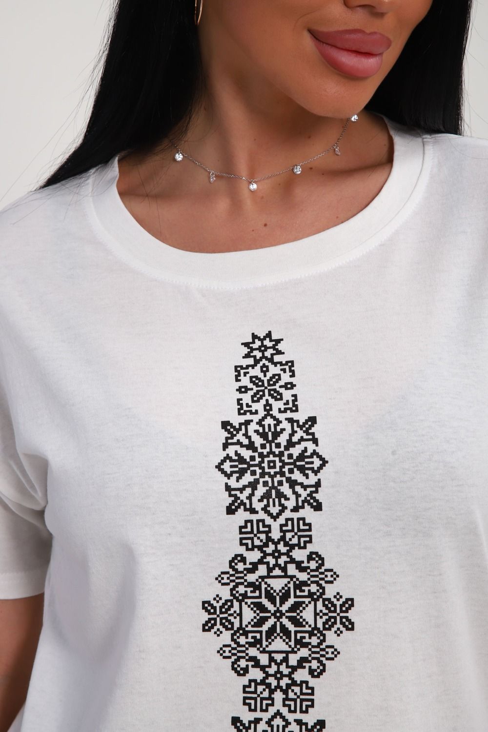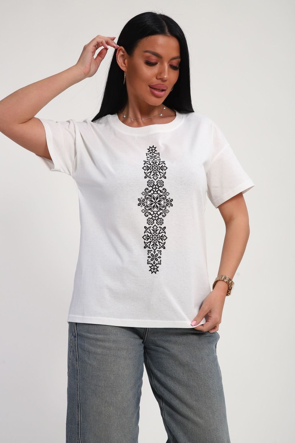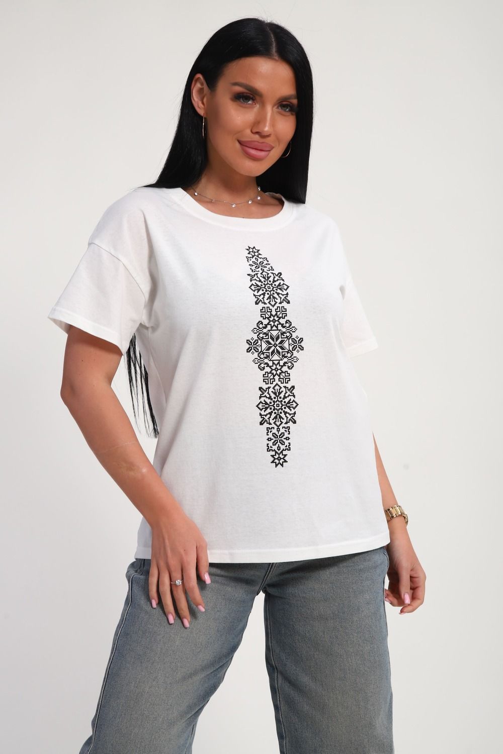 Футболка женская из гладкокрашенного трикотажа, хлопок 100%. Прямого силуэта, свободного облегания, горловина круглой формы. Рукав короткий. Низ изделия прямой. На полочке принт, шелкография.