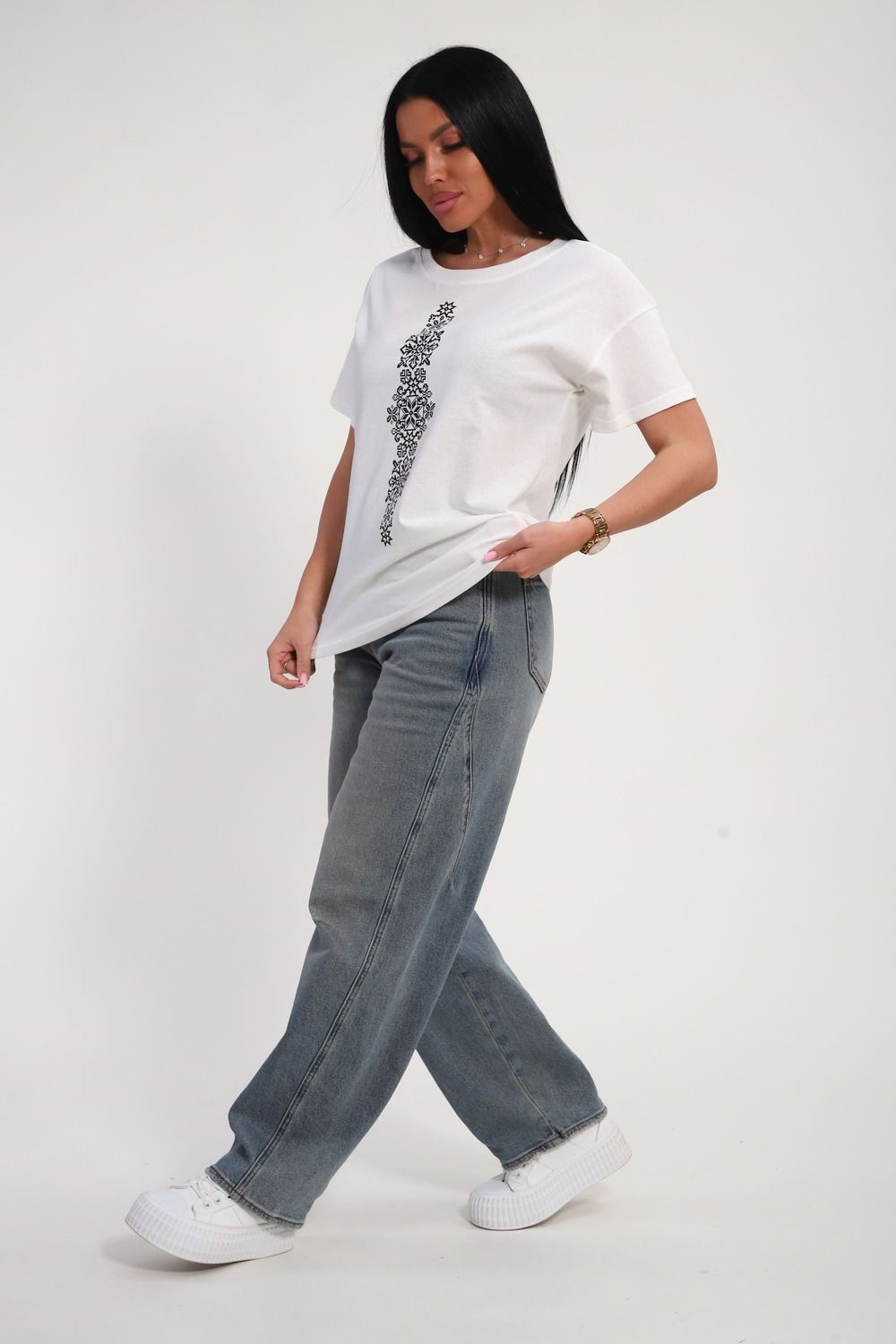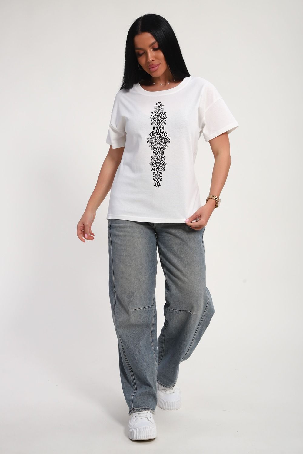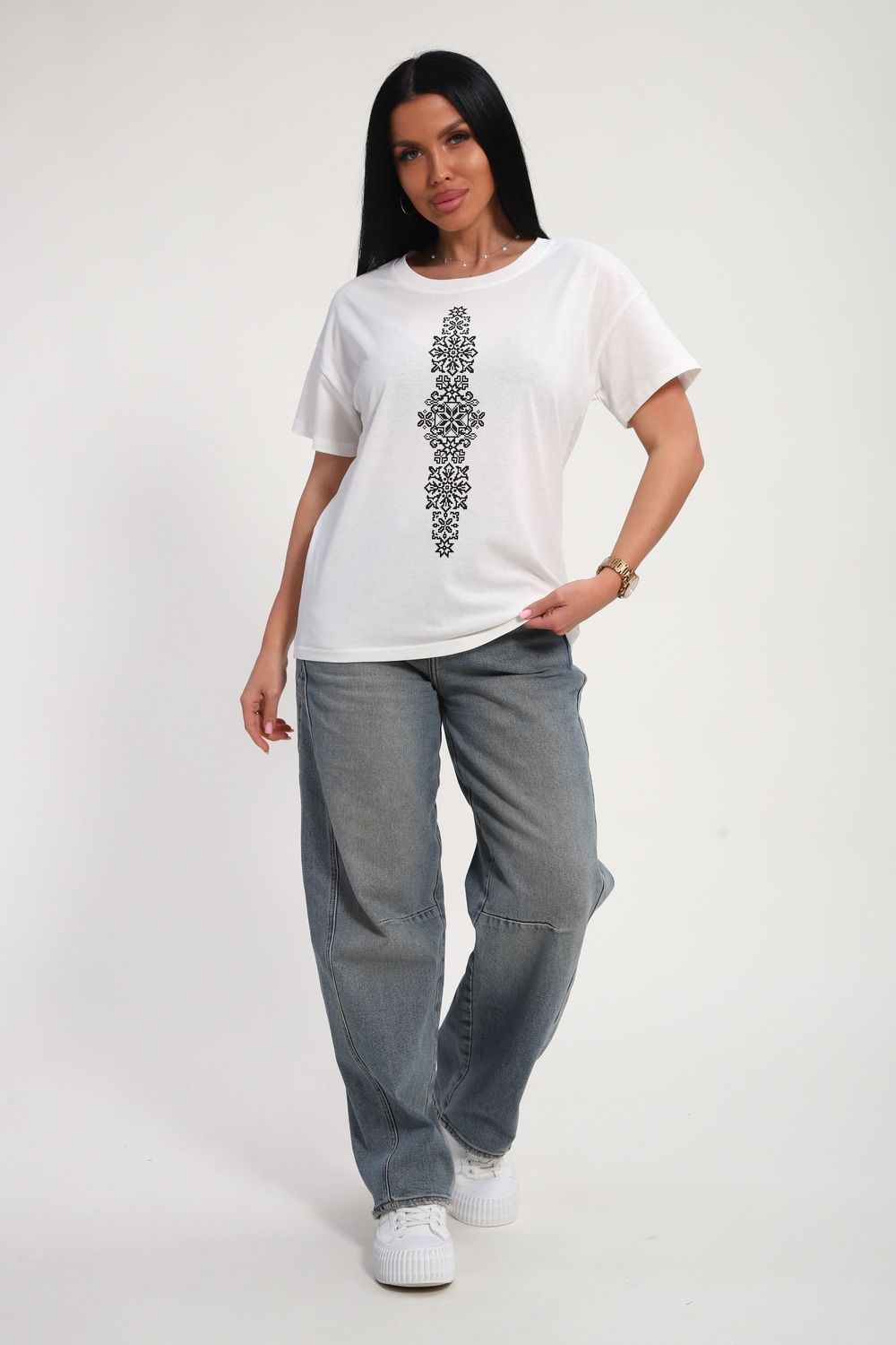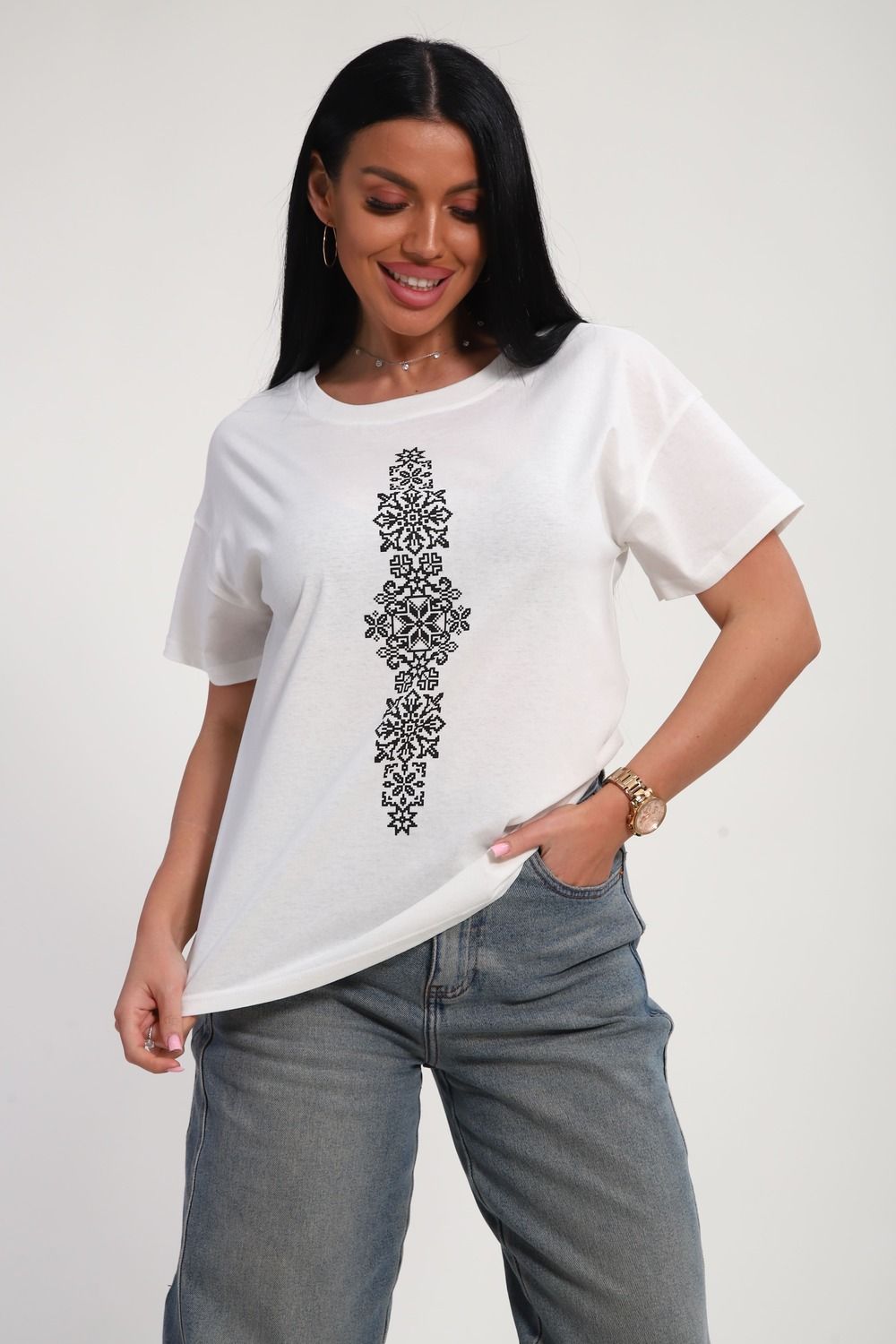 Футболка женская из гладкокрашенного трикотажа, хлопок 100%. Прямого силуэта, свободного облегания, горловина круглой формы. Рукав короткий. Низ изделия прямой. На полочке принт, шелкография.