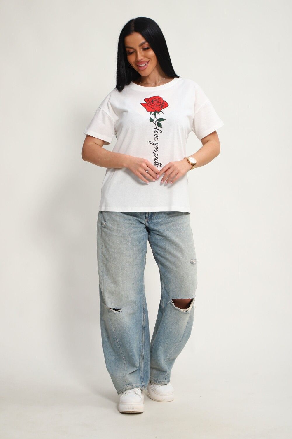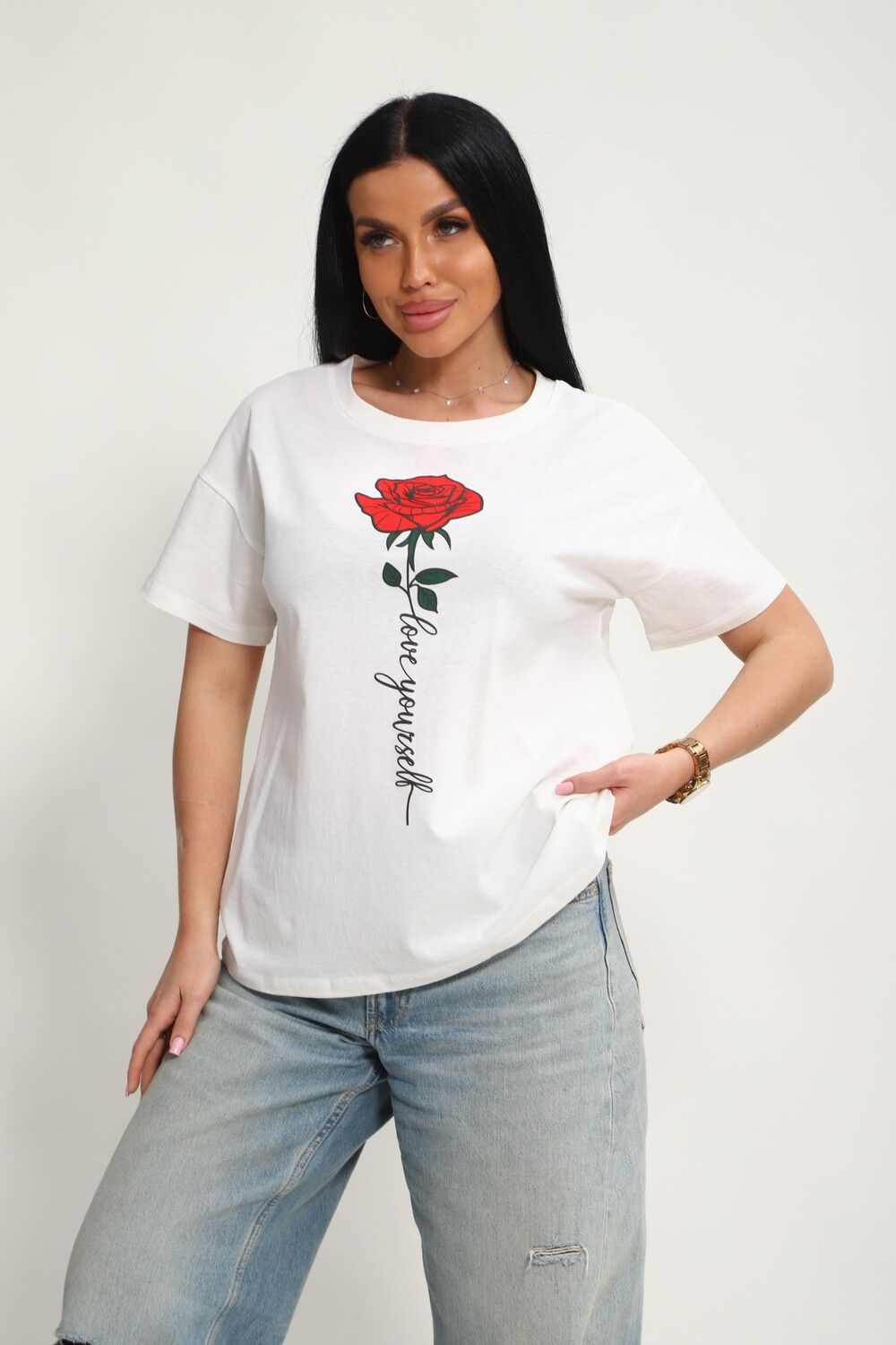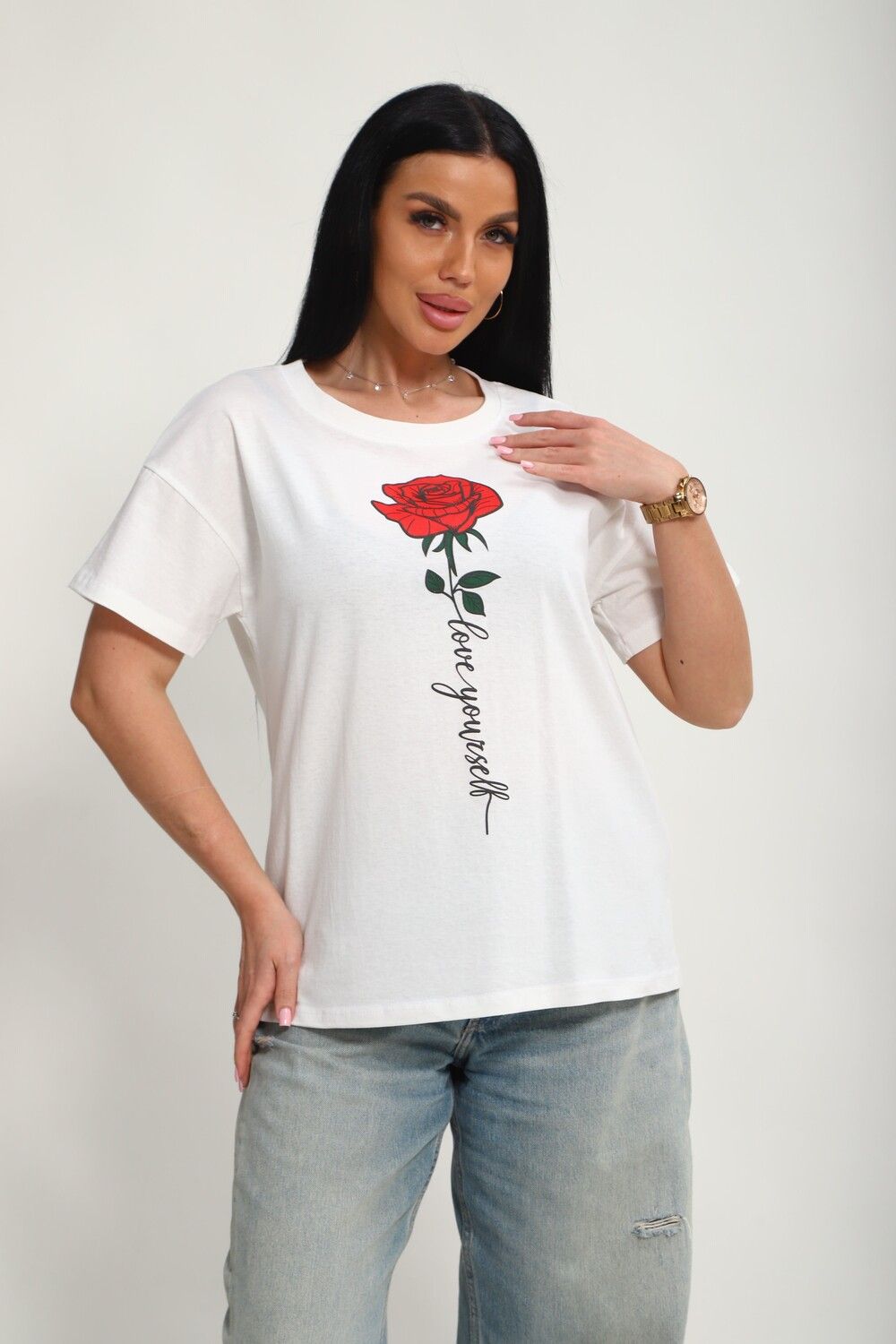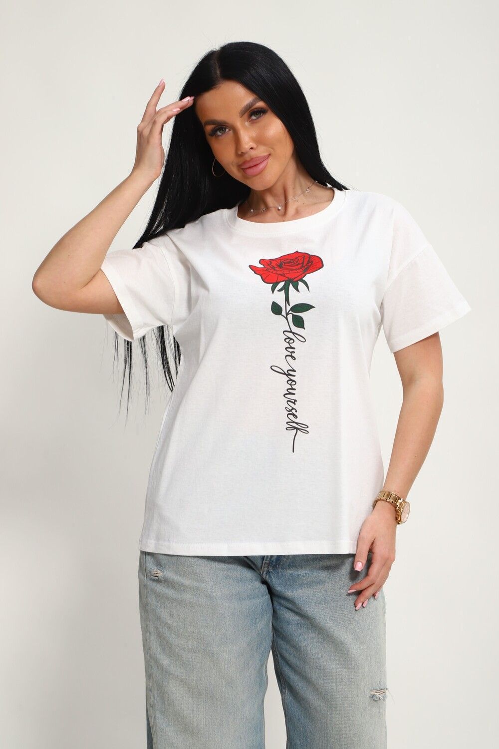 Футболка женская из гладкокрашеного трикотажа, хлопок 100%. Прямого силуэта, свободного облегания, горловина круглой формы. Рукав короткий. Низ изделия прямой. На полочке принт, шелкография.