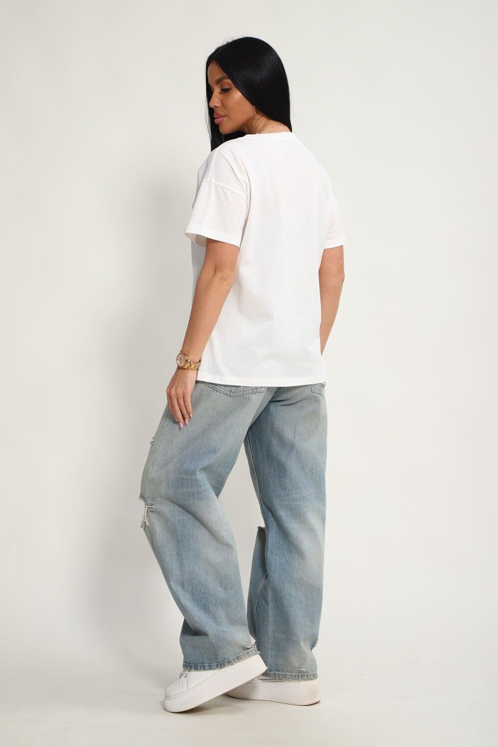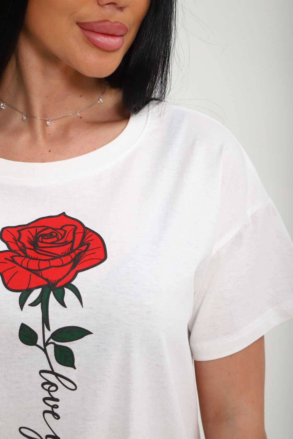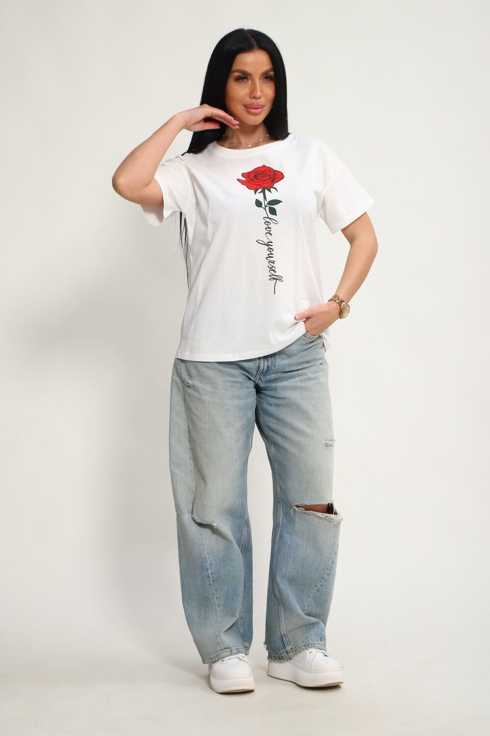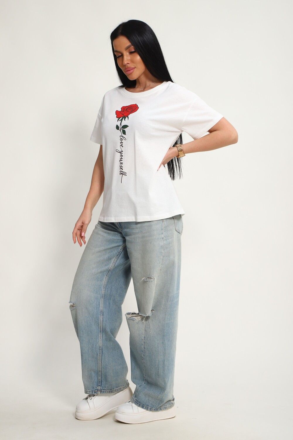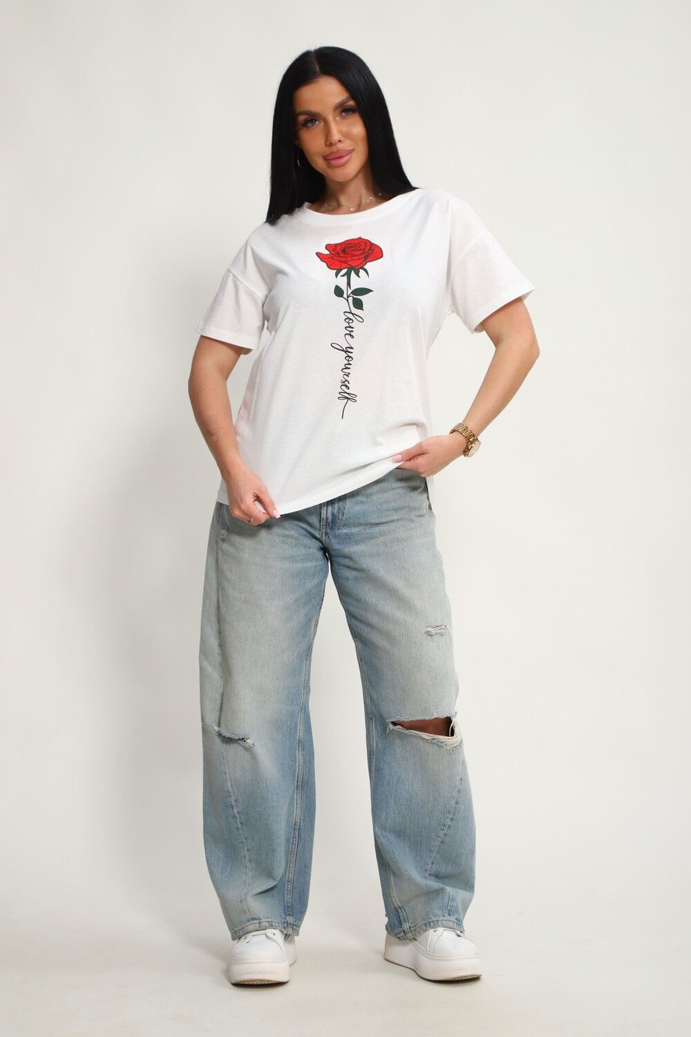 Футболка женская из гладкокрашеного трикотажа, хлопок 100%. Прямого силуэта, свободного облегания, горловина круглой формы. Рукав короткий. Низ изделия прямой. На полочке принт, шелкография.