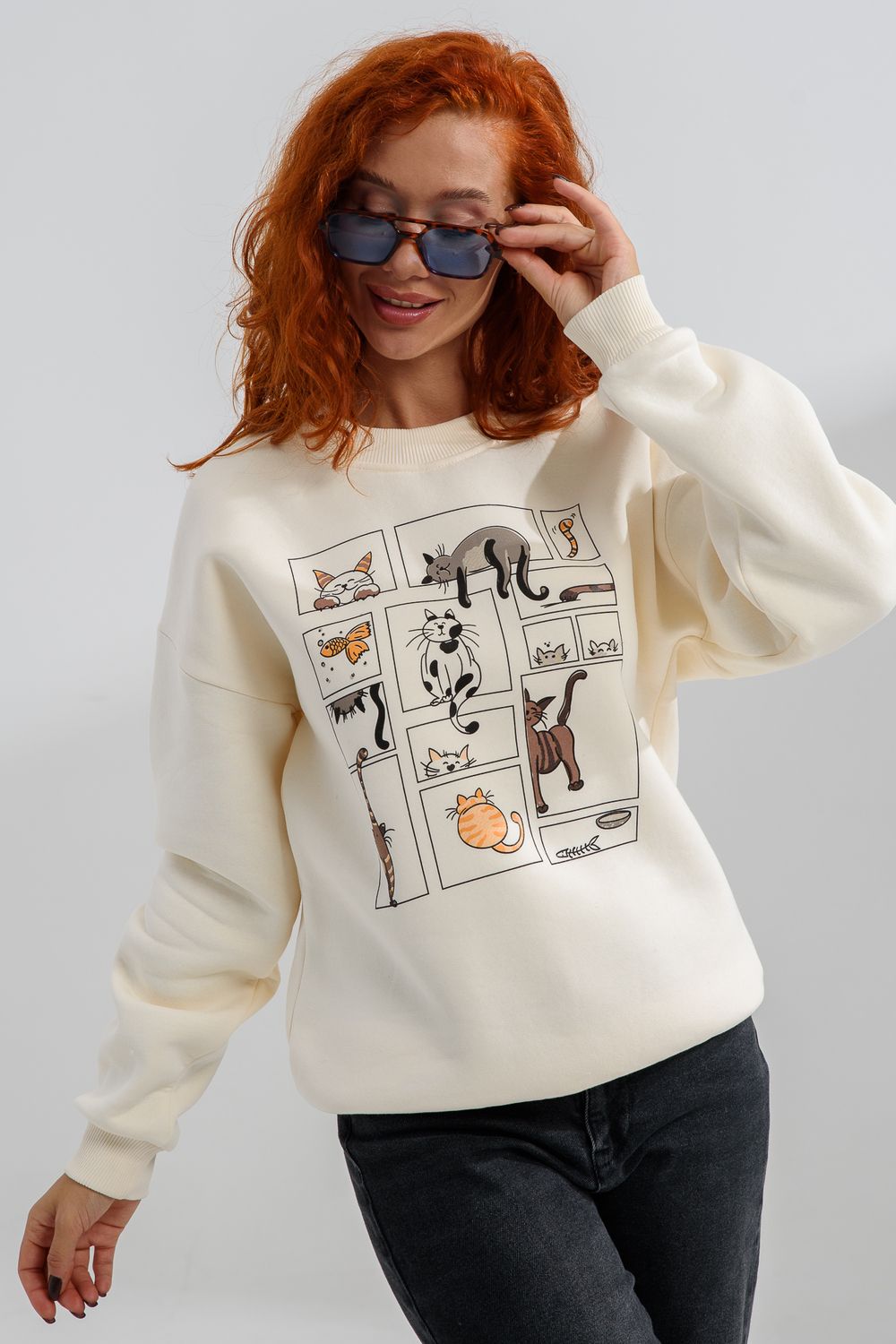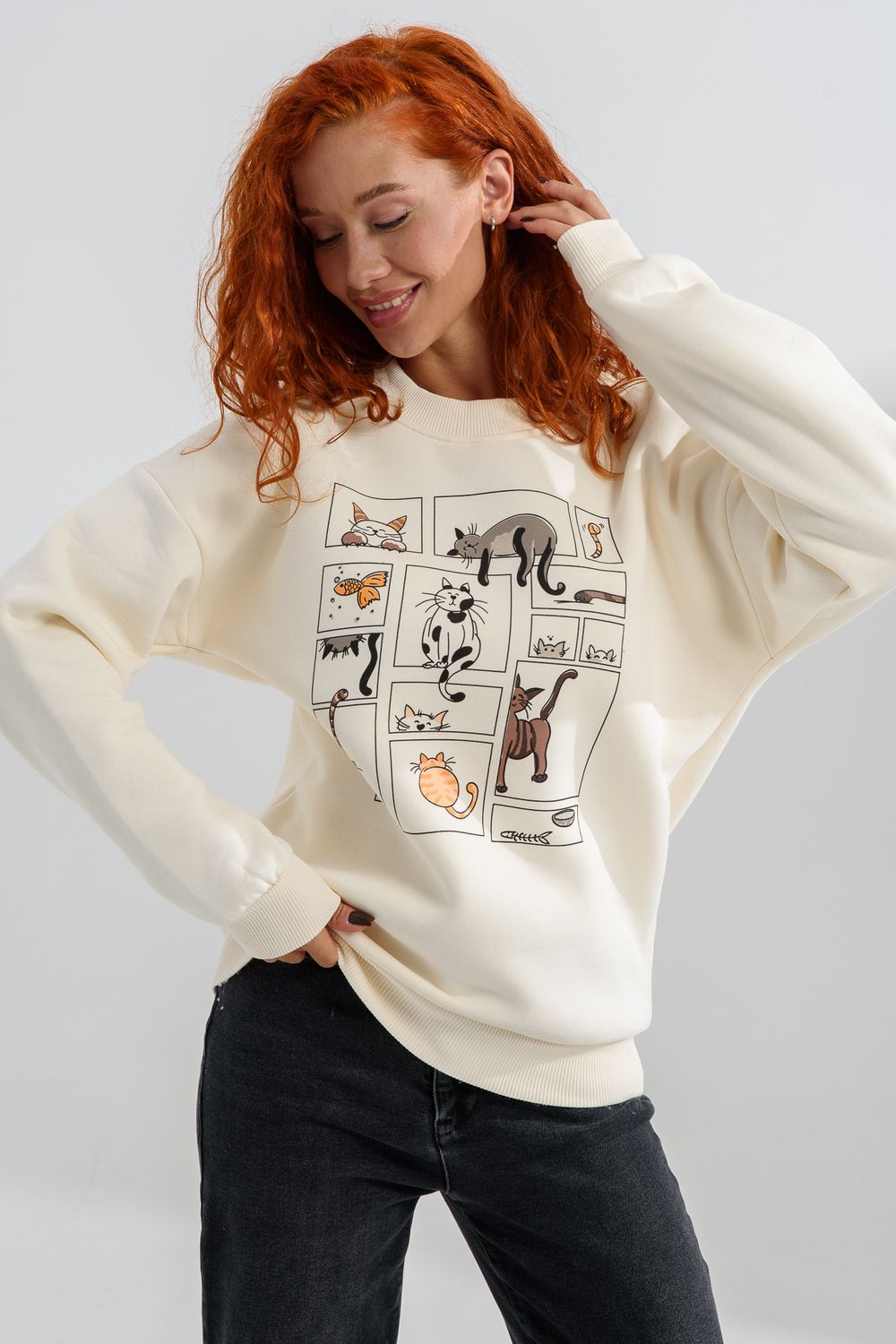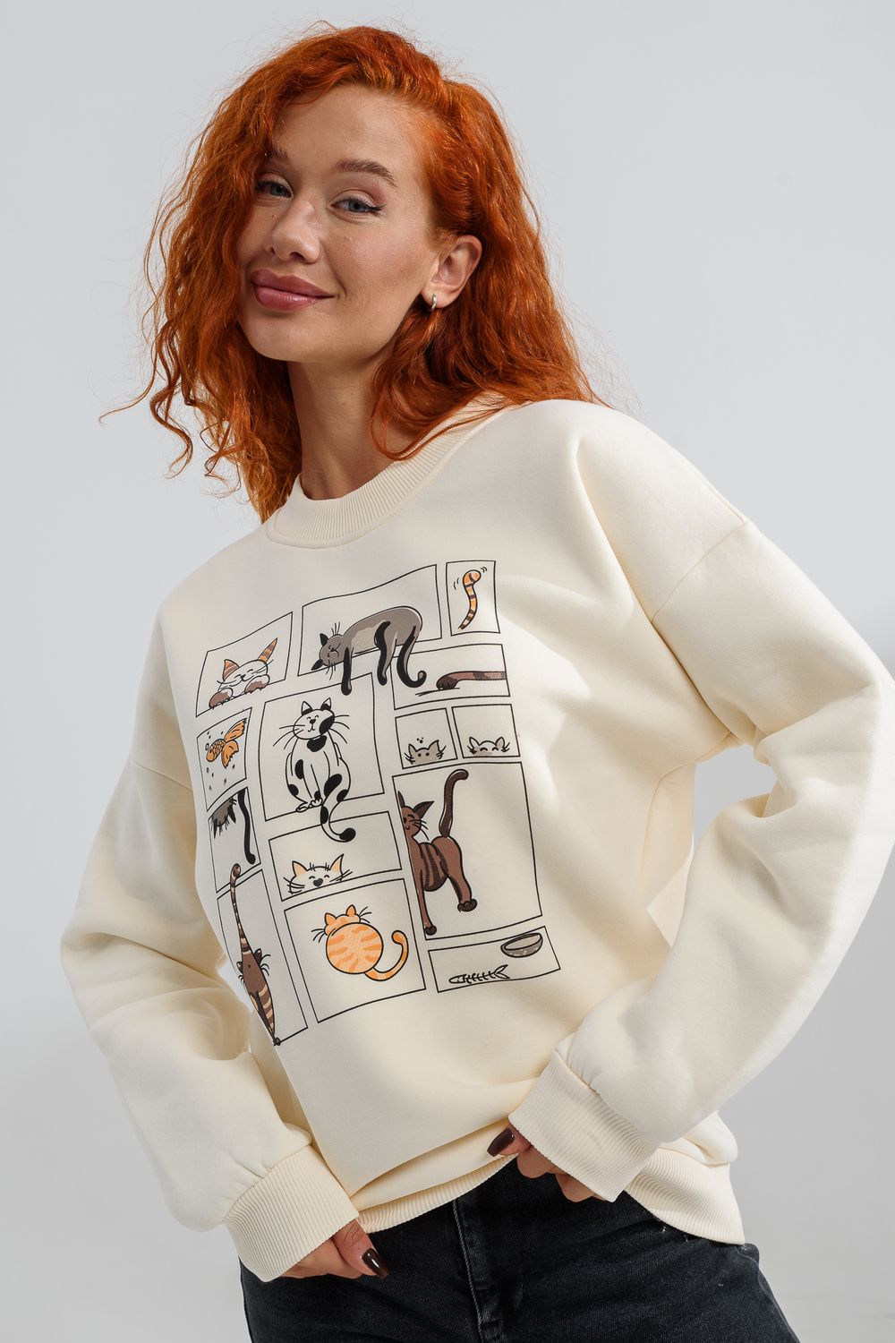 8569 женский свитшот оверсайз - молочный+коты