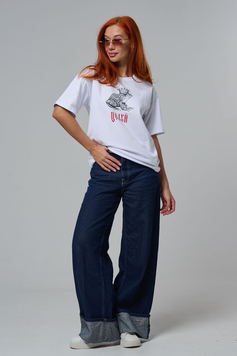 Представьте: вы — королева своего стиля, а на груди — императрица! Наша белоснежная oversize-футболка превращает повседневность в сказку с долей иронии. Мягкий хлопок дарит непревзойденный комфорт: дышащий, не липнет к телу и идеально сидит на любой фигуре, подчеркивая свободу и расслабленность.