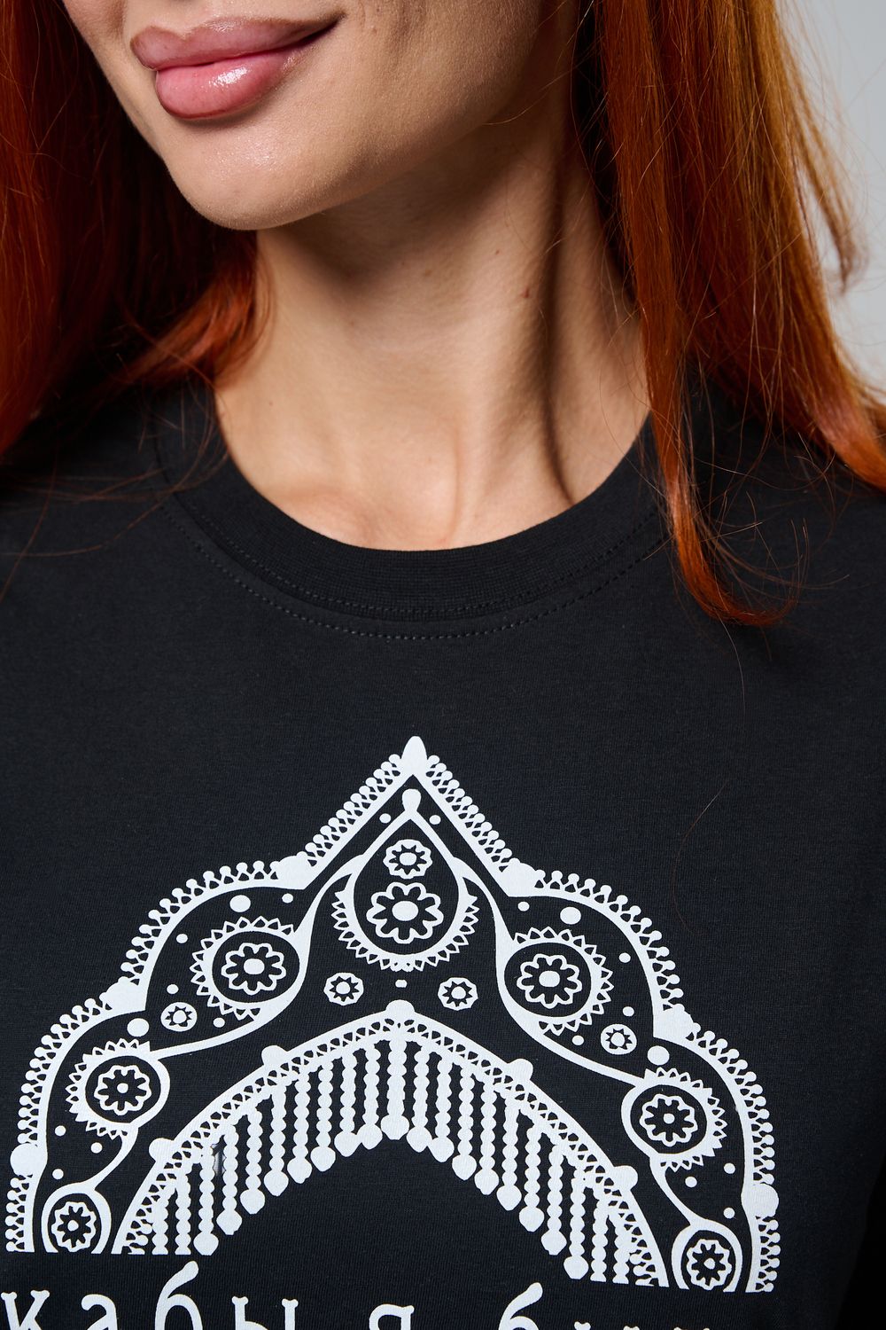 Футболка с принтом кокошник — стильная и оригинальная футболка женская с принтом в этническом стиле, вдохновлённая русской культурой и народными мотивами. На передней части изделия расположен декоративный орнамент в виде кокошника, выполненный в черно-белой цветовой гамме, символизирующий традиции, красоту и самобытность.