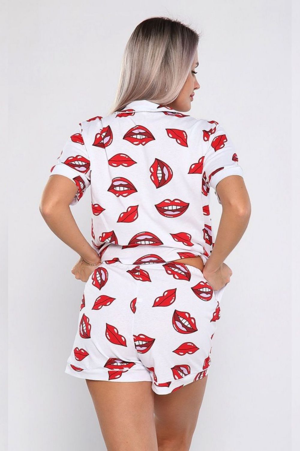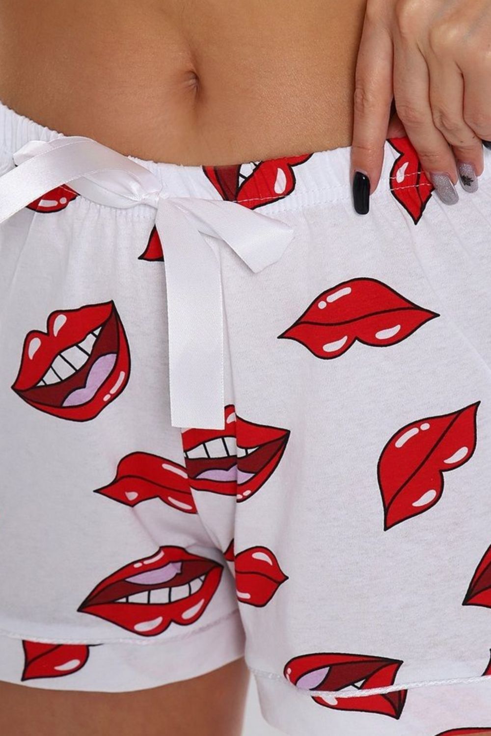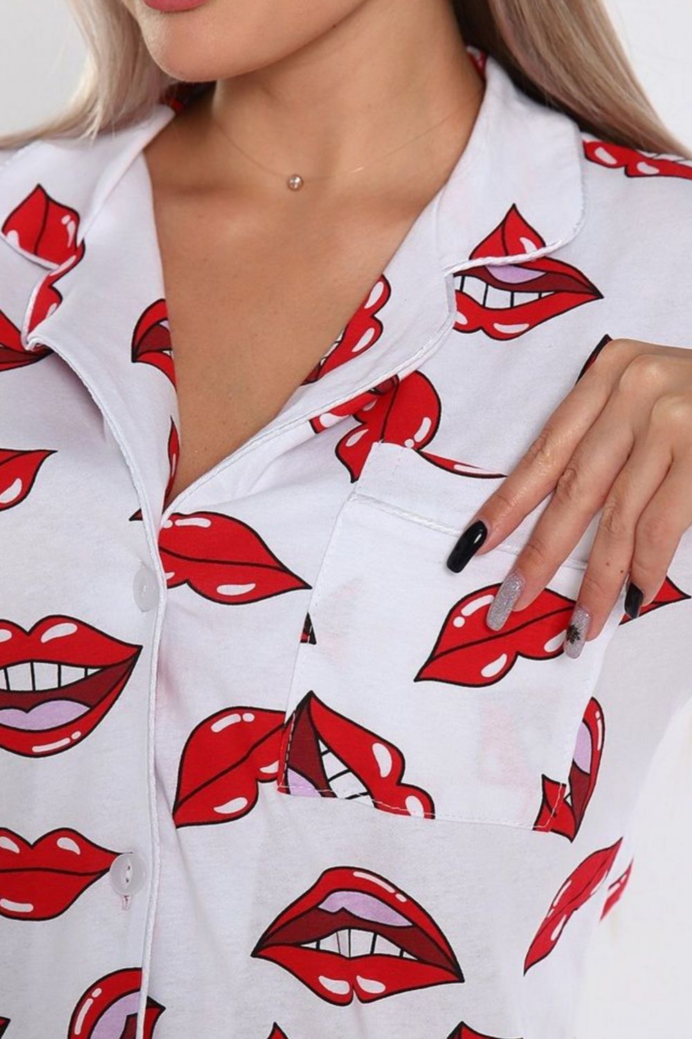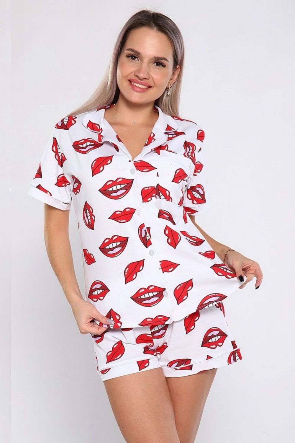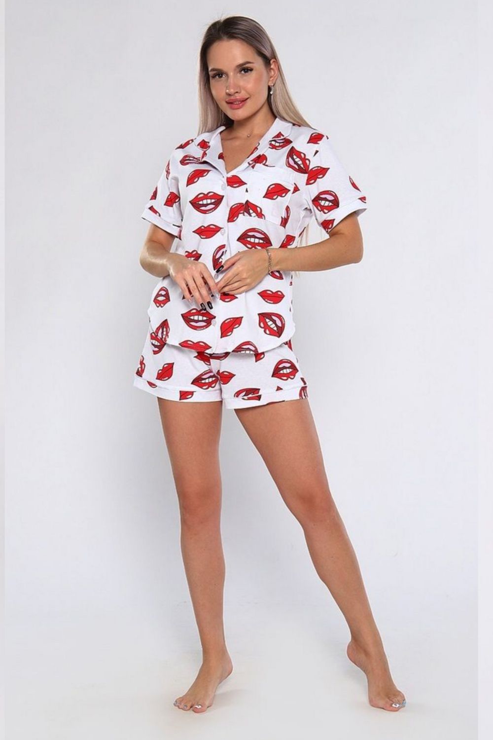 Женская пижама с шортами из хлопка – отличный выбор для комфортного сна и в то же время стильного отдыха. Модель включает в себя верх с коротким рукавом, который украшен пуговками и отложным воротником, что придает ей аккуратный и элегантный вид. Белоснежный цвет с оригинальным рисунком в виде губ добавляет игривости и женственности.
