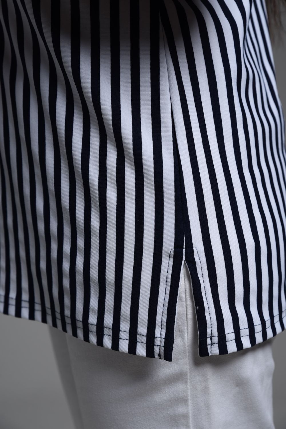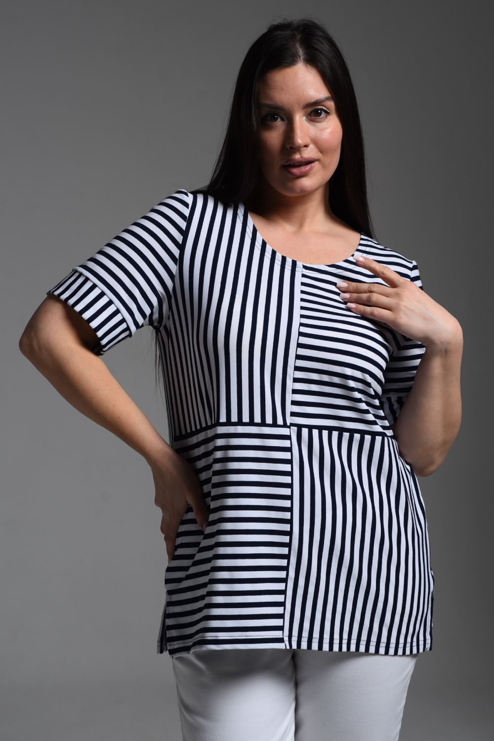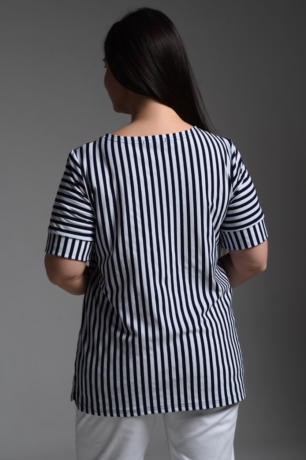 Футболка женская прямая, слегка расширенная к низу, из ткани "в полоску". Горловина округлая. Рукав короткий с манжетой. Полочка состоит из четырех частей, где полоса расположена в шахматном порядке. В боковых швах разрезы.