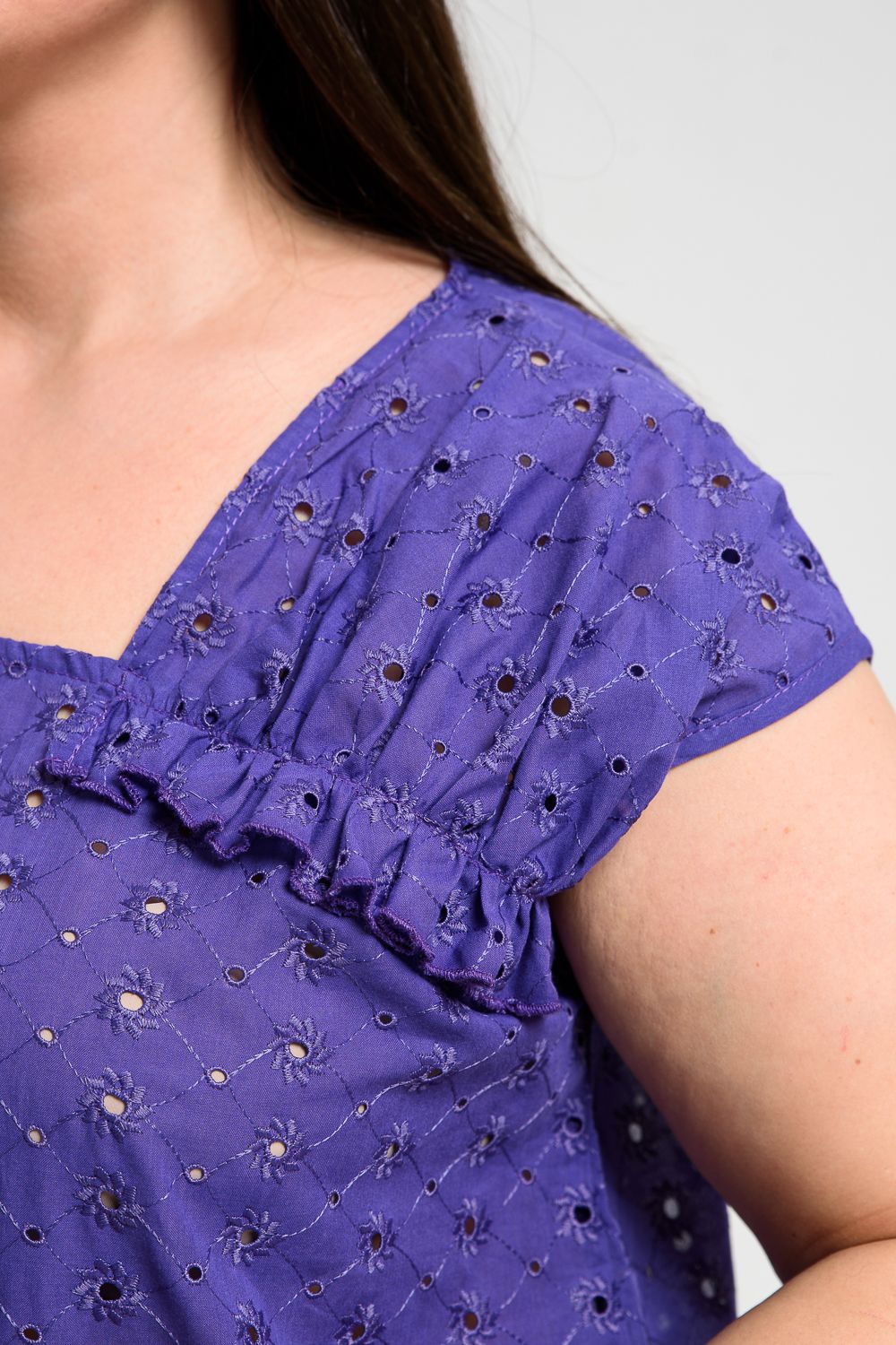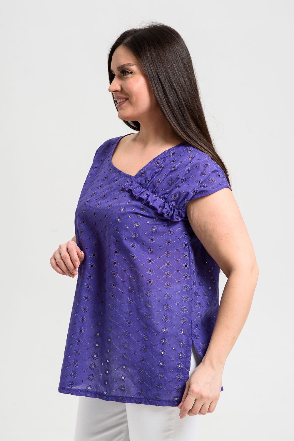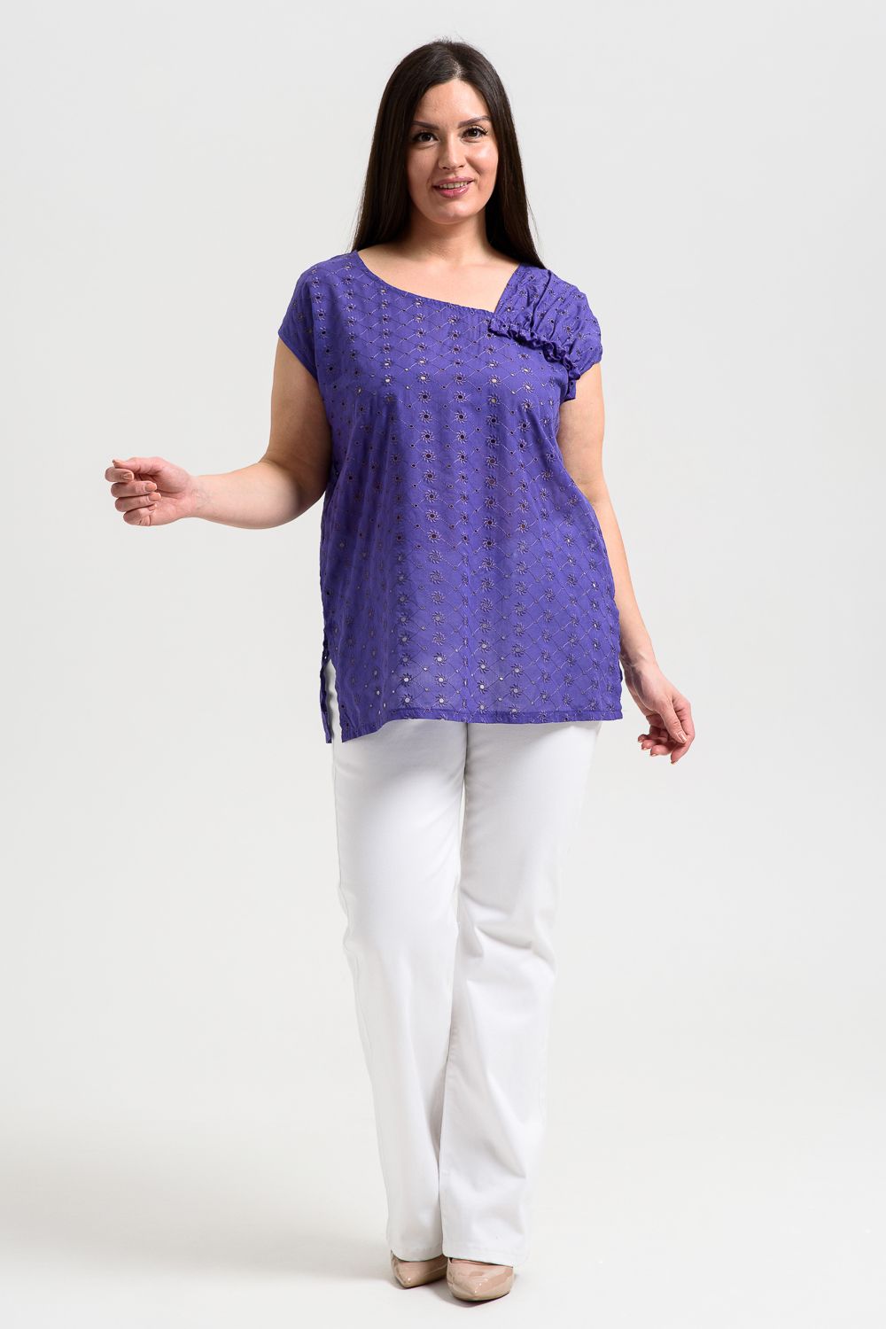 Майка женская, свободная, горловина асимметричная, нижняя часть левой кокетки полочки собрана, образуя рюшу. В боковых швах разрезы. Легкая, оригинальная майка их х/б ткани хорошее дополнение вашего летнего гардероба.