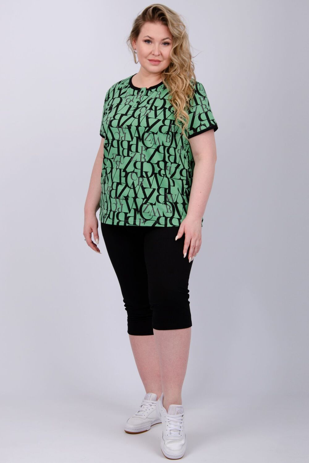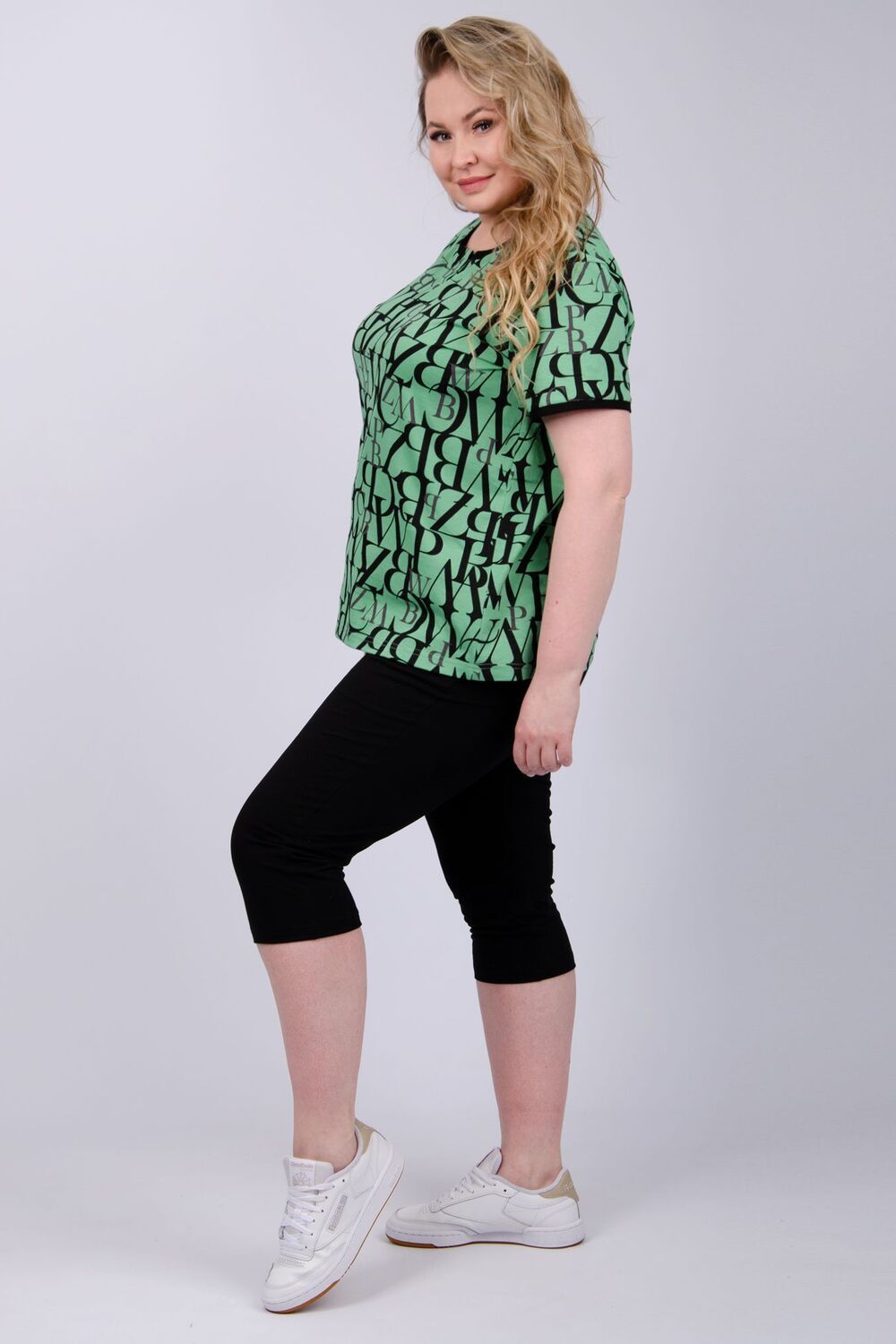 Костюм женский состоит из футболки и бриджей. Футболка с коротким рукавом, бриджи с карманами. На полочке принт.