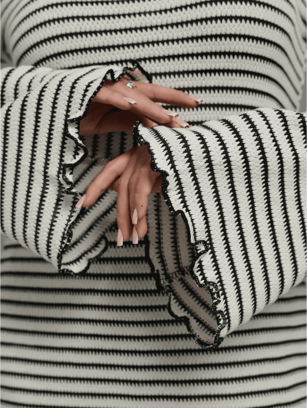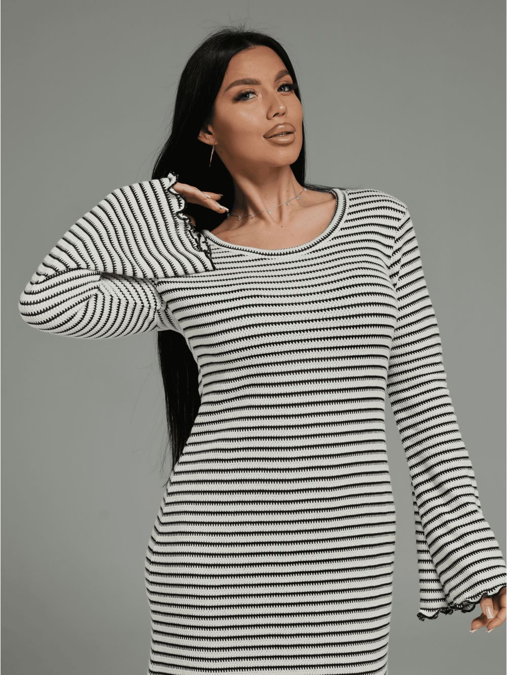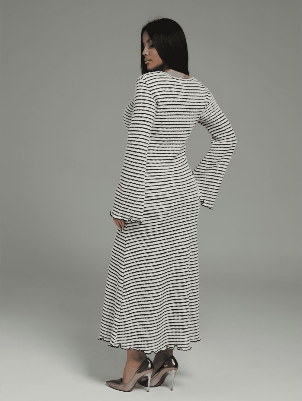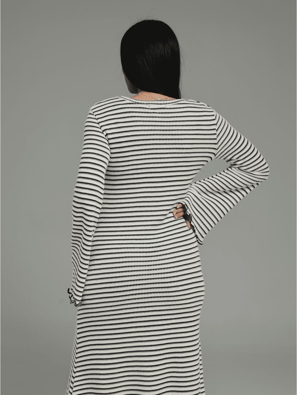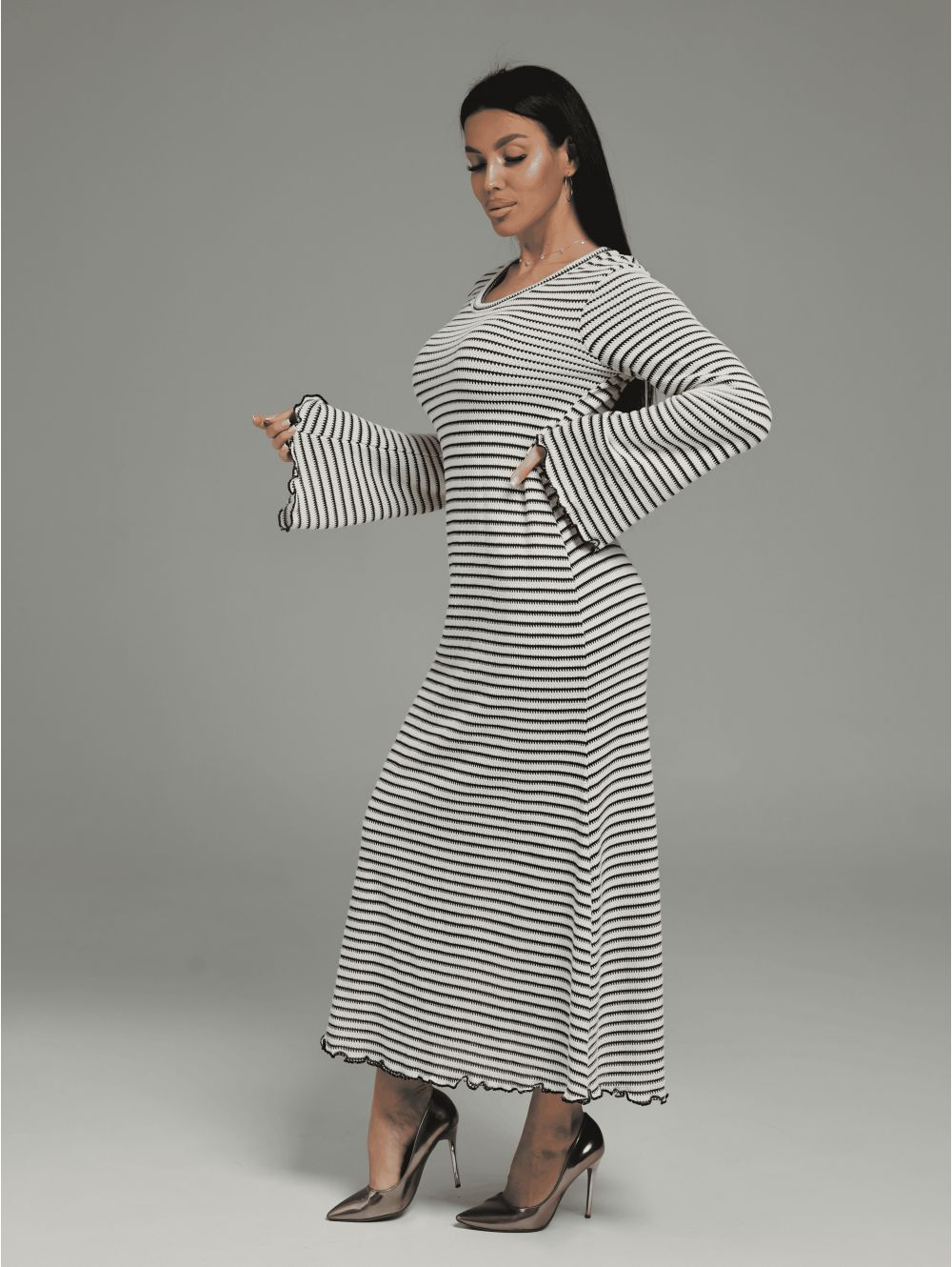 Женственный силуэт: Приталенный крой мягко облегает талию и плавно расклешивается к низу, создавая изящный и романтичный образ. Длинный расклешенный рукав добавляет динамики и элегантности.