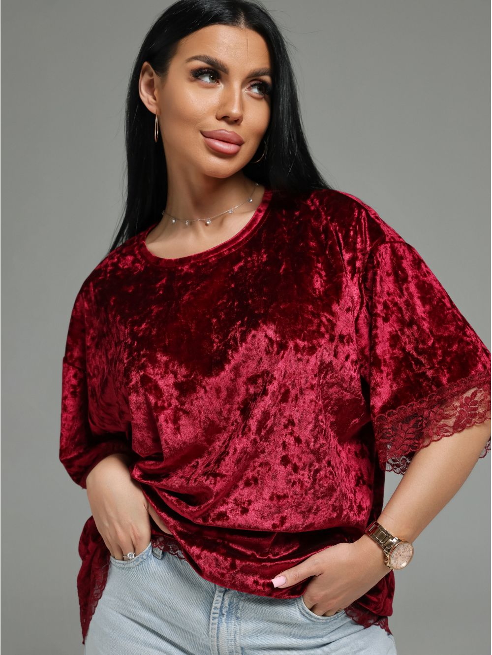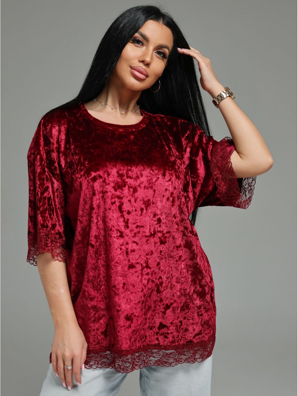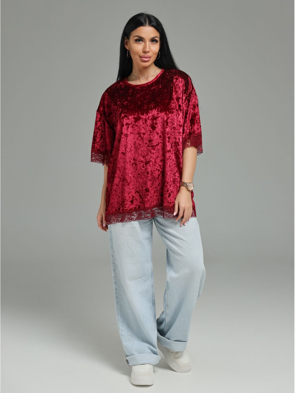 Женская футболка оверсайз из бархата с кружевной отделкой.