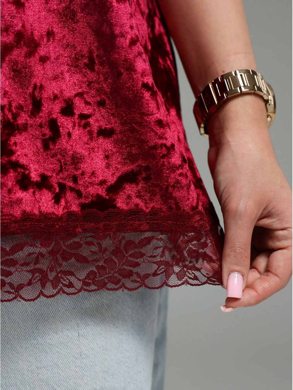 Кружево, настроченное по низу рукавов и низу футболки. Эта деликатная деталь создаёт изящный контраст с плотной текстурой бархата.