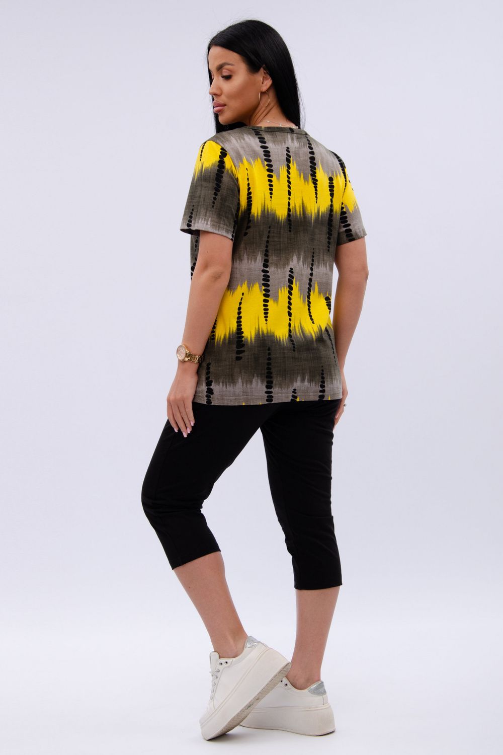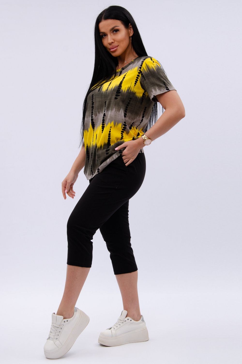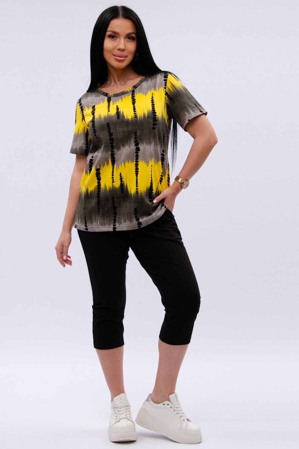 Женский костюм из футболки и бриджей — отличный выбор для дачного сезона и прогулок. Бриджи черного цвета из 100% хлопка обеспечивают комфорт и свободу движения, что особенно важно для активного отдыха на свежем воздухе или дома.