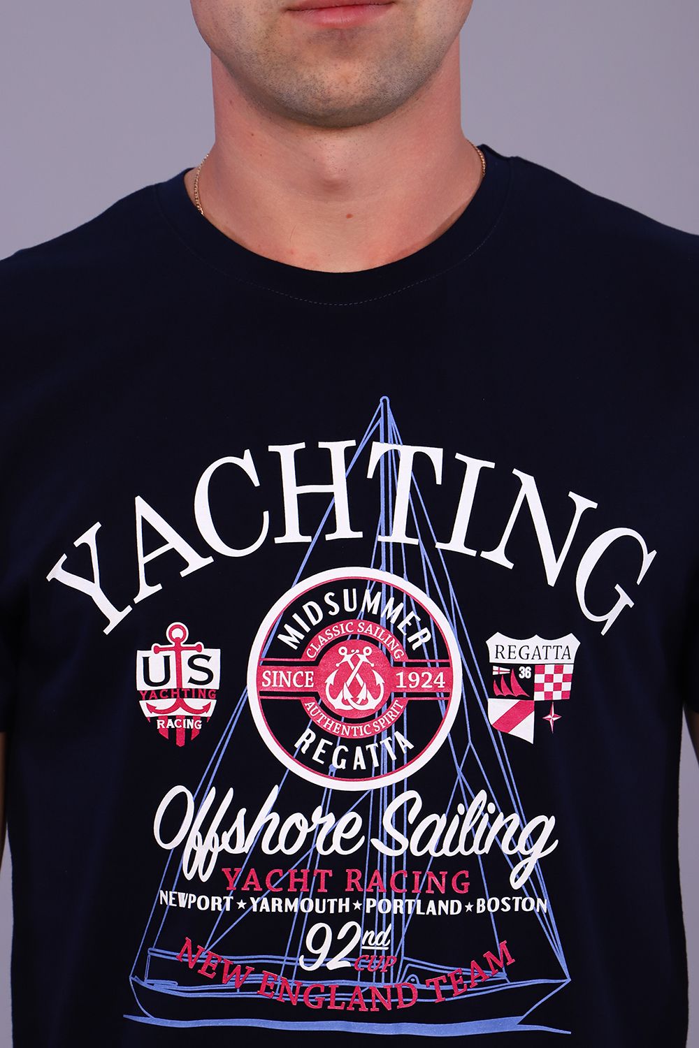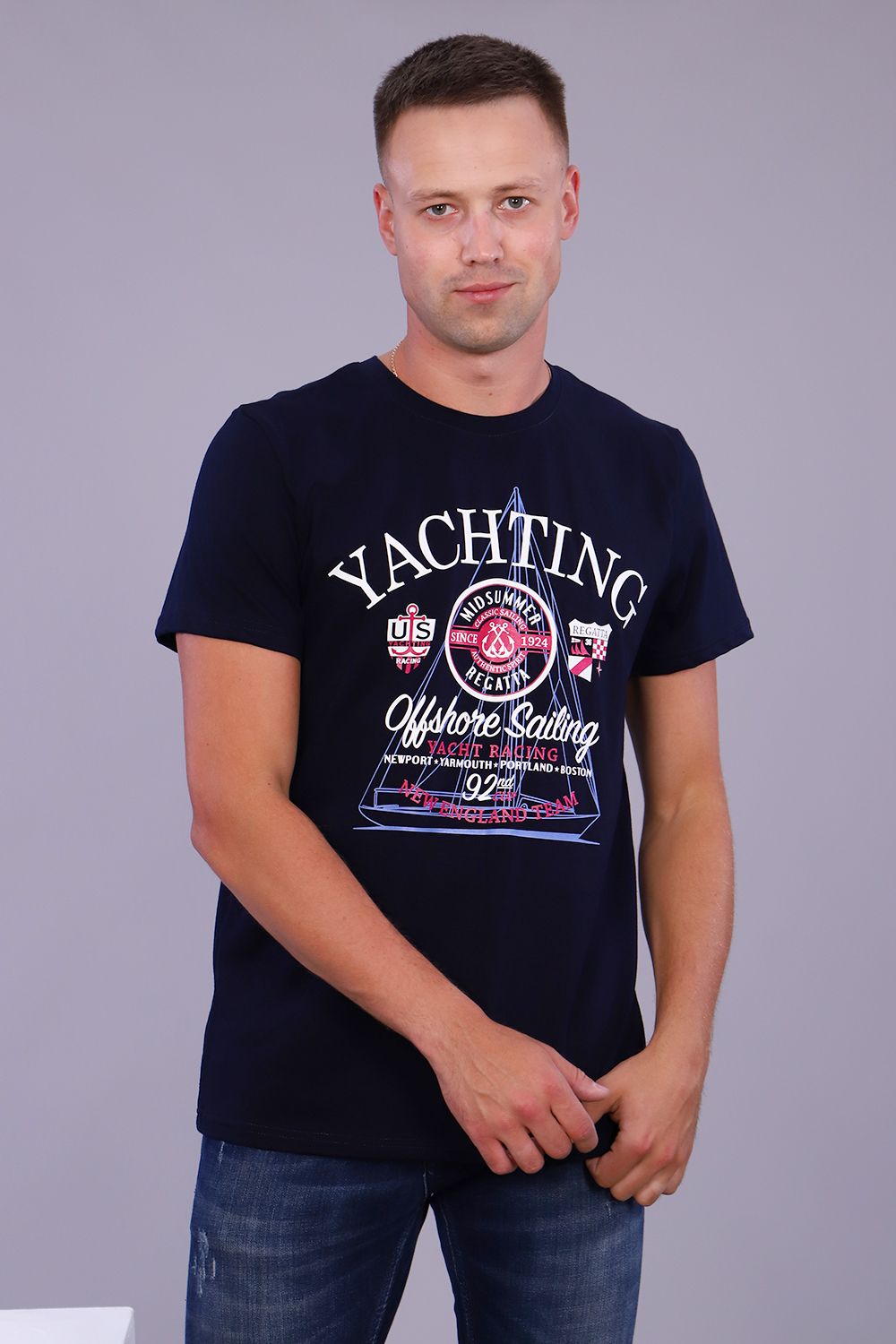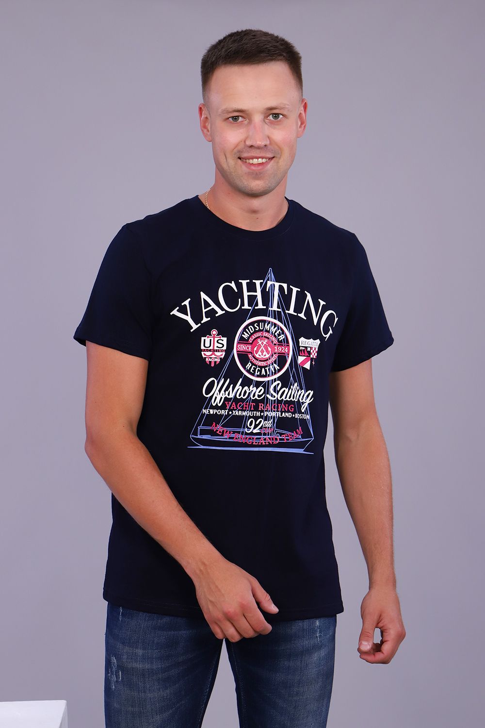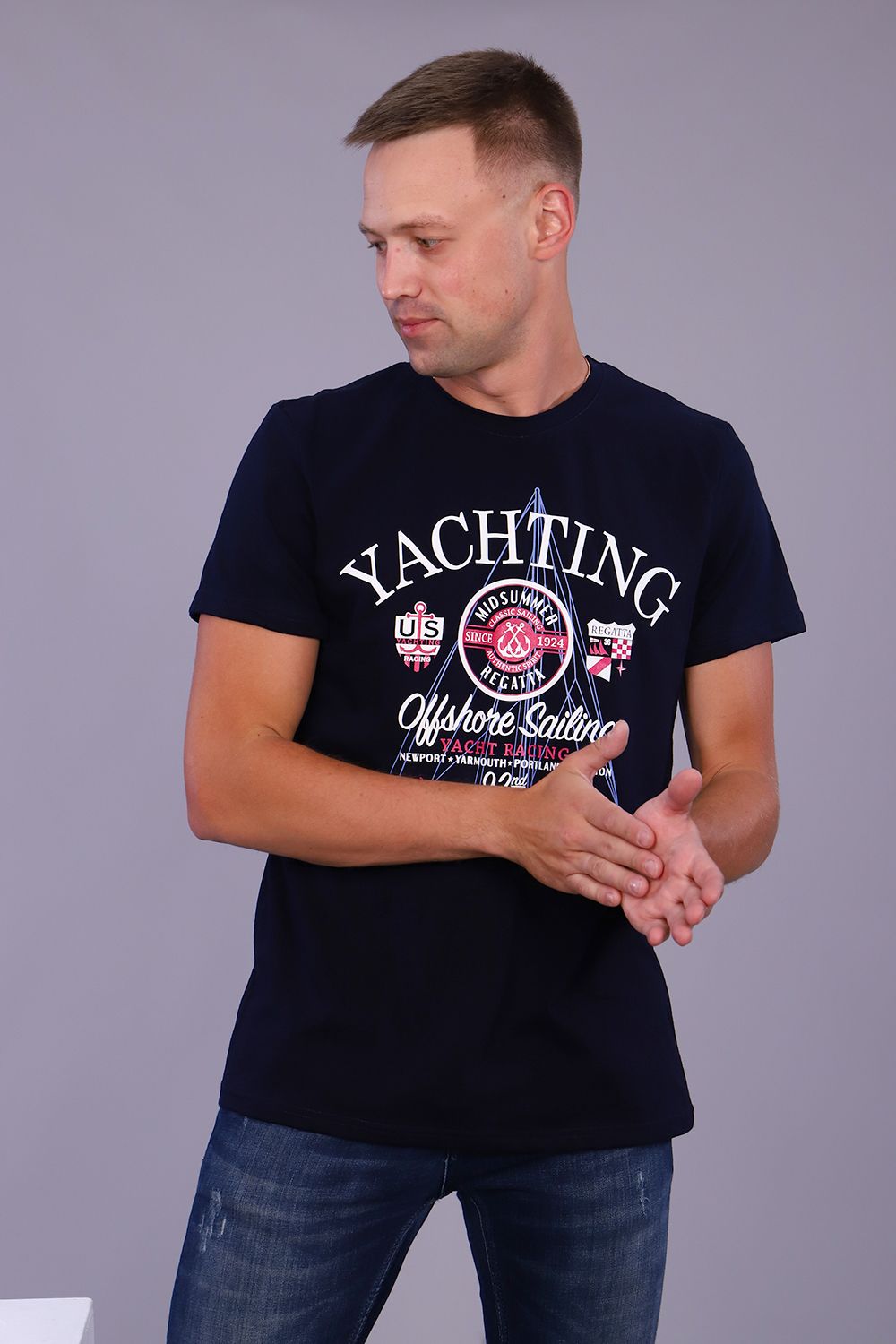 Футболка мужская с коротким рукавом. Данная модель выполнена из трикотажного полотна кулирка (хлопок 100%). На полочке присутствует принт в области груди. Рукава короткие, горловина круглая обработана кантом.