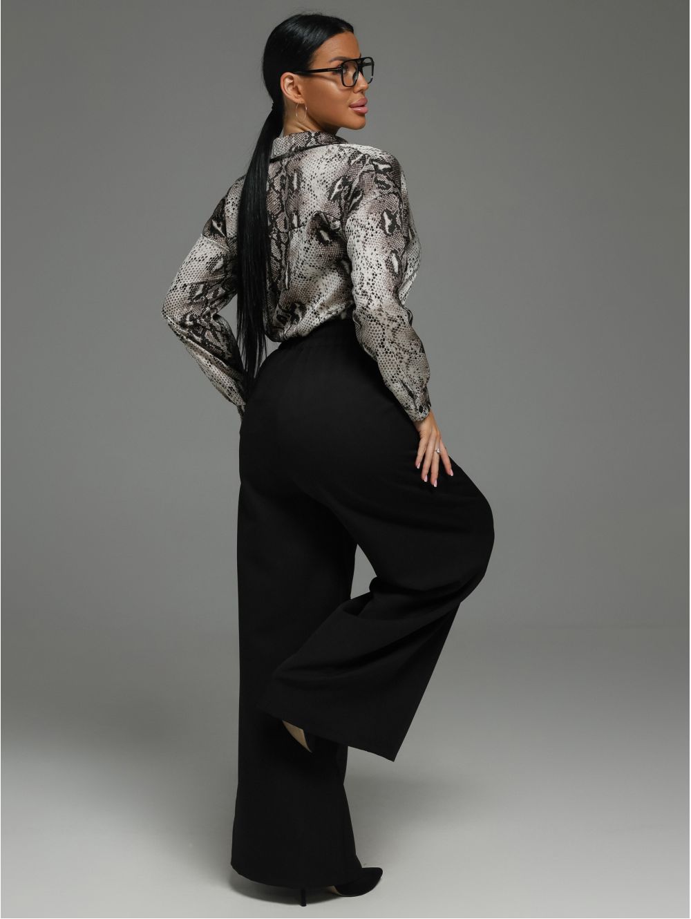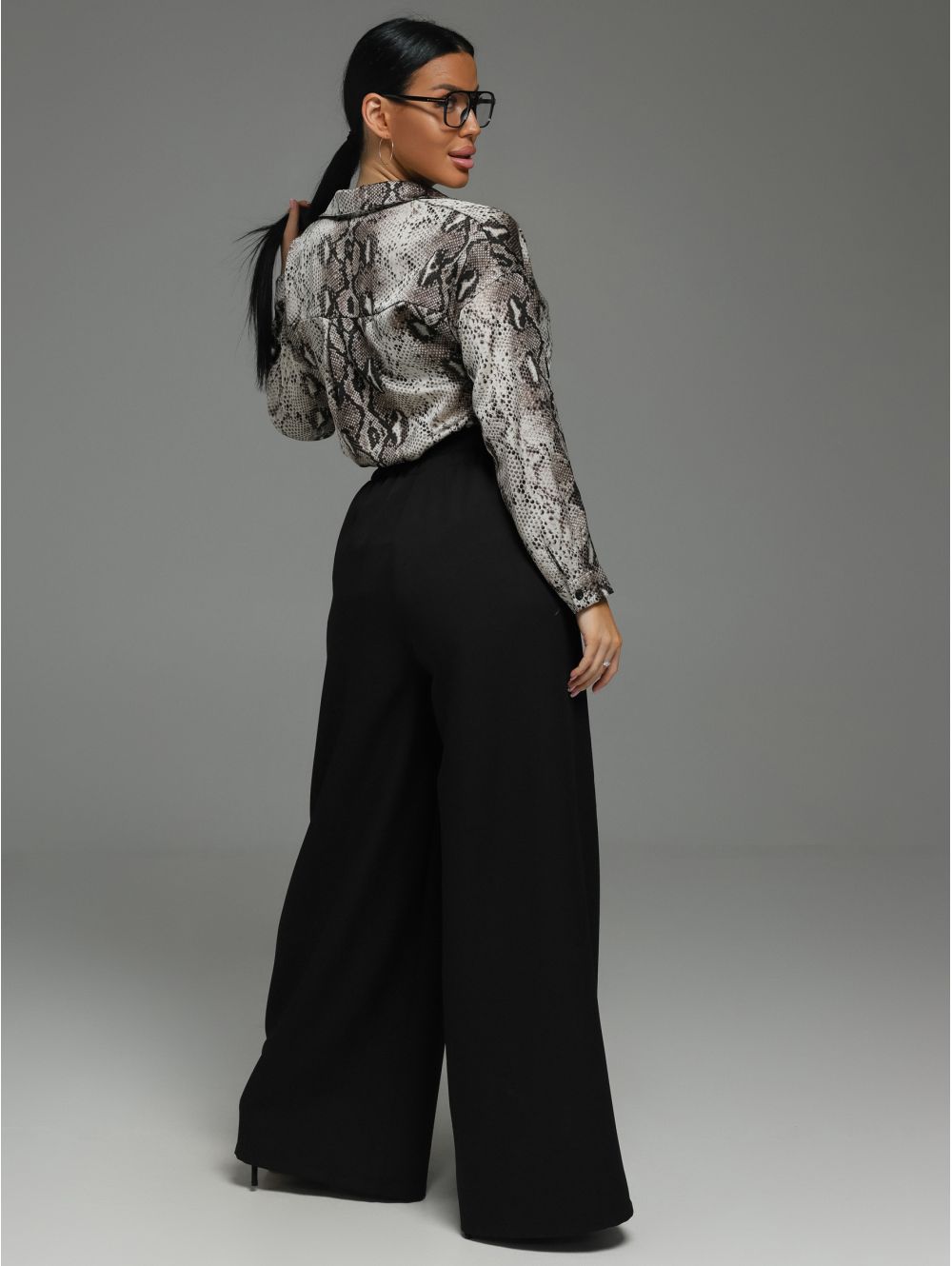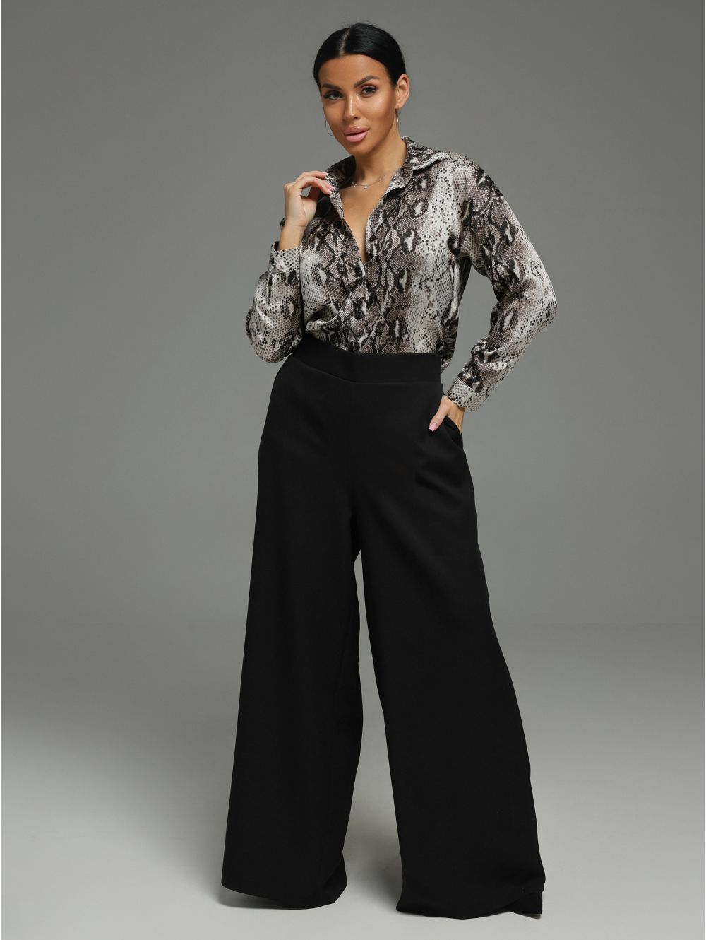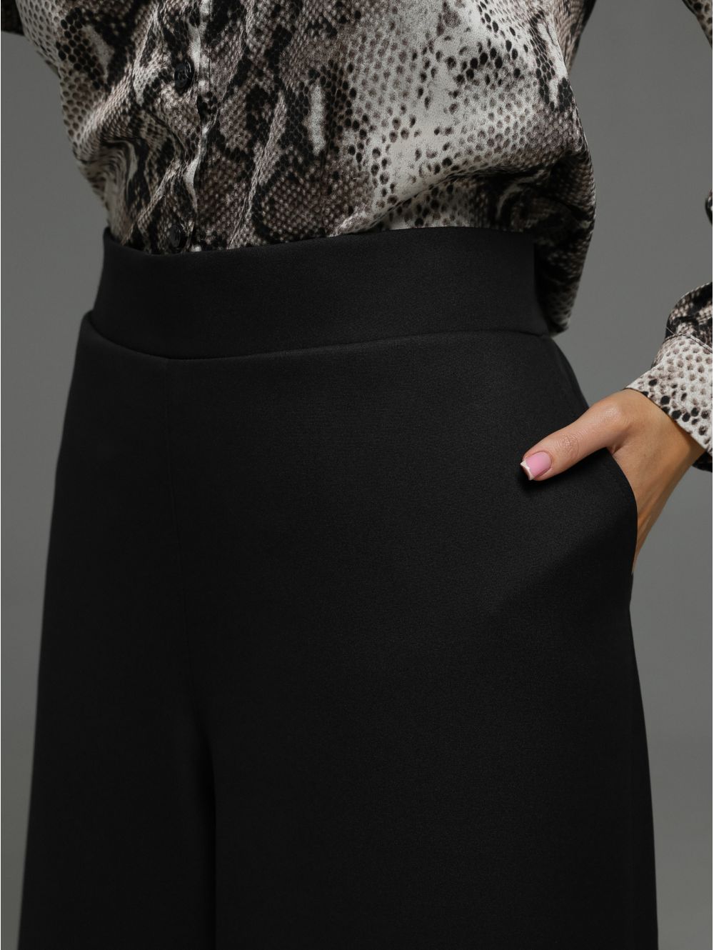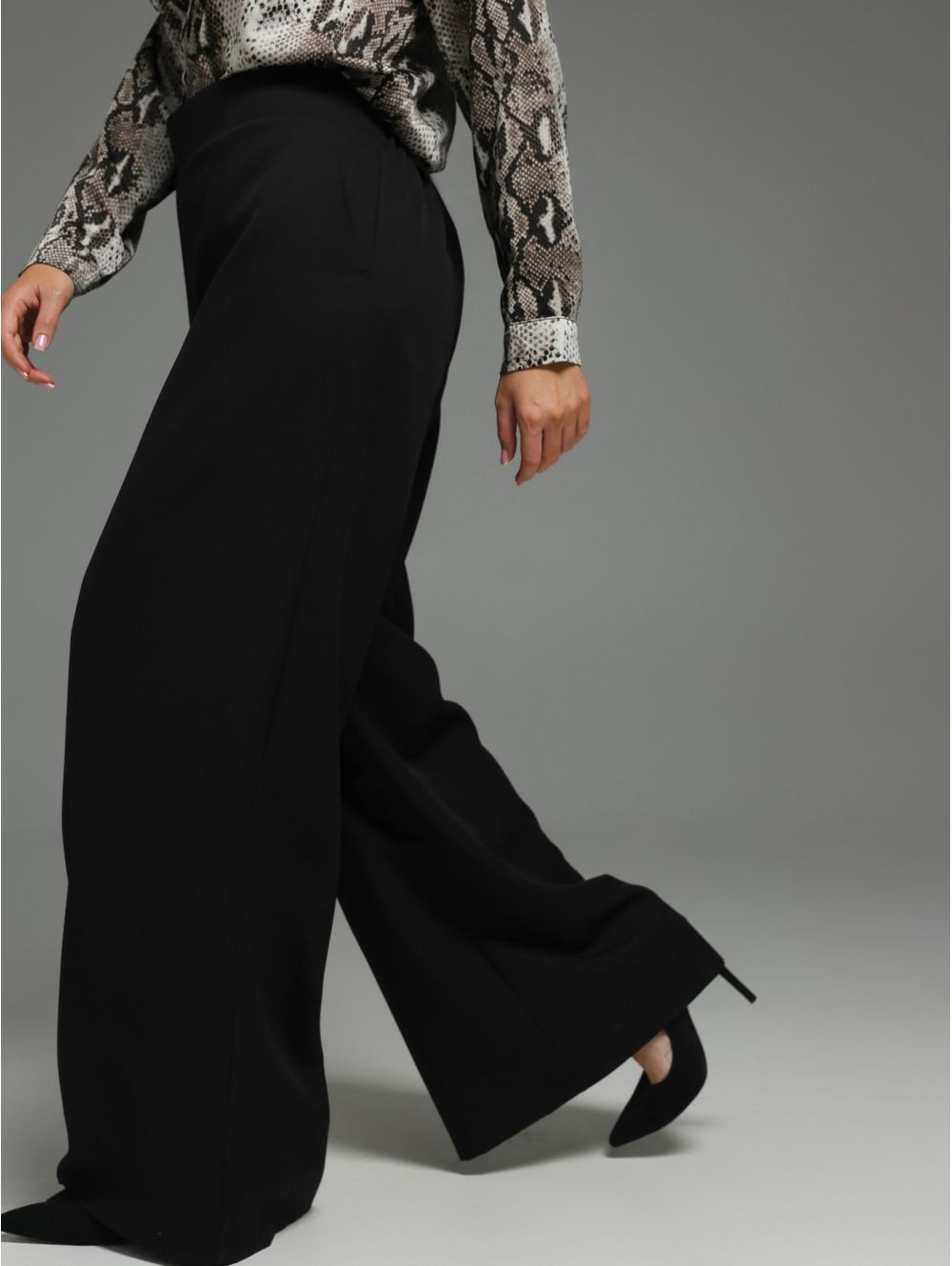 Брюки женские широкие с притачным поясом. Передние половинки с карманами с отрезным бочком с наклонным входом.