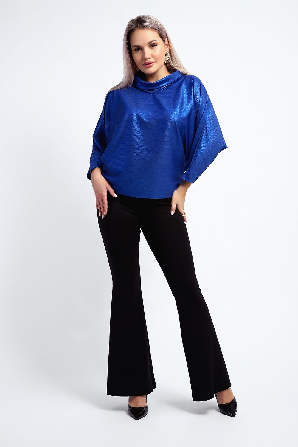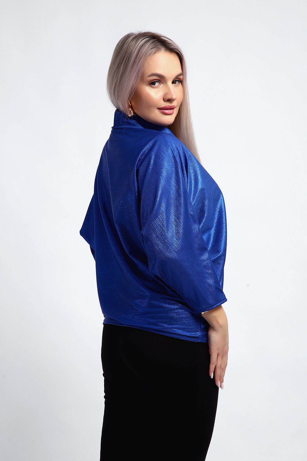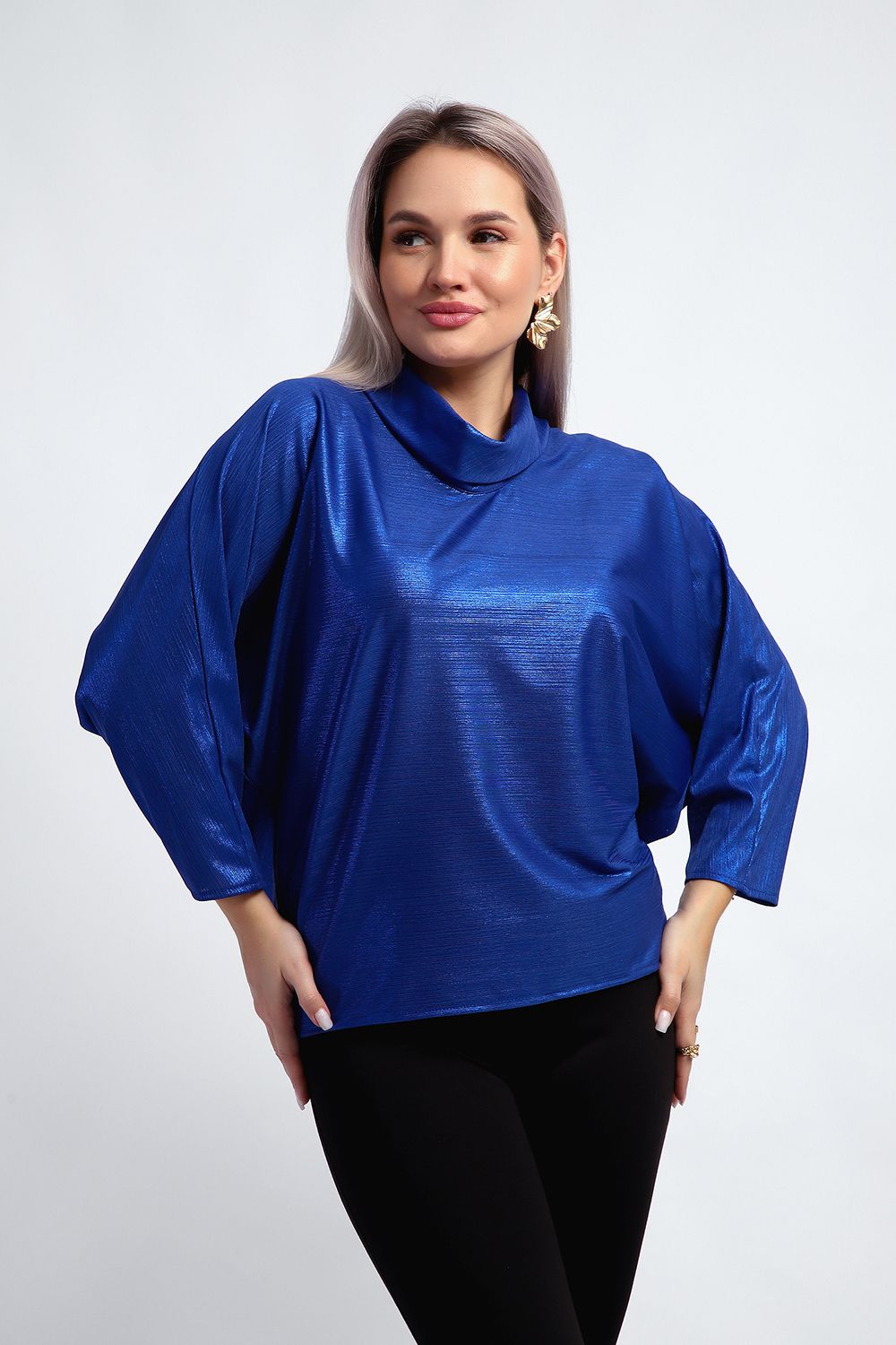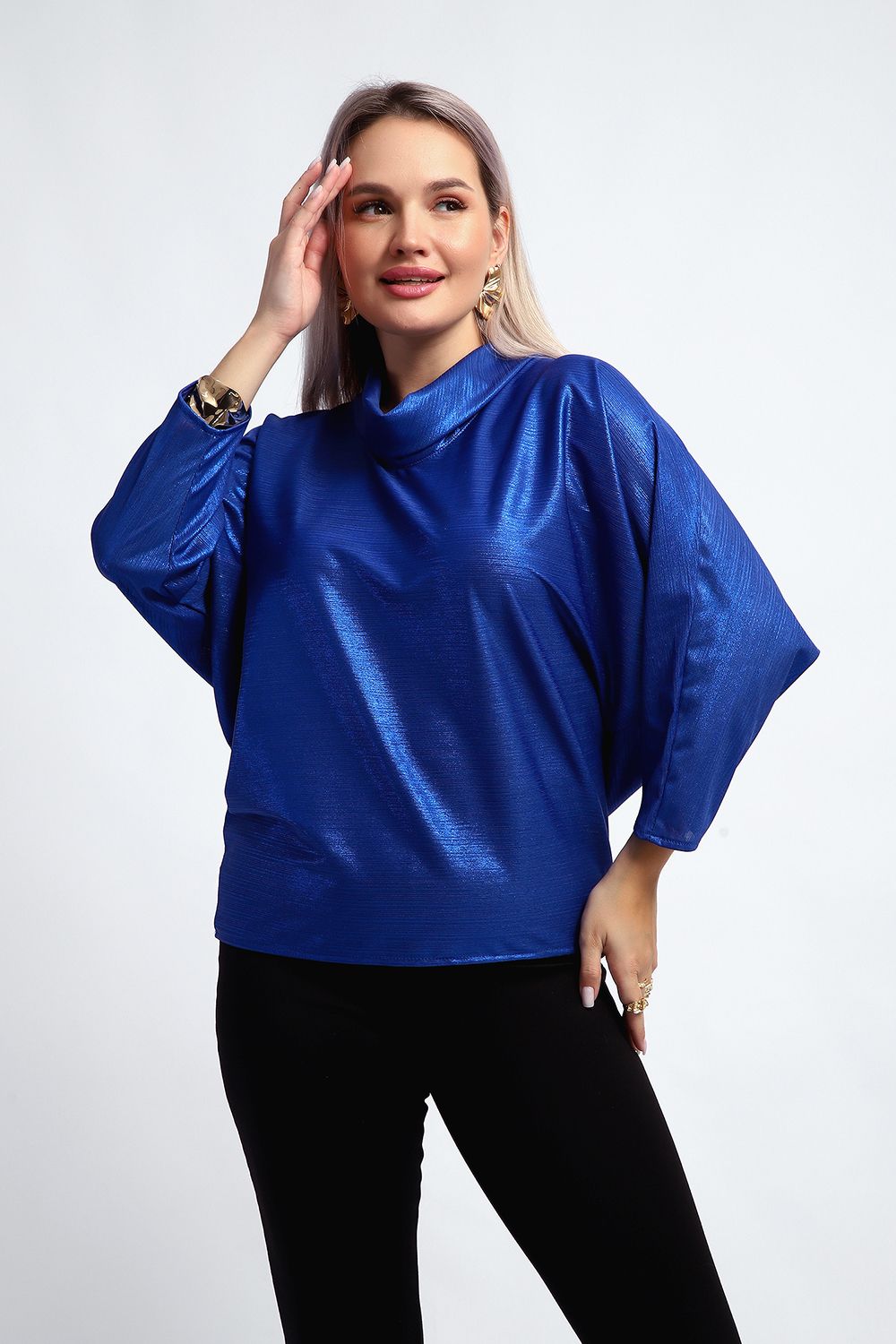 Нарядная и эффектная блузка из ткани шифон- металлик. Ткань тонкая, слегка прозрачная, имеет красивый металлический блеск, переливаясь на складках изделия, не мнется и отлично драпируется. Свободный крой и рукав "летучая мышь" делает эту блузку универсальной, подходящей на любую фигуру. Длина рукава 3/4, воротник- хомут придает женственности образу. Блузка слегка заужена к низу, чтобы на бедрах образовался напуск. С помощью этой блузки можно создать и праздничный, и деловой, и повседневный образ, комбинировать с юбкой и брюками. Широкий размерный ряд - с 48 по 62 размеры.