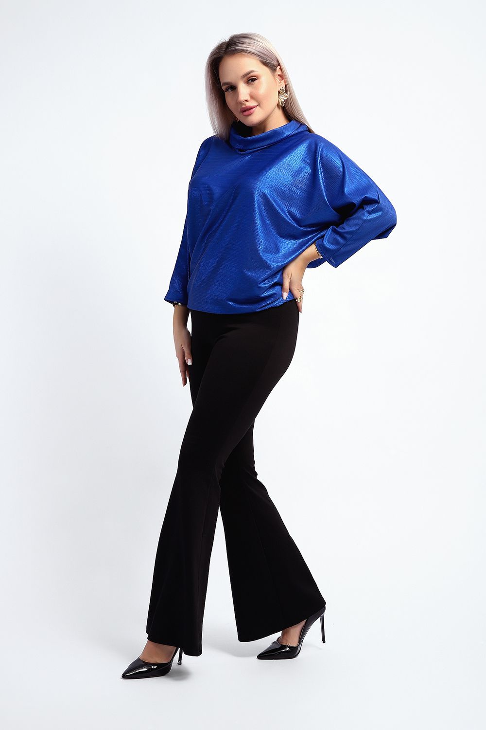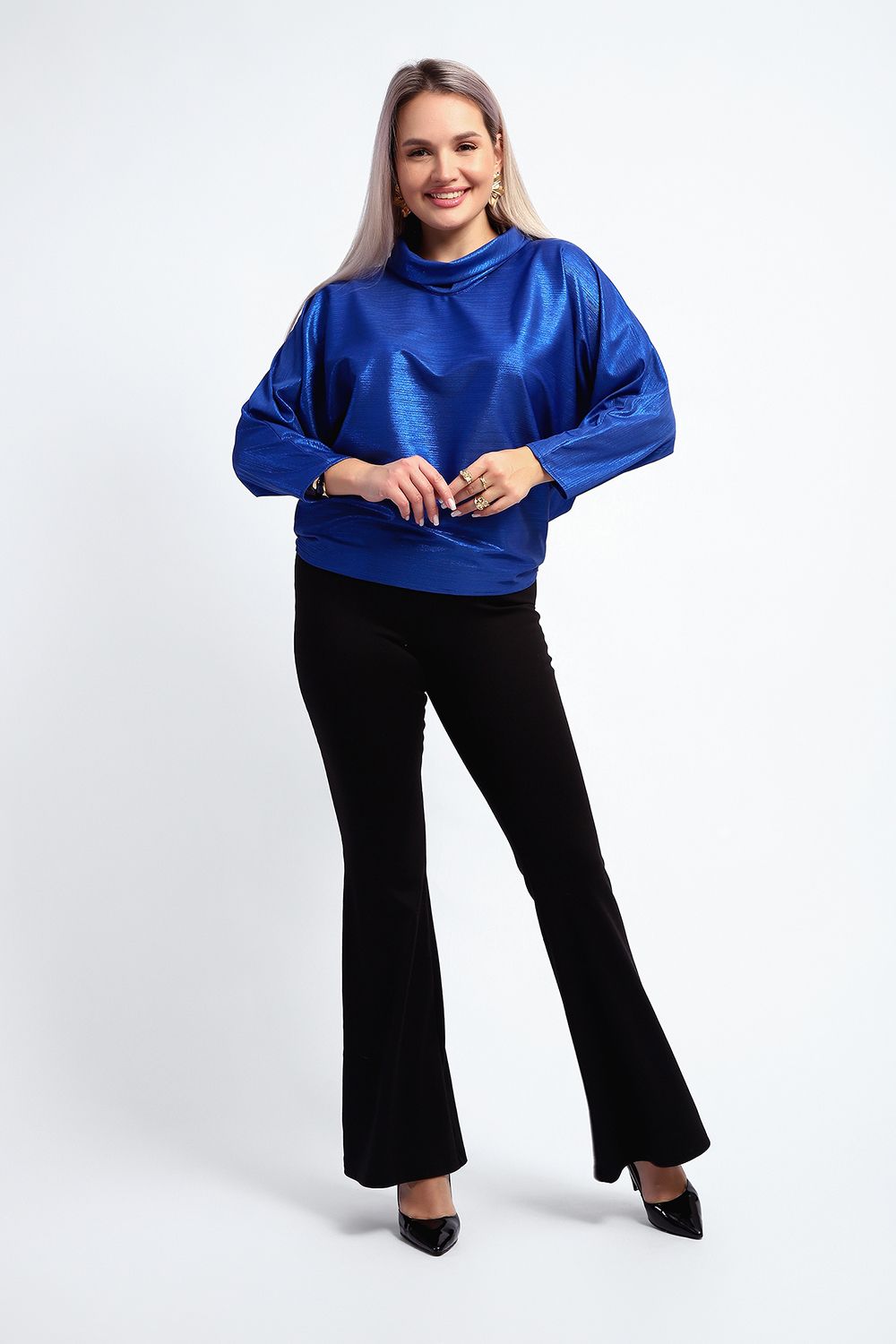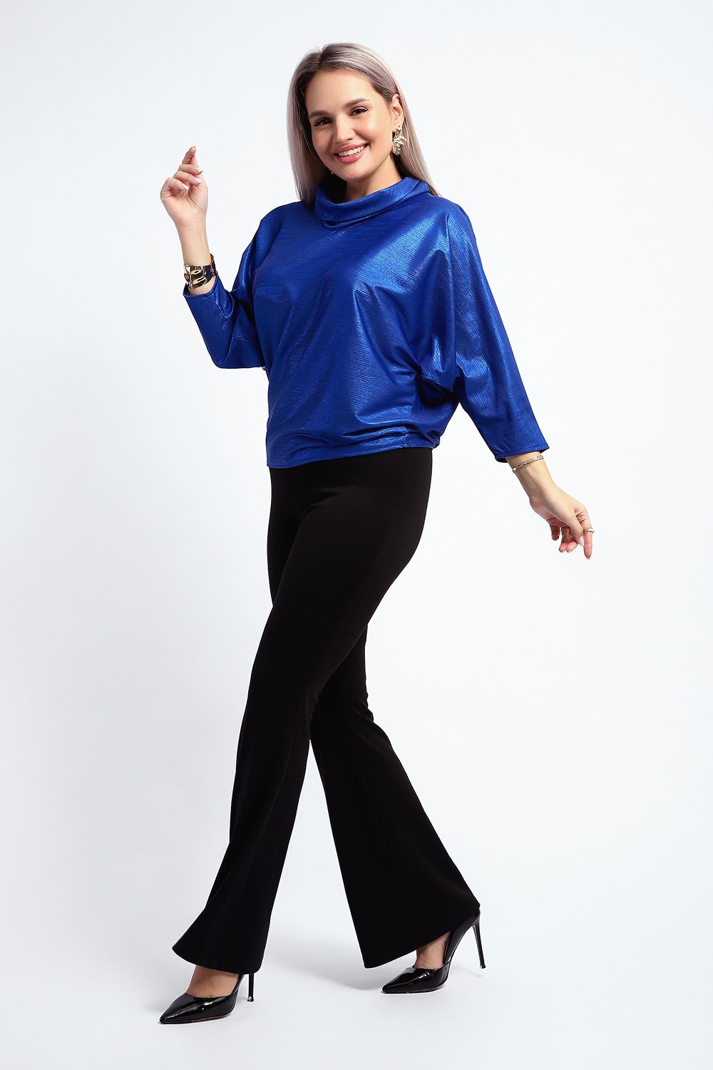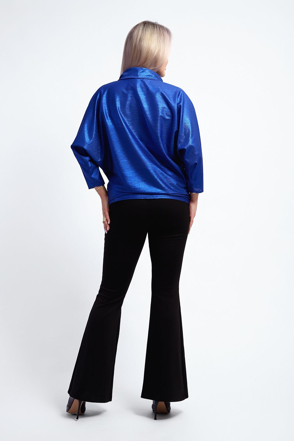 Нарядная и эффектная блузка из ткани шифон- металлик. Ткань тонкая, слегка прозрачная, имеет красивый металлический блеск, переливаясь на складках изделия, не мнется и отлично драпируется. Свободный крой и рукав "летучая мышь" делает эту блузку универсальной, подходящей на любую фигуру. Длина рукава 3/4, воротник- хомут придает женственности образу. Блузка слегка заужена к низу, чтобы на бедрах образовался напуск. С помощью этой блузки можно создать и праздничный, и деловой, и повседневный образ, комбинировать с юбкой и брюками. Широкий размерный ряд - с 48 по 62 размеры.