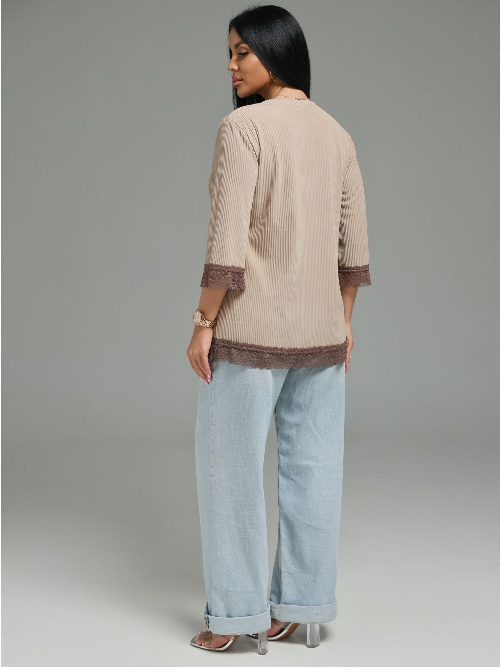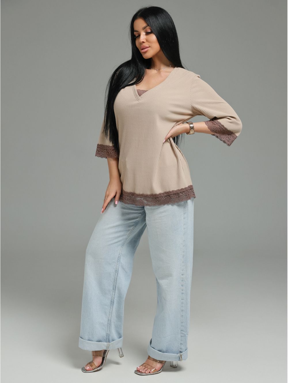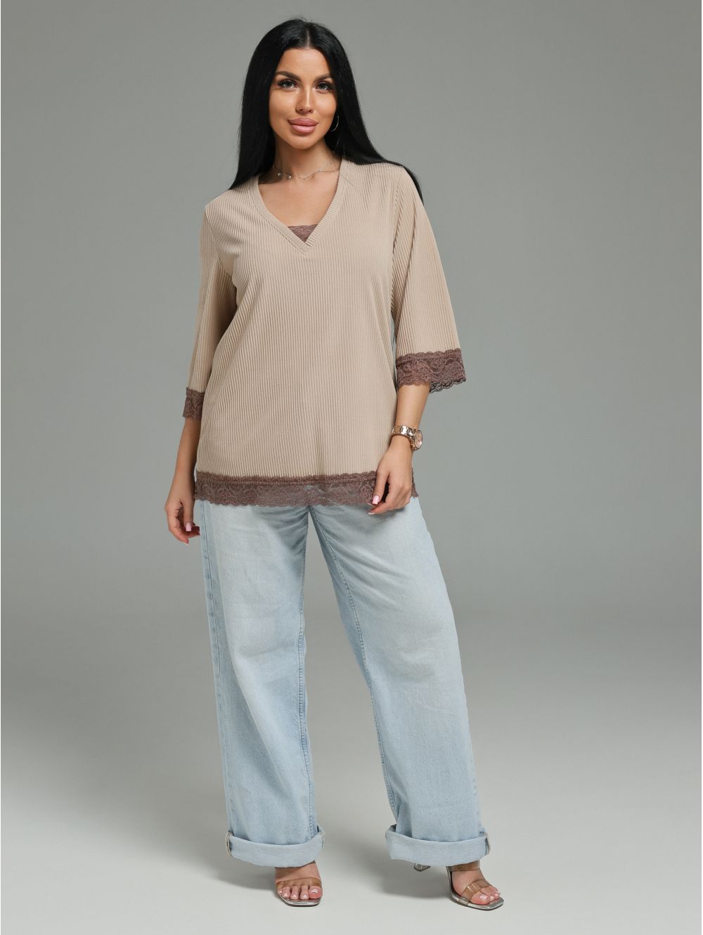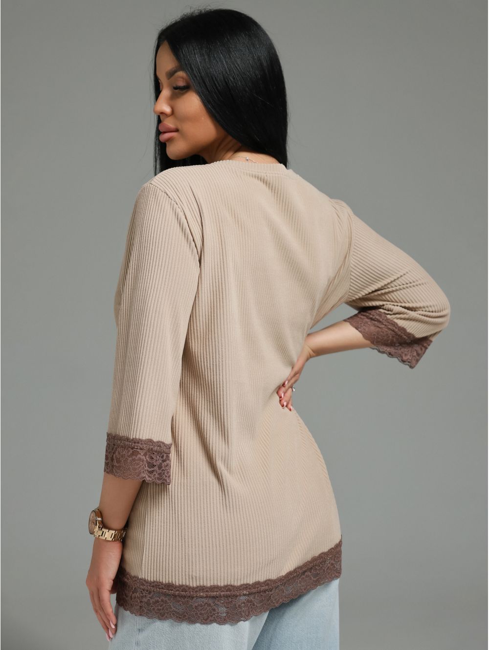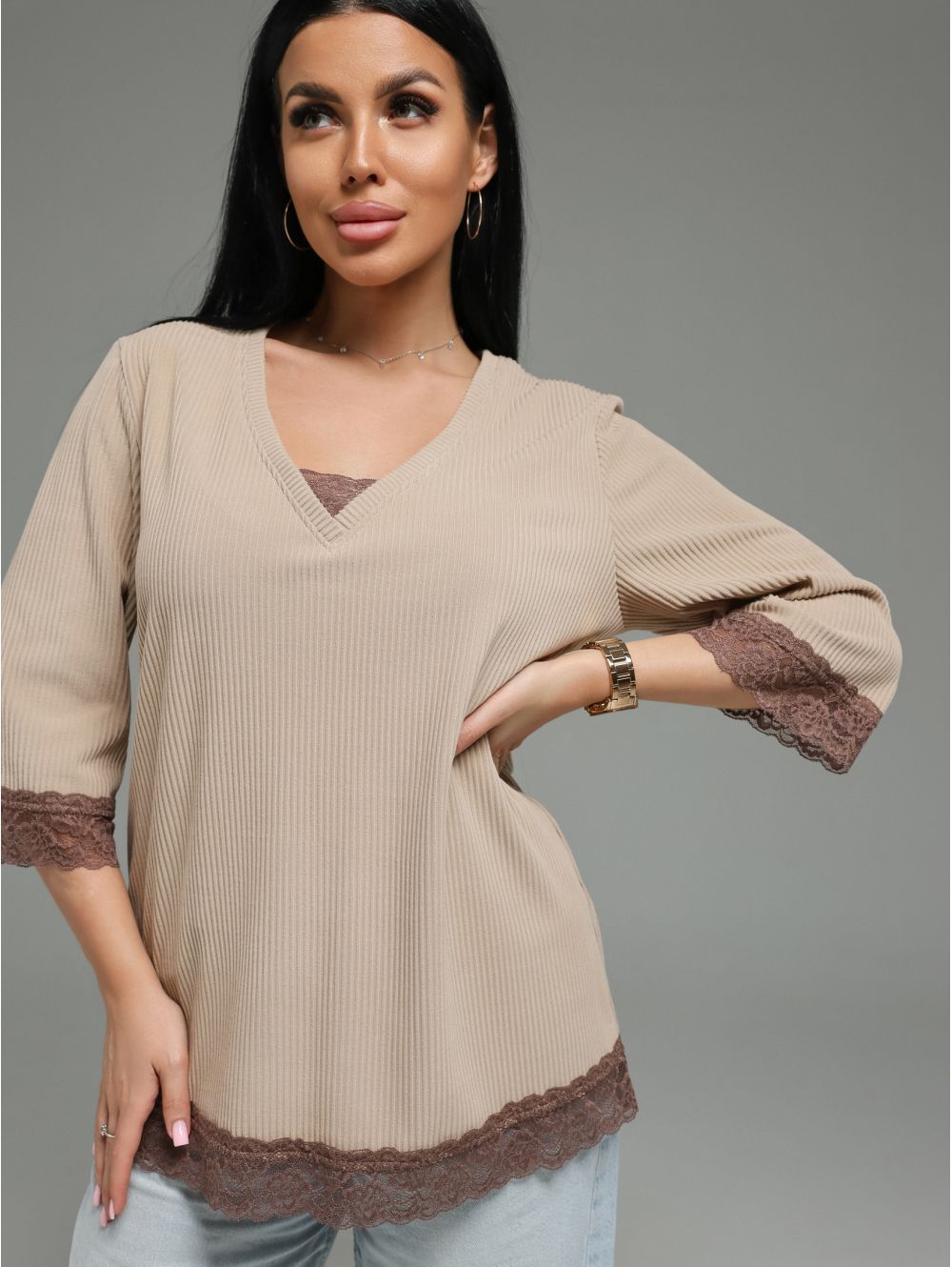 Женская футболка из кашемира «лапша» с кружевной отделкой.