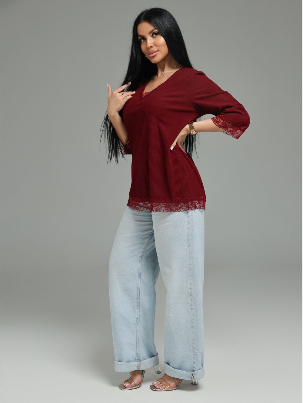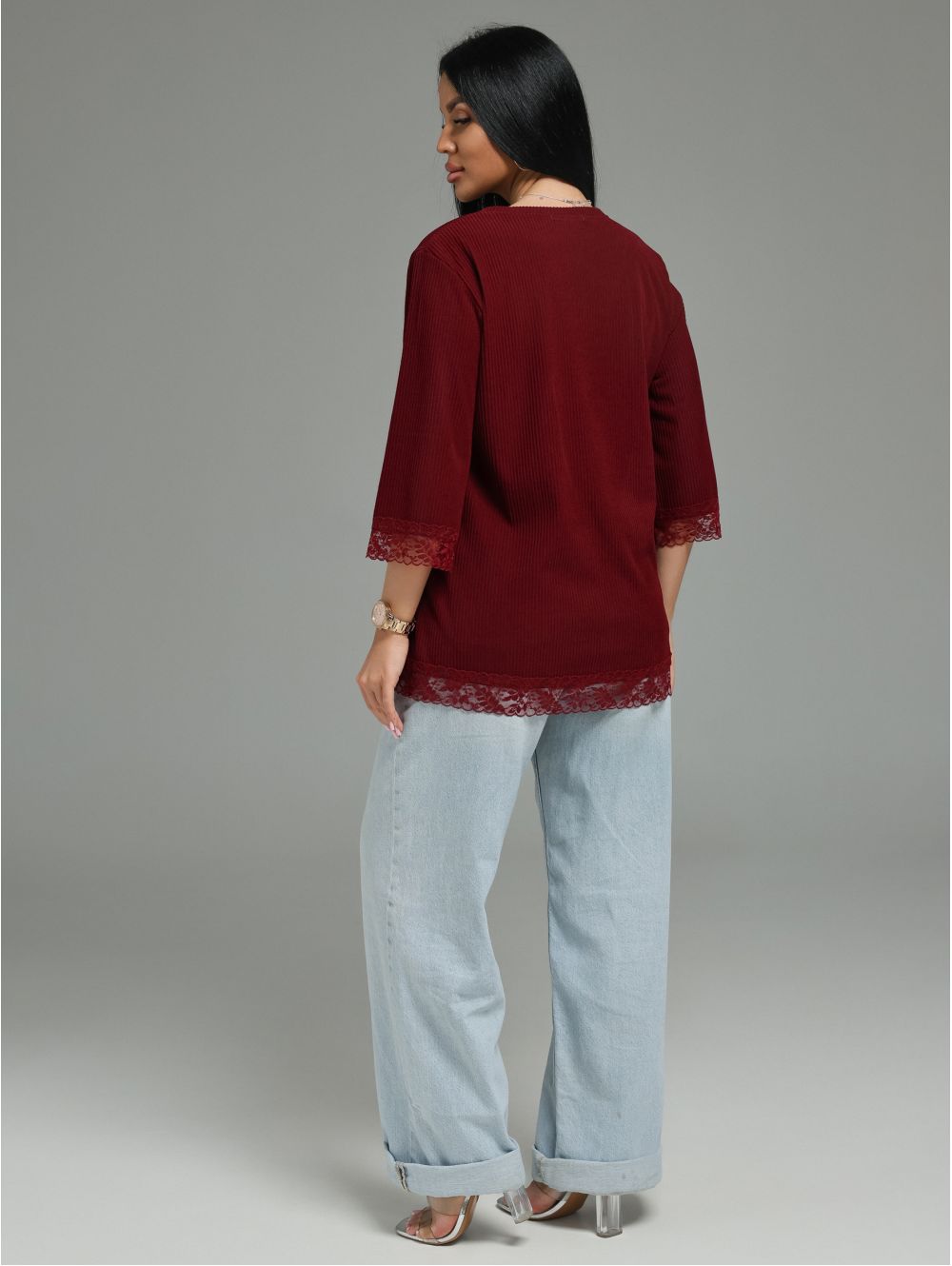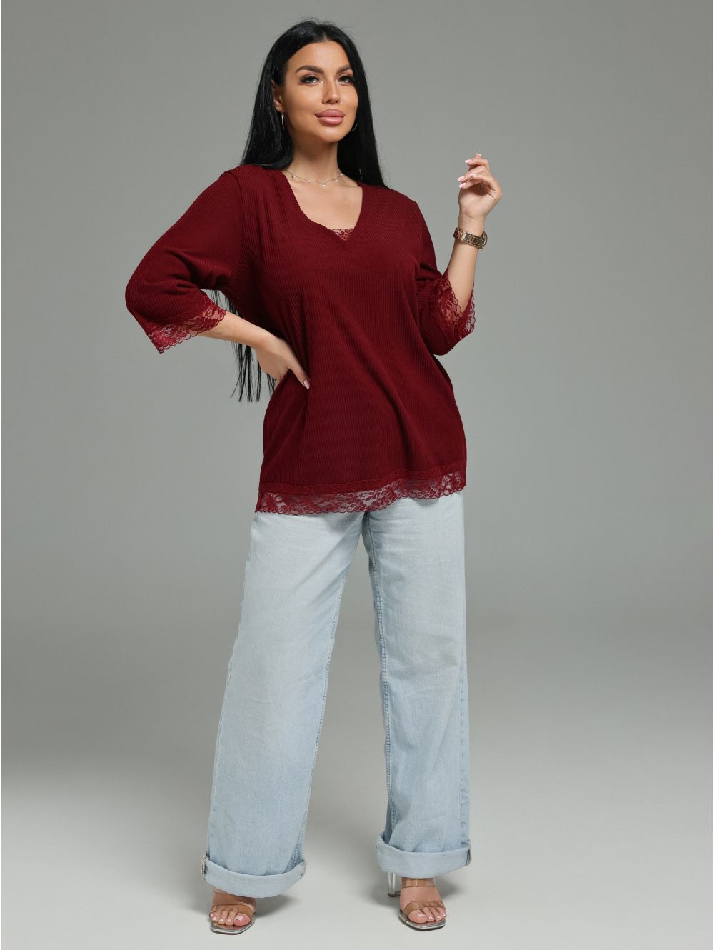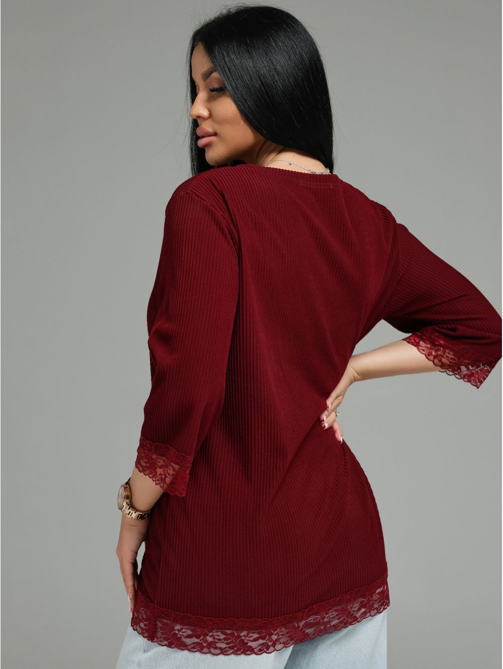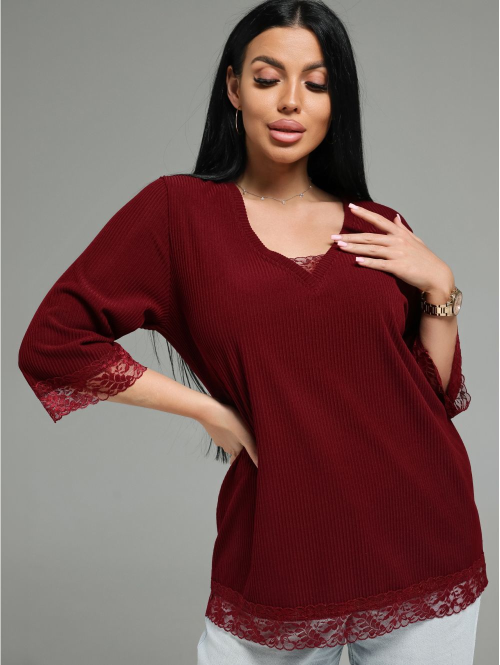 Женская футболка из кашемира «лапша» с кружевной отделкой.