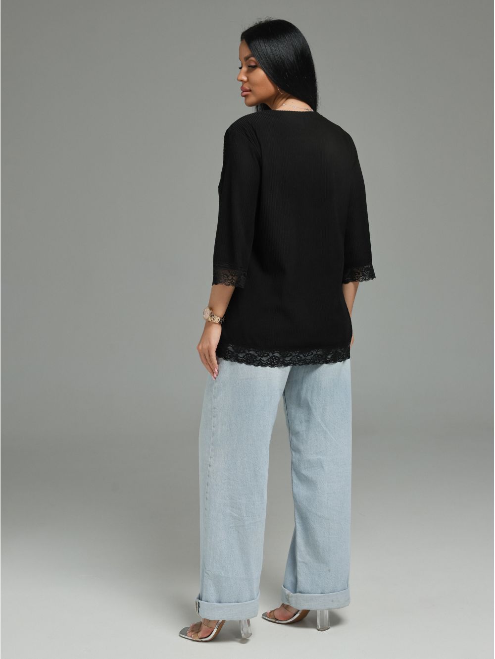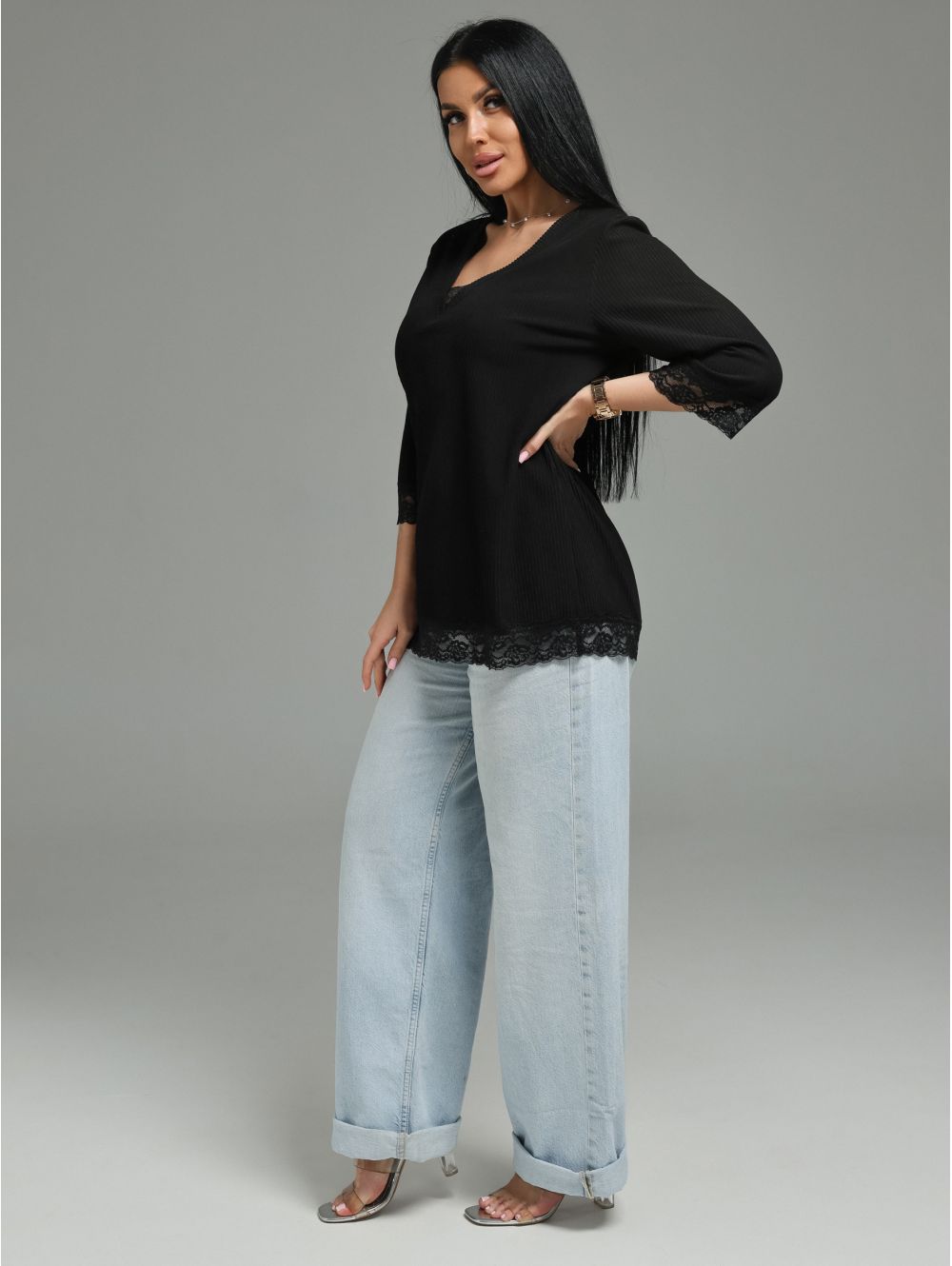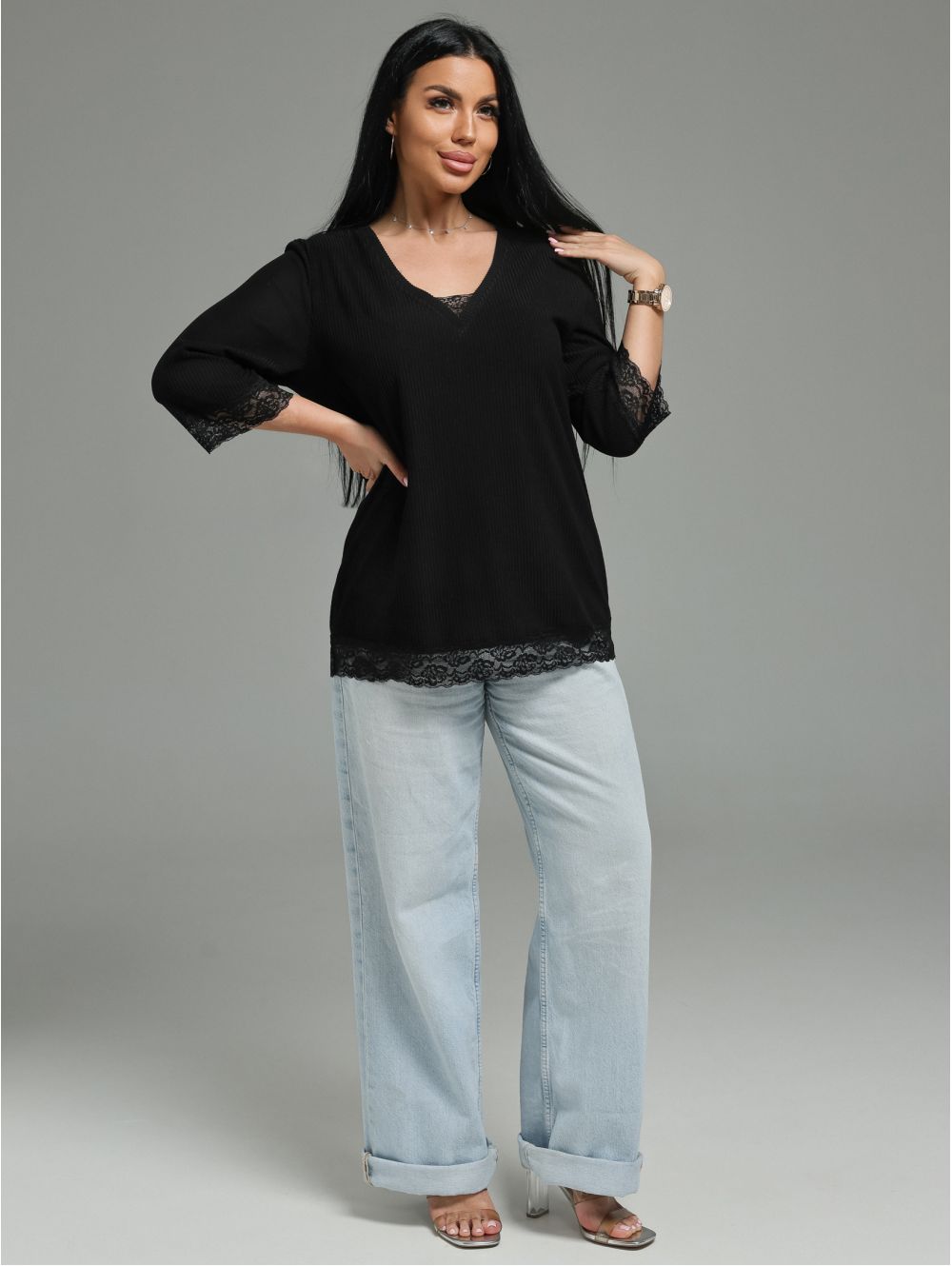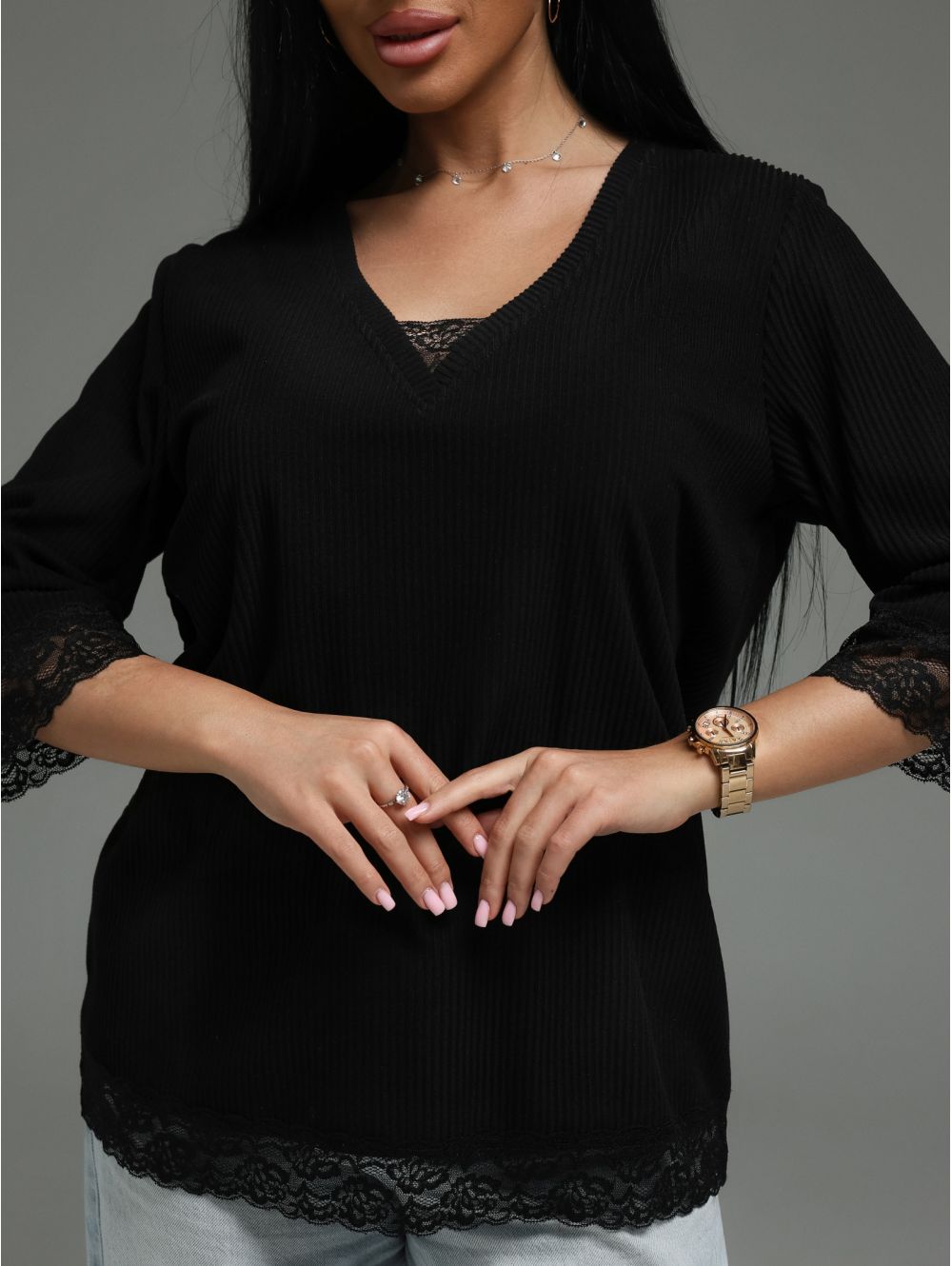 Женская футболка из кашемира «лапша» с кружевной отделкой.
