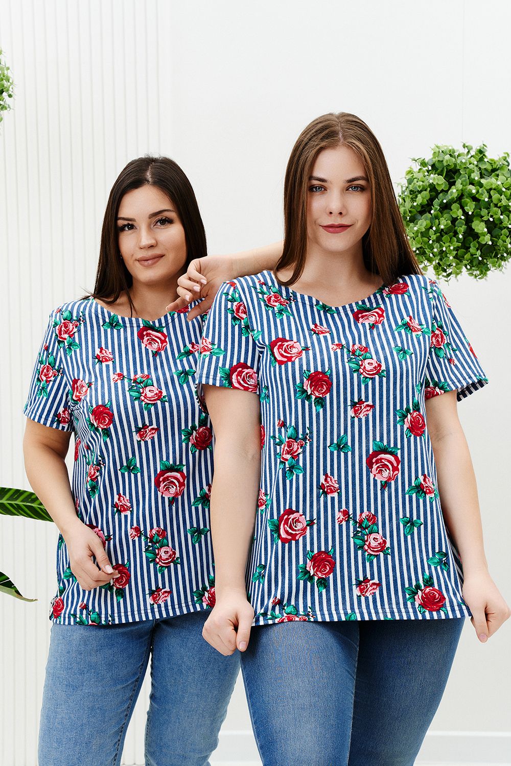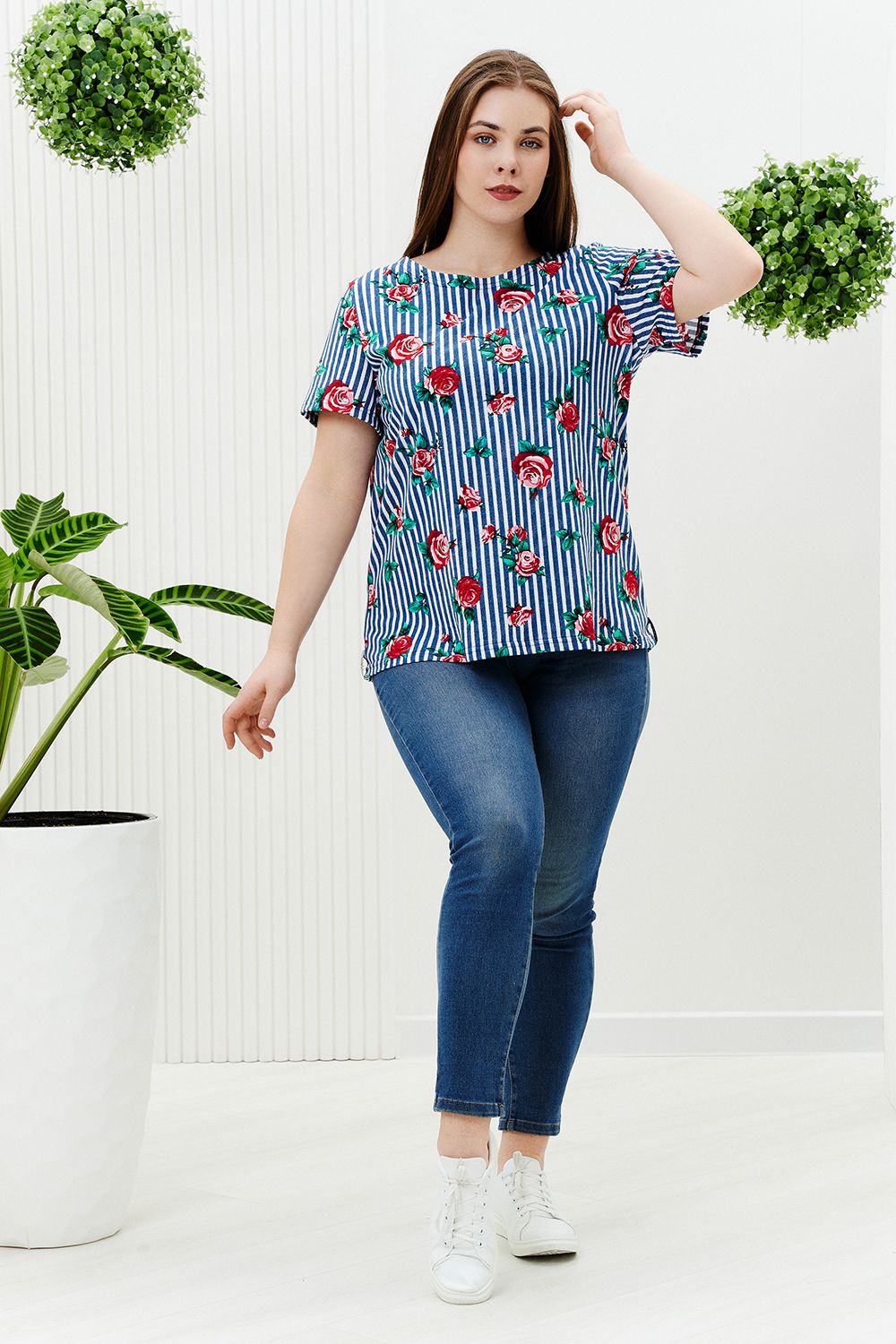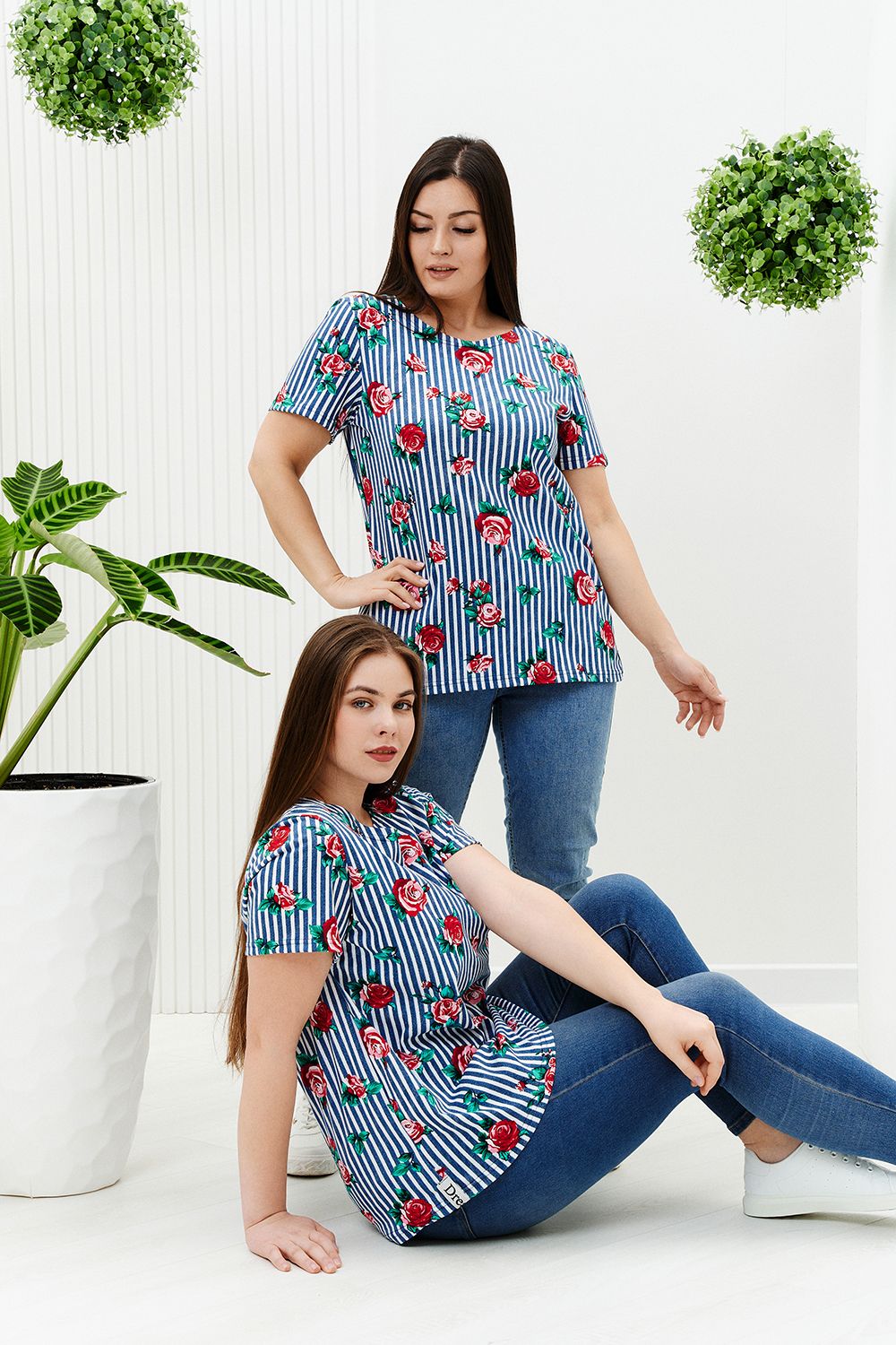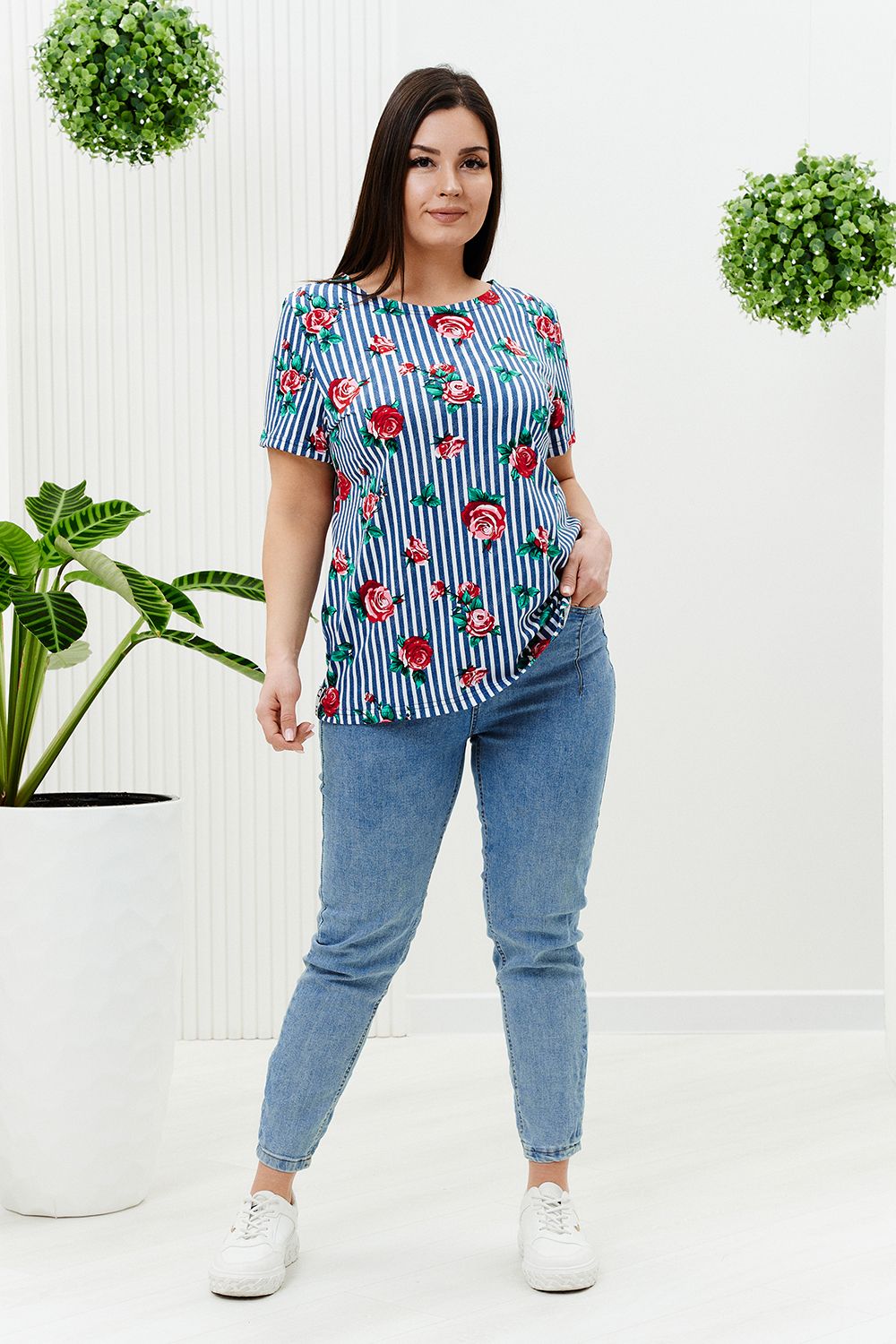 Футболка женская полуприлегающего силуэта. Рукав втачной короткий. Вырез горловины круглый. В боковом шве утяжки из декоративной тесьмы.