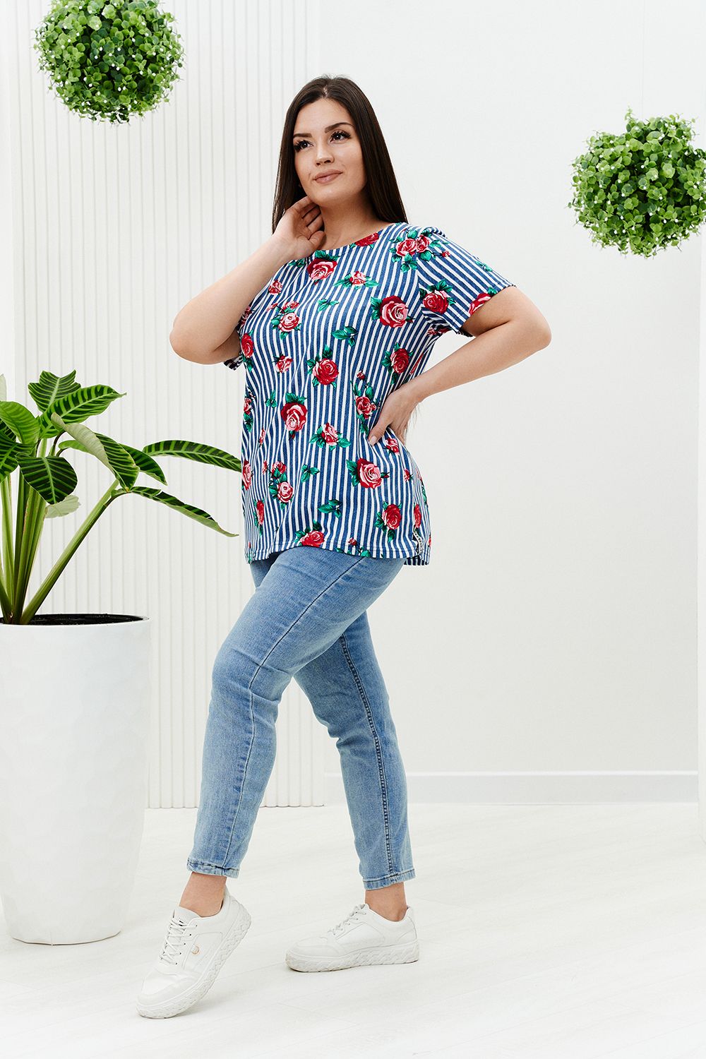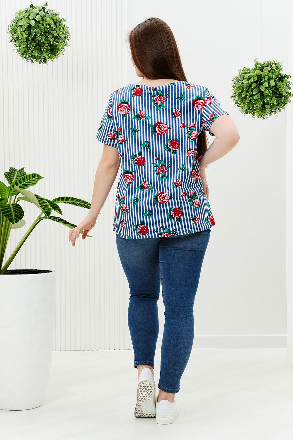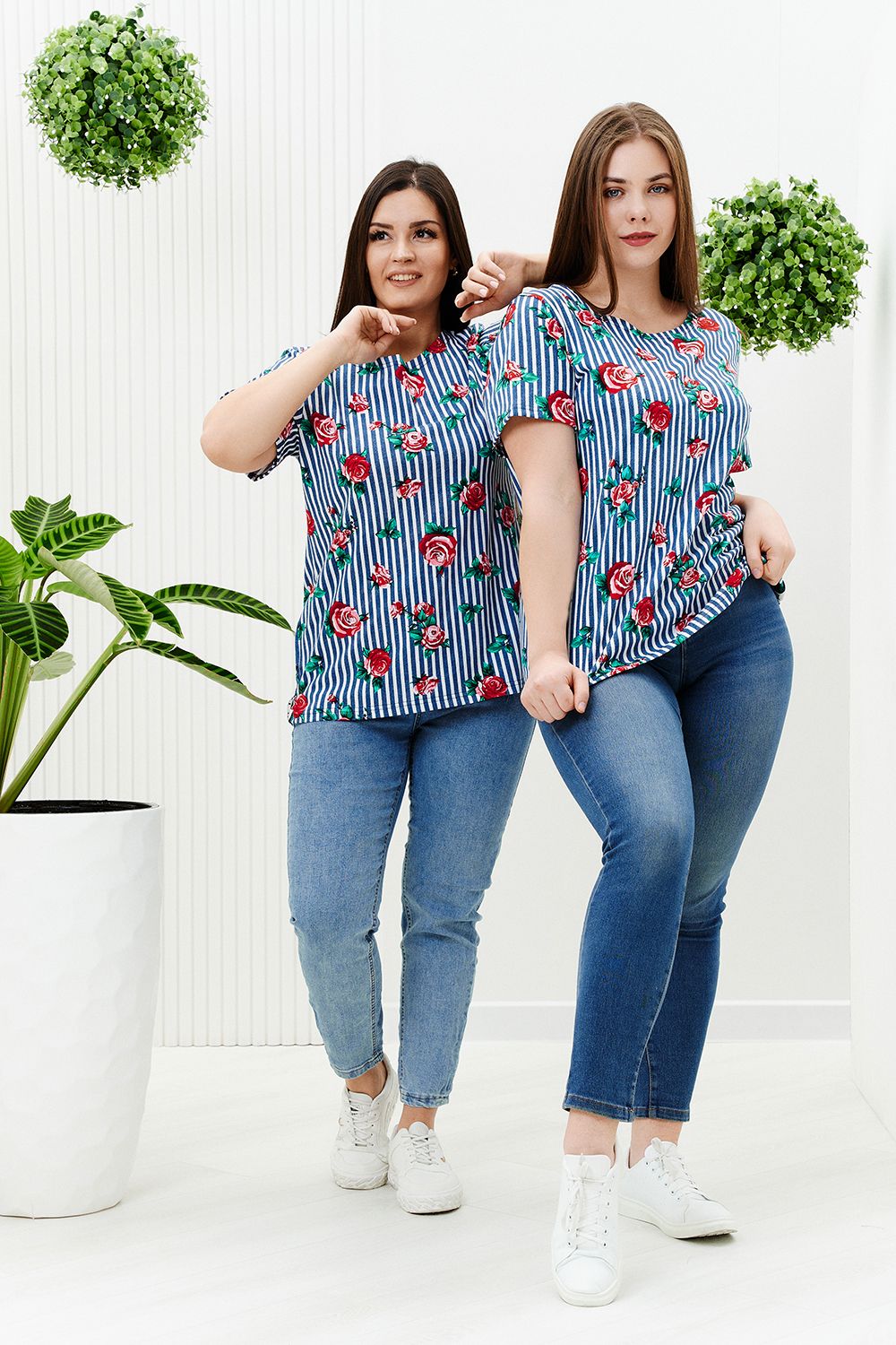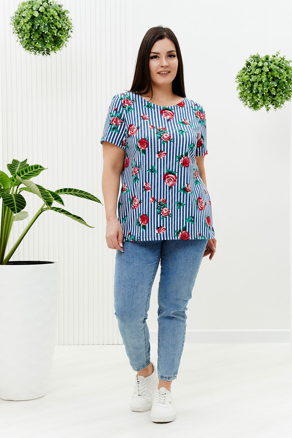 Футболка женская полуприлегающего силуэта. Рукав втачной короткий. Вырез горловины круглый. В боковом шве утяжки из декоративной тесьмы.