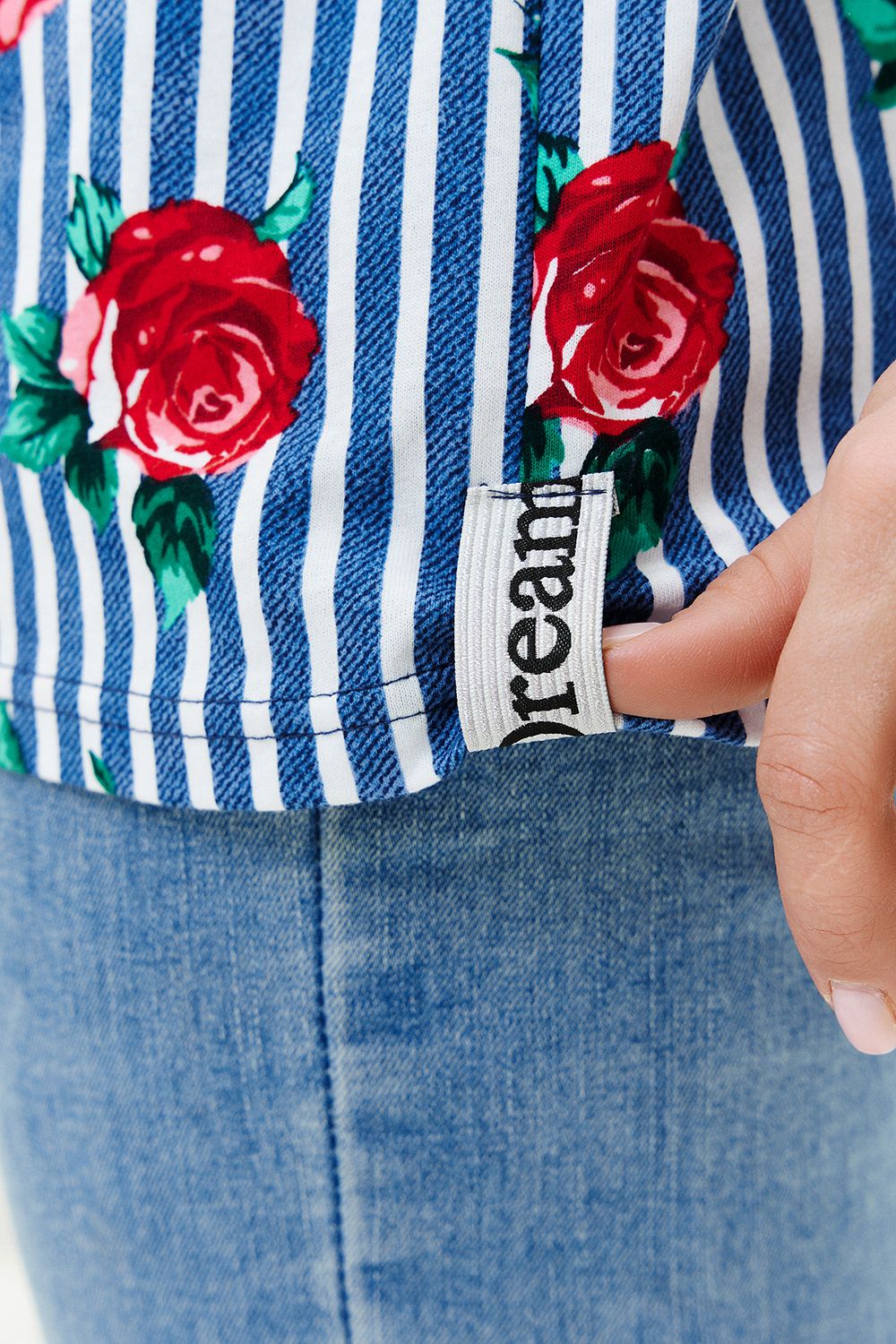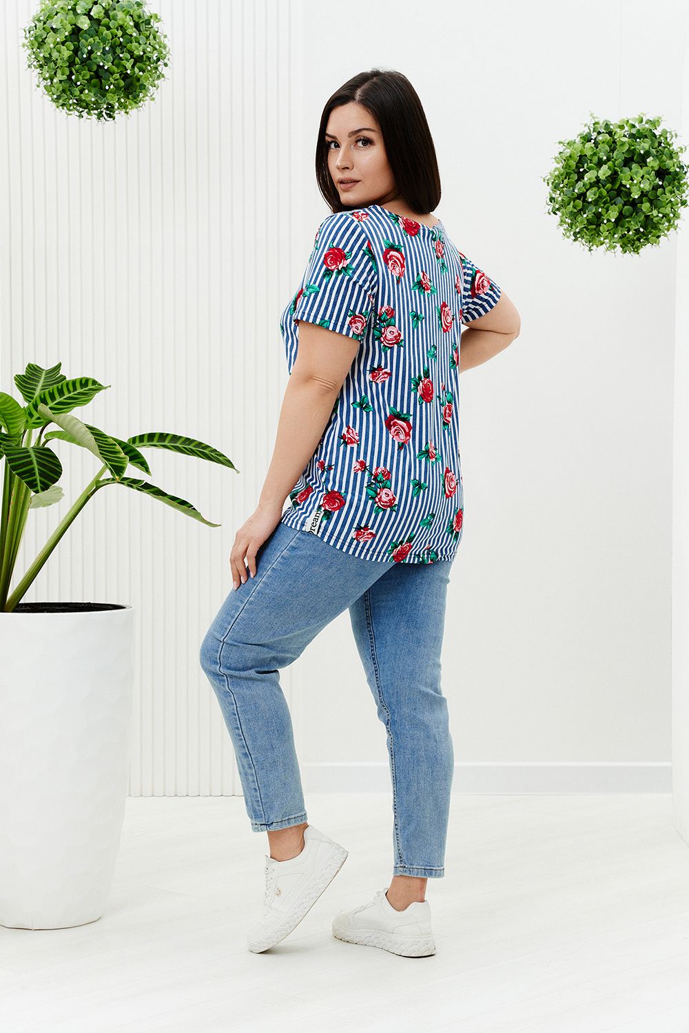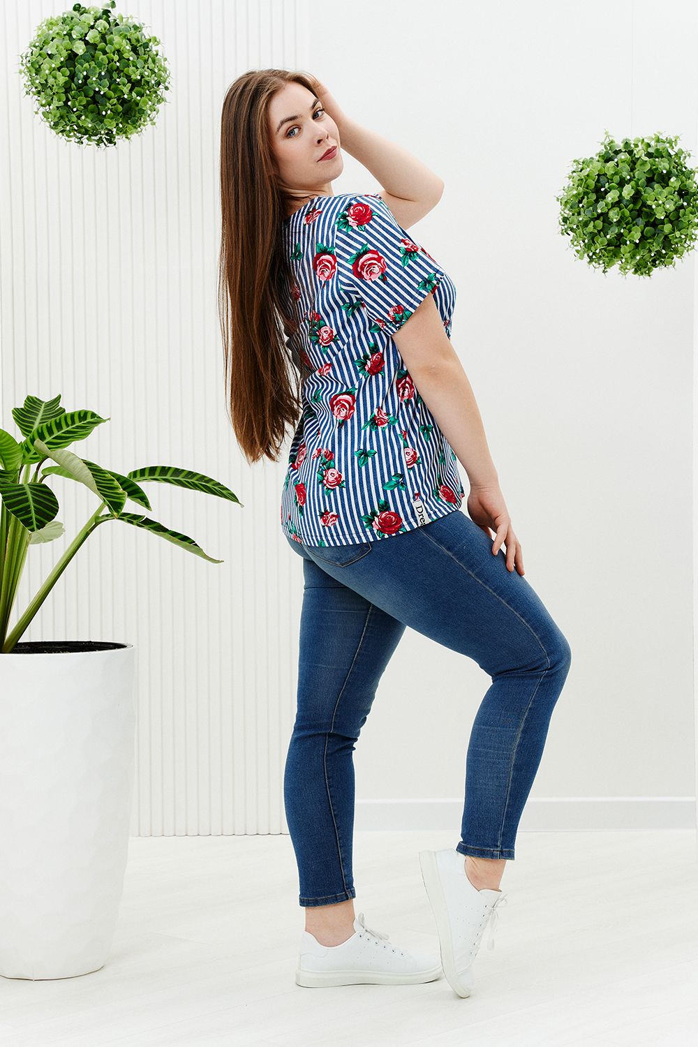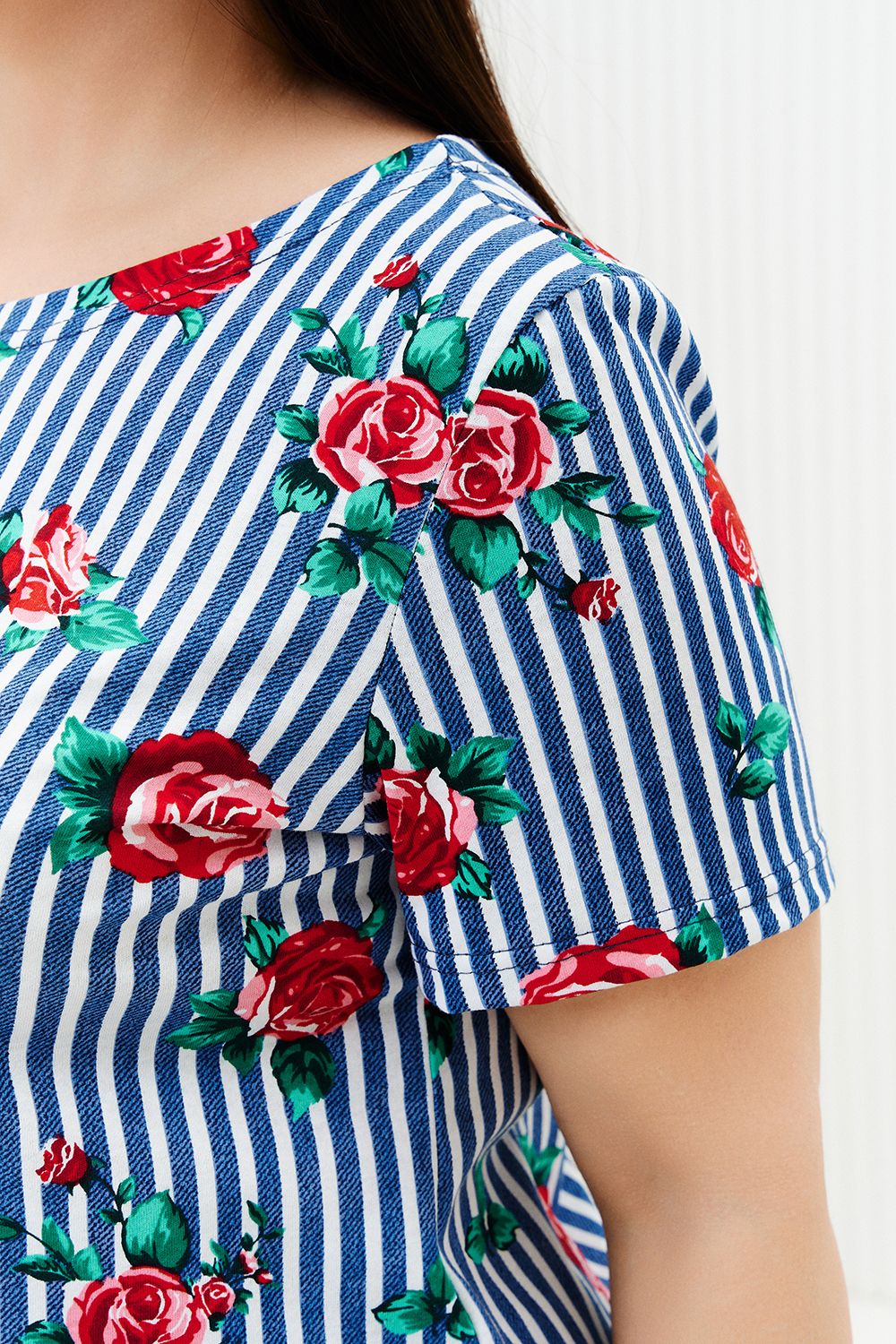 Футболка женская полуприлегающего силуэта. Рукав втачной короткий. Вырез горловины круглый. В боковом шве утяжки из декоративной тесьмы.