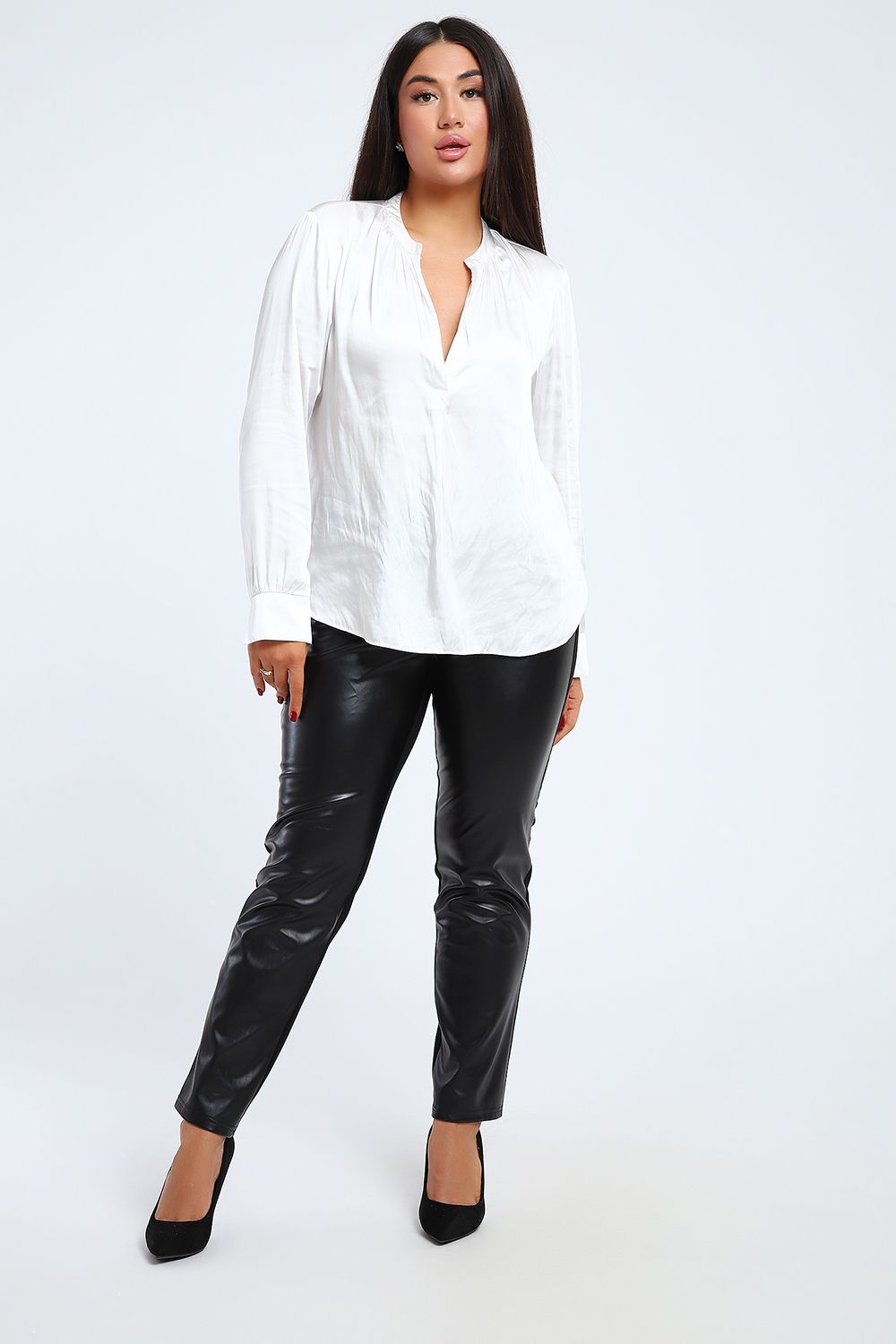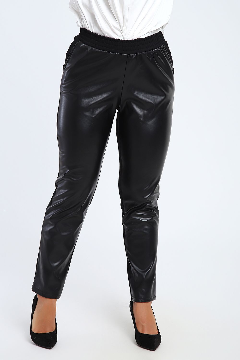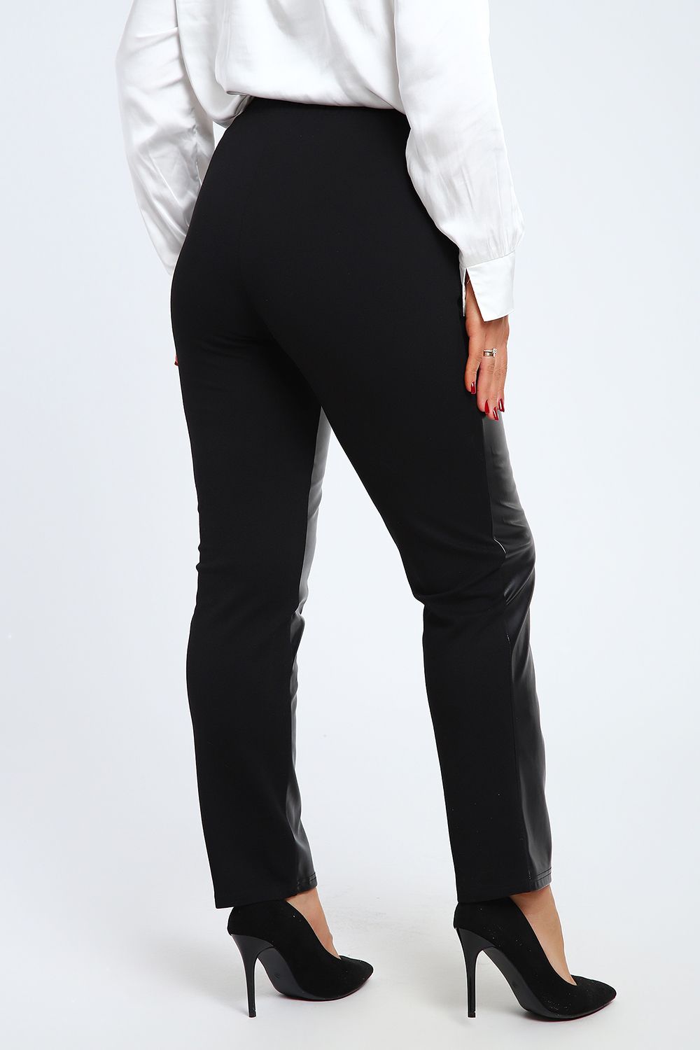 Модные универсальные брюки на все случаи жизни. Подойдут как офисный вариант, для торжественных случаев и для повседневного образа. Передняя половинка брюк изготовлена из экокожи с начесом по изнаночной стороне. Задняя половинка - из плотного трикотажа джерси, в составе которого 60% вискозы, что обеспечивает комфорт при носке изделия. Брюки прямого кроя, слегка зауженные к низу, средняя посадка, по бокам внутренние карманы. Эластичный пояс заготовлен на спецмашине. В замерах обхват талии соответствует длине резинки в растянутом виде. Ткань и кожа хорошо тянутся, поэтому брюки подойдут на любую фигуру и будут удобны в использовании.