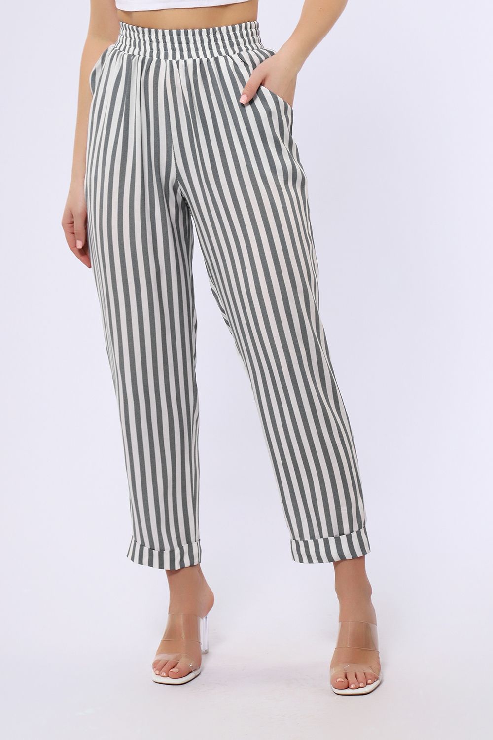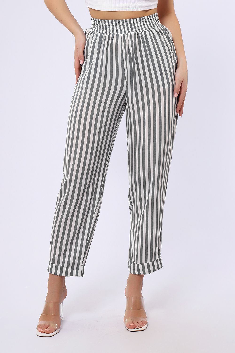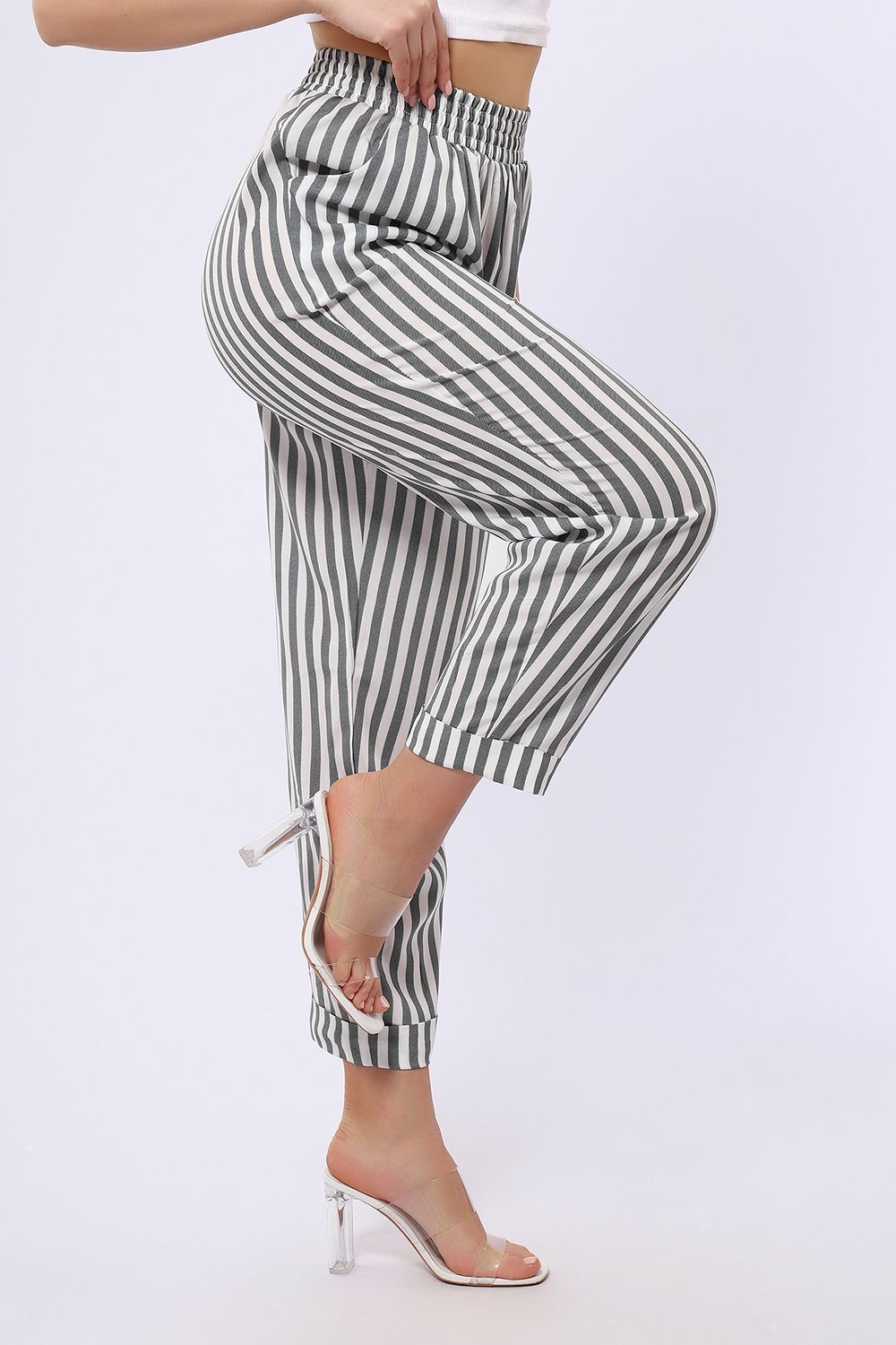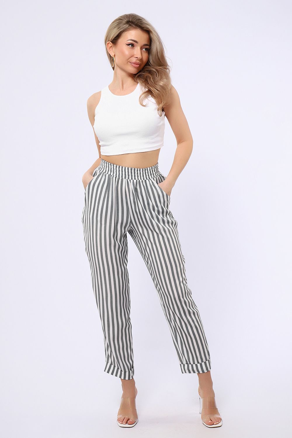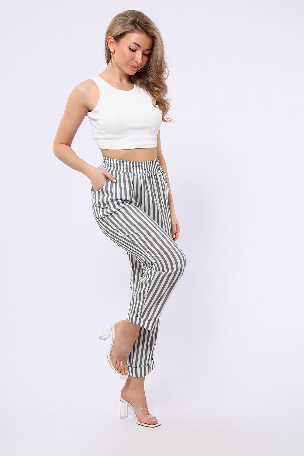 Брюки имеют два боковых внутренних кармана. Длина их 7/8, снизу притачаны манжеты, которые можно подвернуть наверх или отвернуть вниз, чтобы удлинить штаны. В замерах указана длина брюк с подвернутыми наверх манжетами. Рост модели 167см. Обхват талии в замерах соответствует длине резинки в растянутом виде.