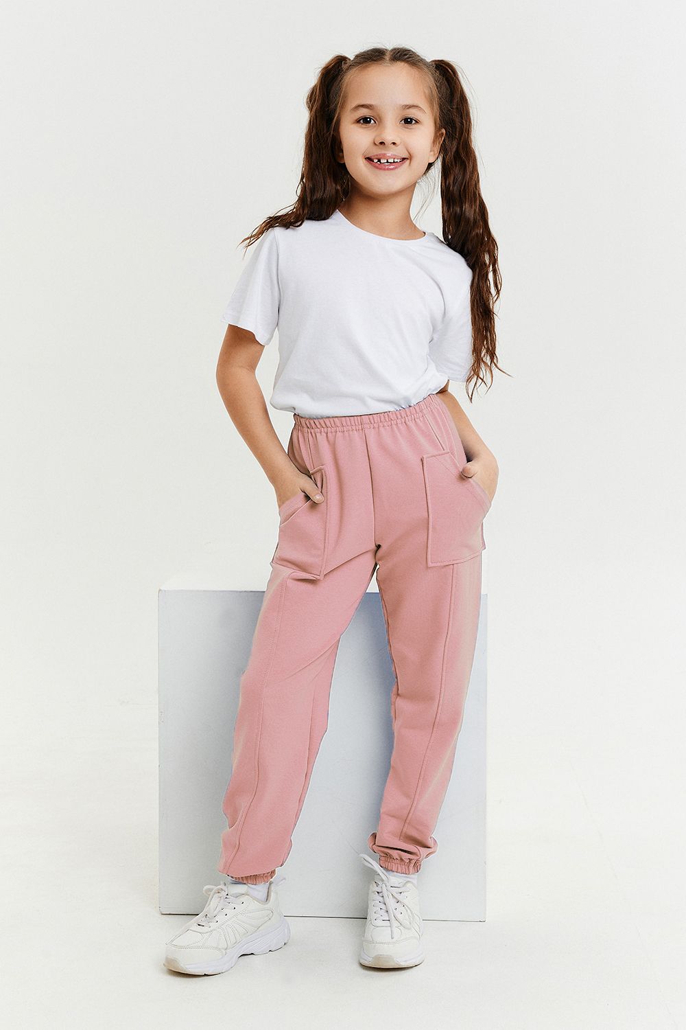 Брюки детские из футера с накладными карманами.