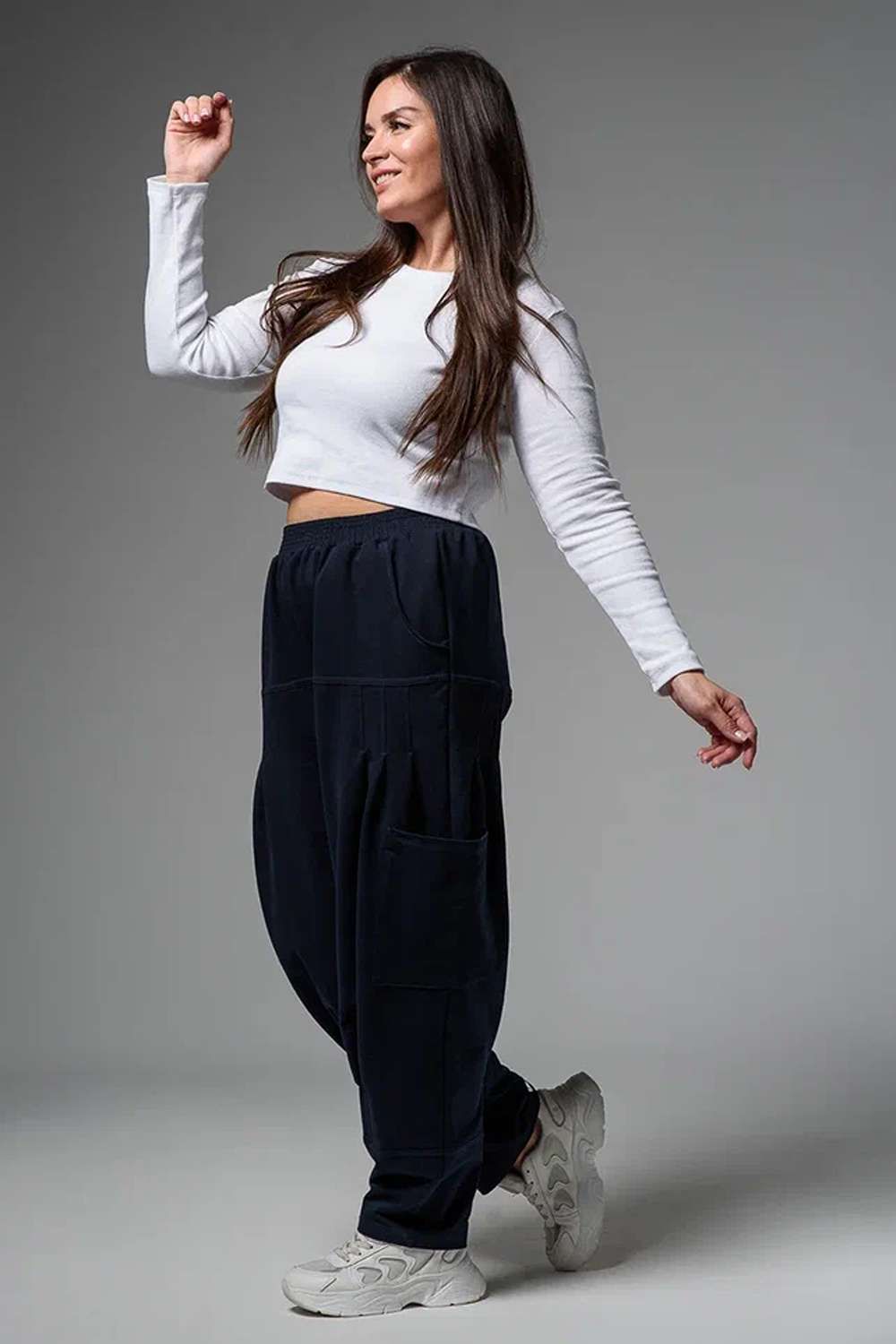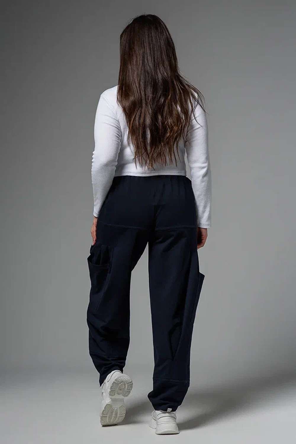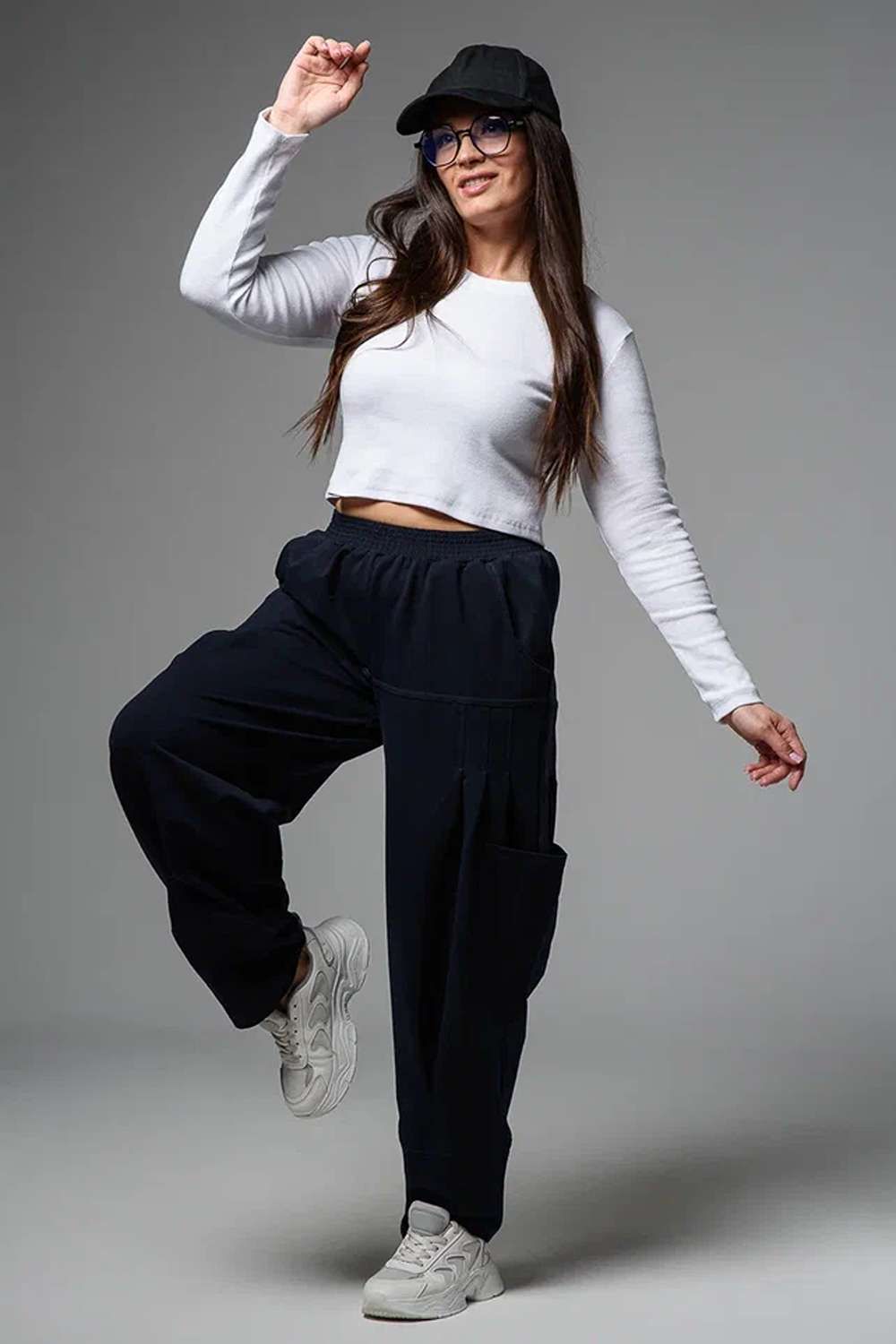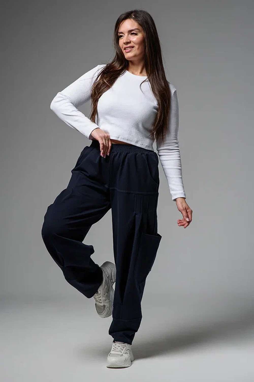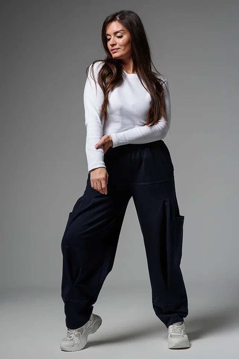 Брюки женские, "бананы". Передние и задние части брюк из трех частей. В верхней передней части брюк внутренние карманы. В средней части брюк по три вертикальные складки и по-боковому накладные карманы. Конструкция брюк позволяет скрыть любые недостатки в области бедер.