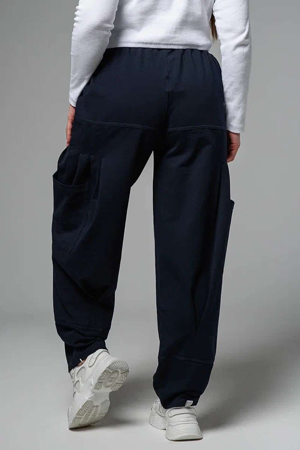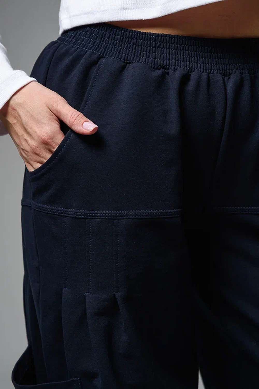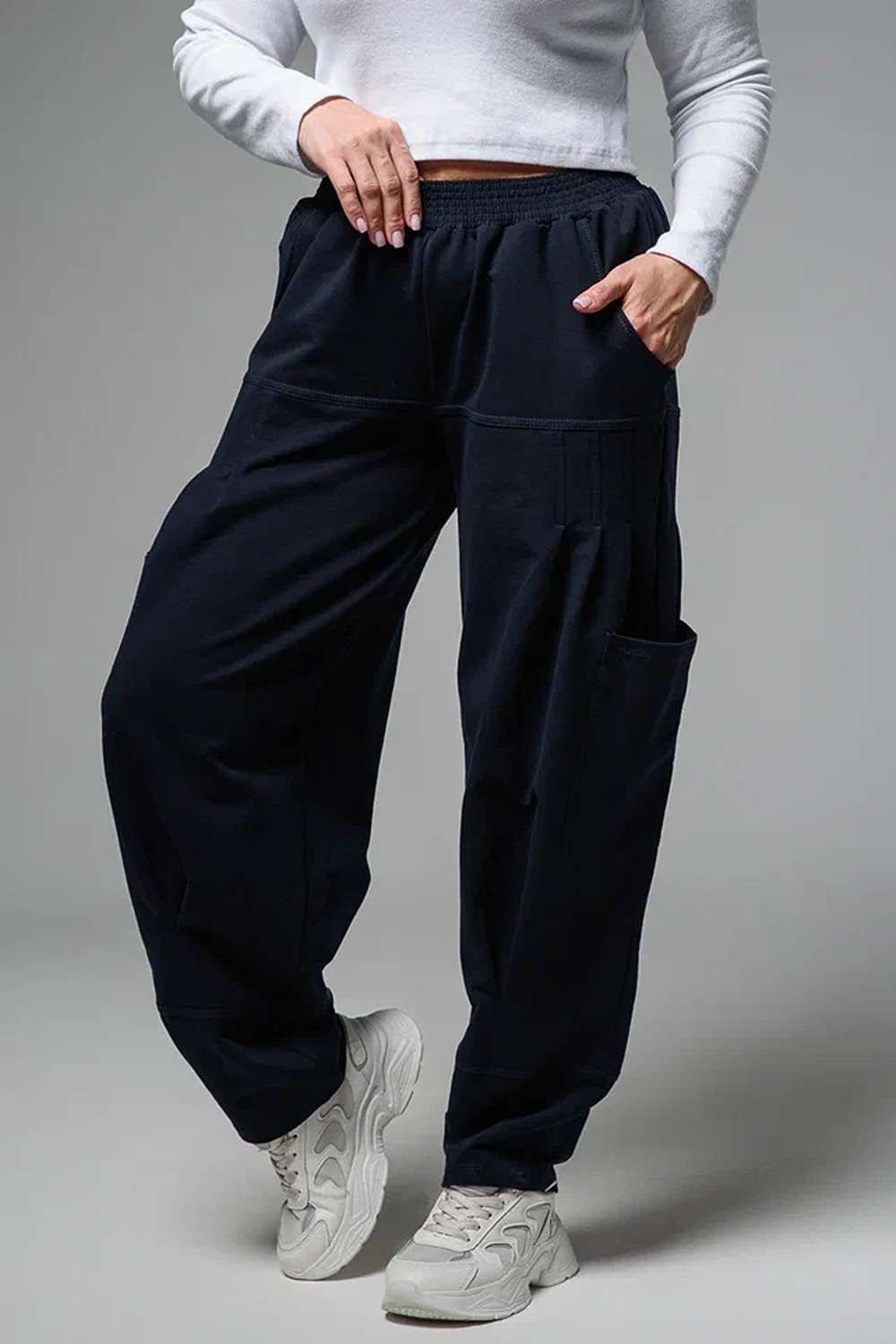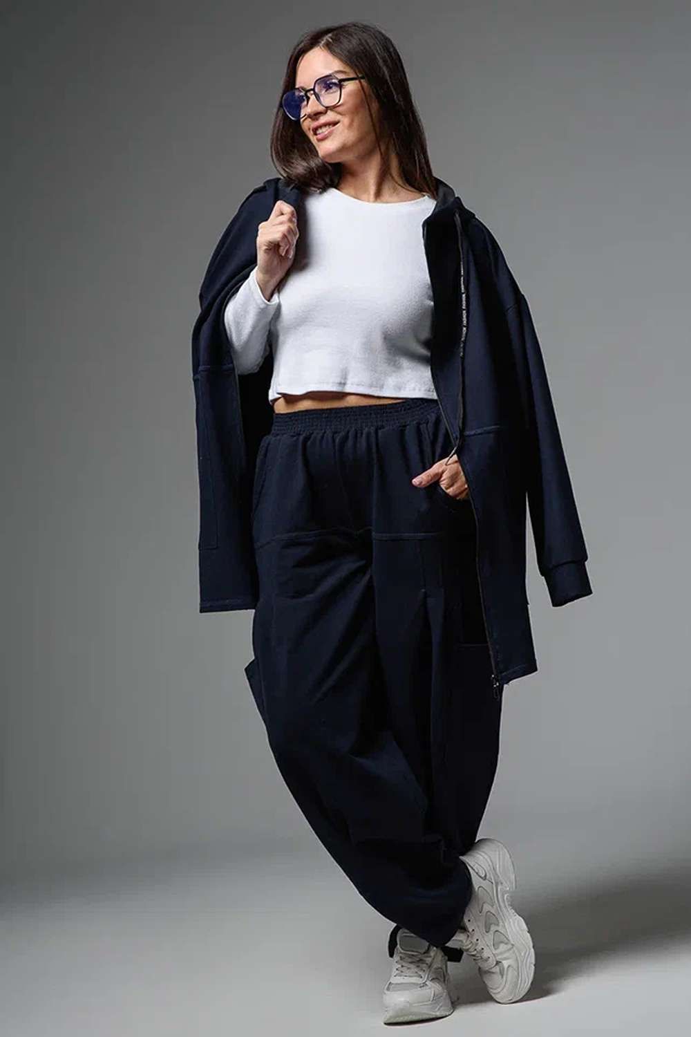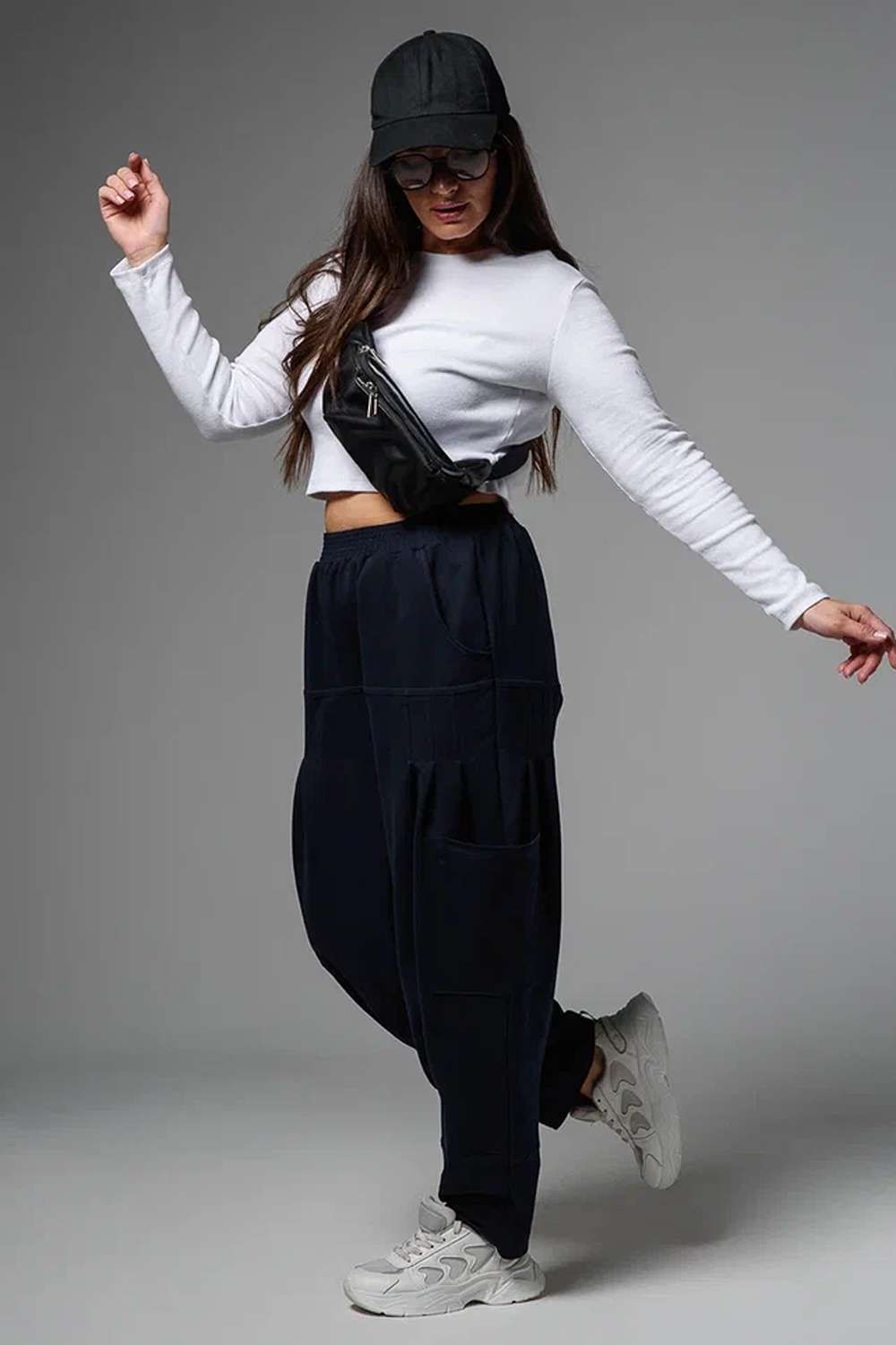 Брюки женские, "бананы". Передние и задние части брюк из трех частей. В верхней передней части брюк внутренние карманы. В средней части брюк по три вертикальные складки и по-боковому накладные карманы. Конструкция брюк позволяет скрыть любые недостатки в области бедер.