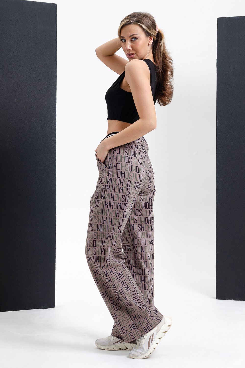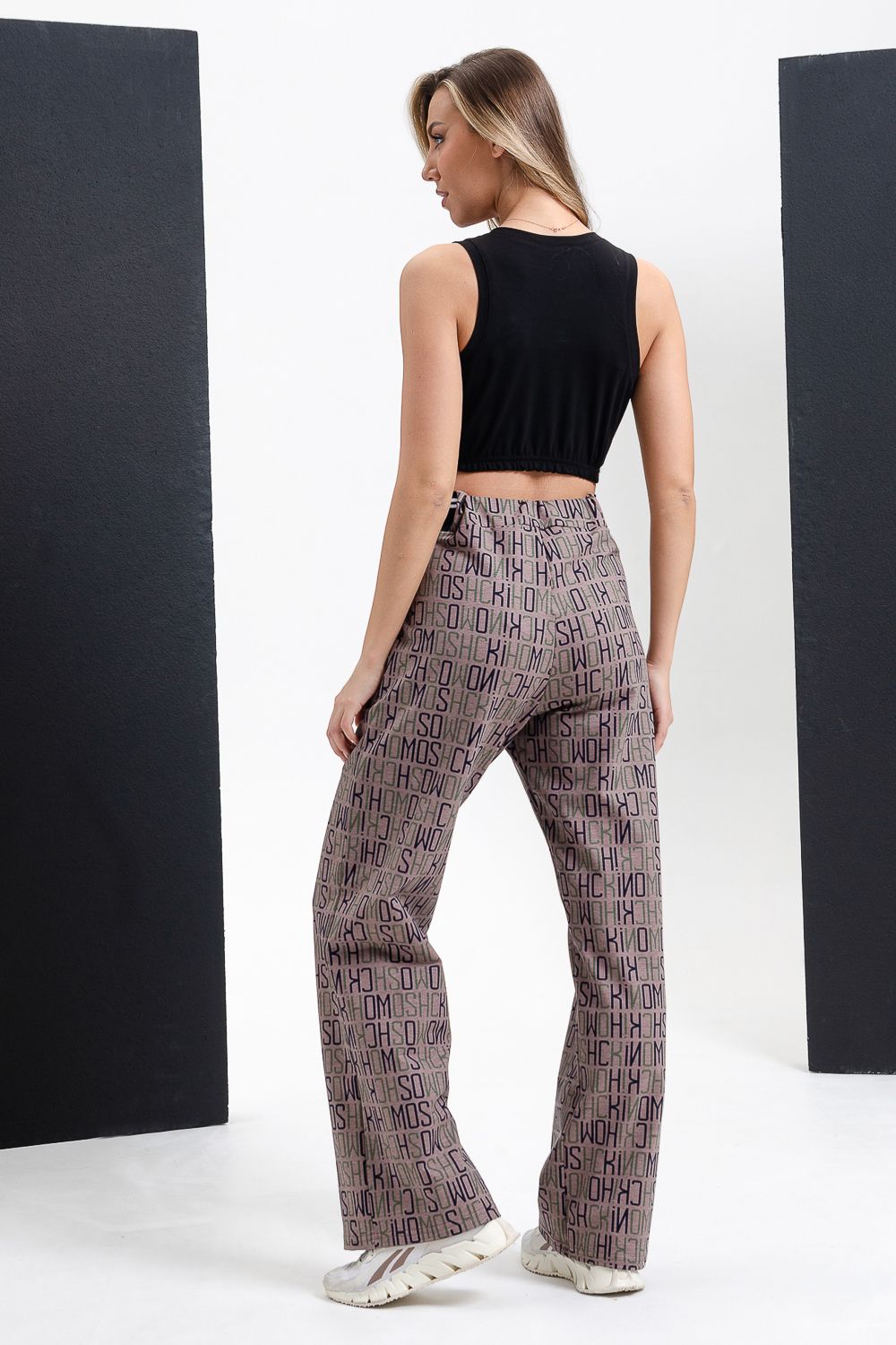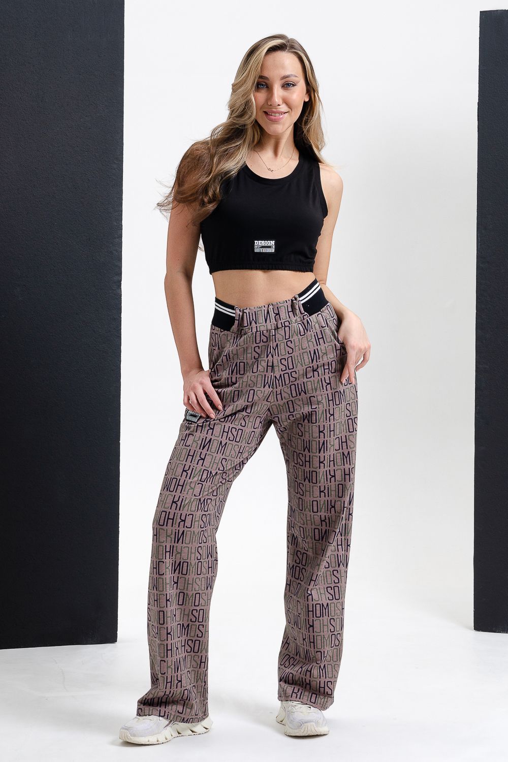 Брюки прямые, с боковыми карманами, на поясе. Боковые вставки пояса выполнены из кашкорсе с лампасами.