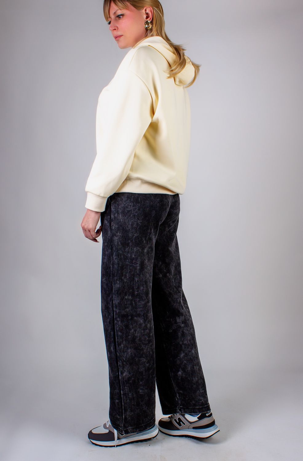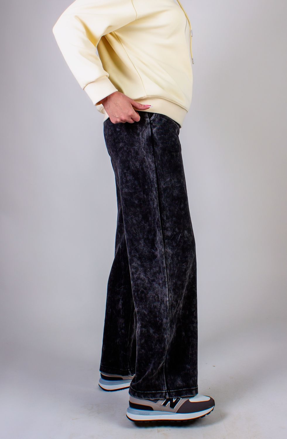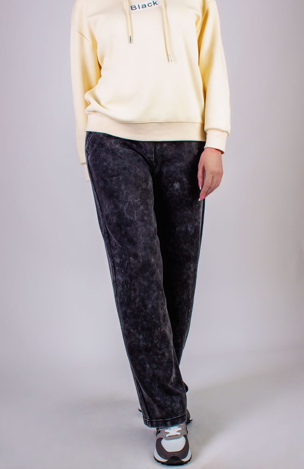 Черная расцветка с эффектом тай-дай придает брюкам оригинальность и современный вид, делая их яркой, но в то же время стильной деталью гардероба. В зависимости от настроения и ситуации, такие брюки легко сочетаются с различными топами, футболками и жакетами, позволяя создавать как повседневные, так и более нарядные образы.