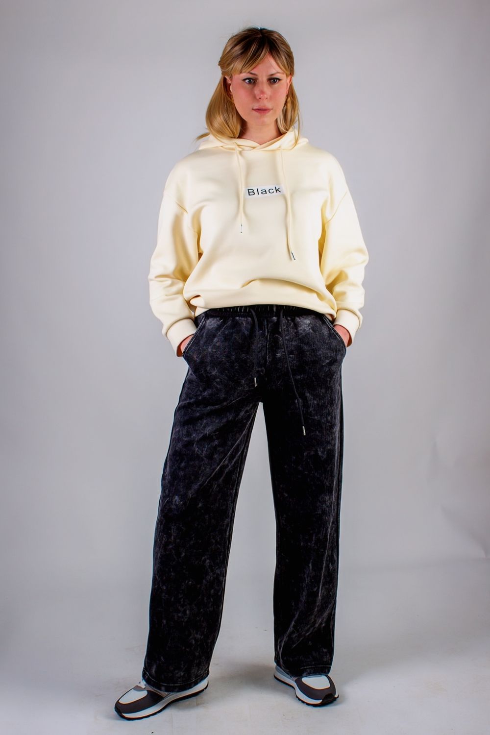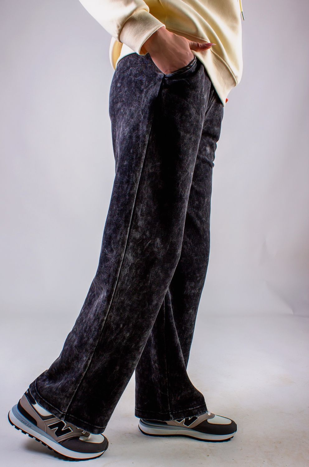 Брюки палаццо на резинке Варенка в черной расцветке с эффектом тай-дай — это идеальный выбор для тех, кто ценит комфорт и стиль в одном изделии. Представленные брюки выполнены из премиум-плотного трикотажа на основе хлопка, что гарантирует отличную воздухопроницаемость и долговечность материала. Такая ткань не только приятна на ощупь, но и способна «дышать», поддерживая оптимальный микроклимат для Вашего тела в любое время года.
