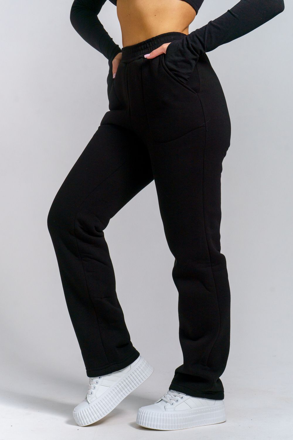Женские брюки прямого силуэта из футерного полотна с начесом — теплые и удобные для повседневной носки. Модель оснащена практичными карманами и эластичным поясом из кашкорсе, который обеспечивает комфорт и идеальную посадку. Отличный выбор для домашних дел, прогулок и активного отдыха в прохладную погоду. Идеальны для оптовых закупок — высокое качество тканей и пошива по выгодной цене!