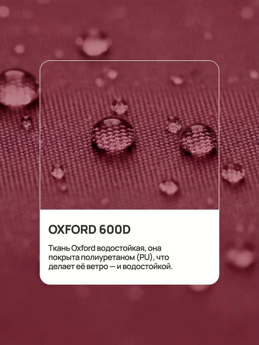Он изготовлен из прочной ткани Oxford 600D которая не выгорает на солнце и сохраняет форму при длительном использовании на улице. Ткань Oxford водостойкая, она покрыта полиуретаном (PU), что делает её ветро- и водостойкой. Тент для садовой техники не пропускает воду даже при сильном дожде, защищает от выгорания на солнце и сохраняет свои свойства при перепадах температур. Уличный чехол для техники эффективно предотвращает коррозию, загрязнения и преждевременный износ оборудования.