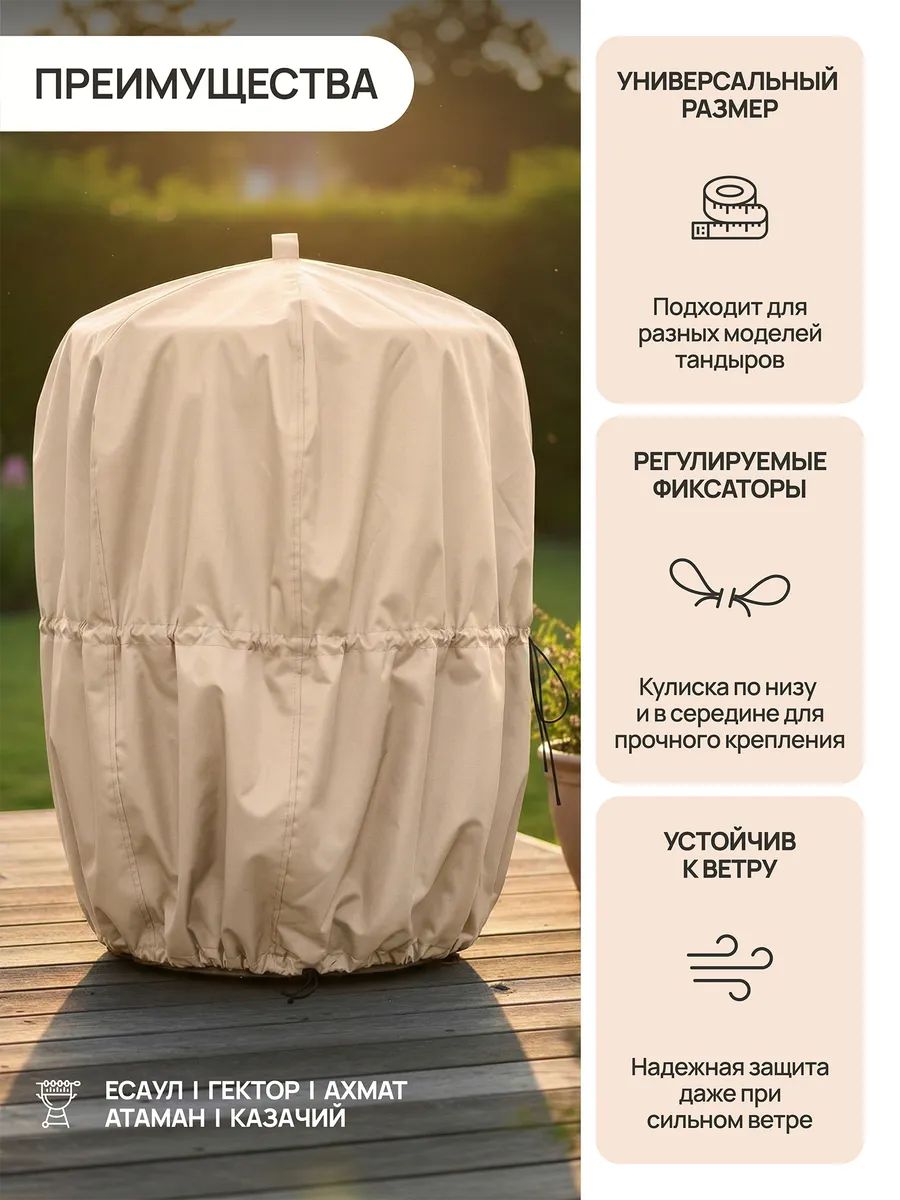 Чехол защитный для тандыра предотвращает накопление влаги, грязи и пыли. Без чехла тандыр может трескаться от влаги, терять внешний вид и быстрее изнашиваться. Чехол для тандыра зимний особенно актуален в холодное время года и межсезонье, когда оборудование подвергается агрессивным погодным условиям.