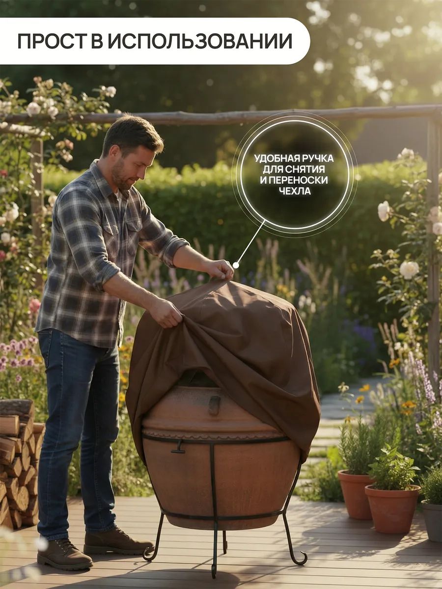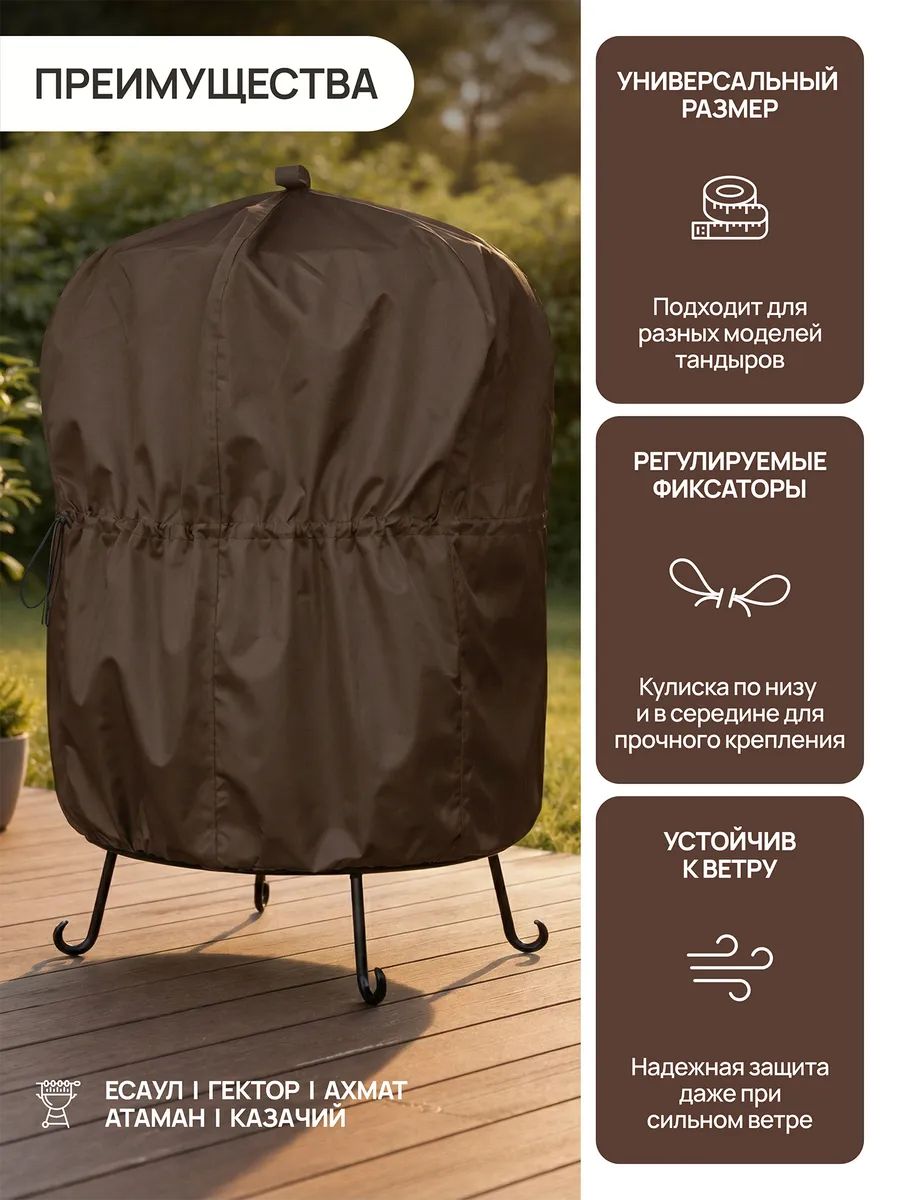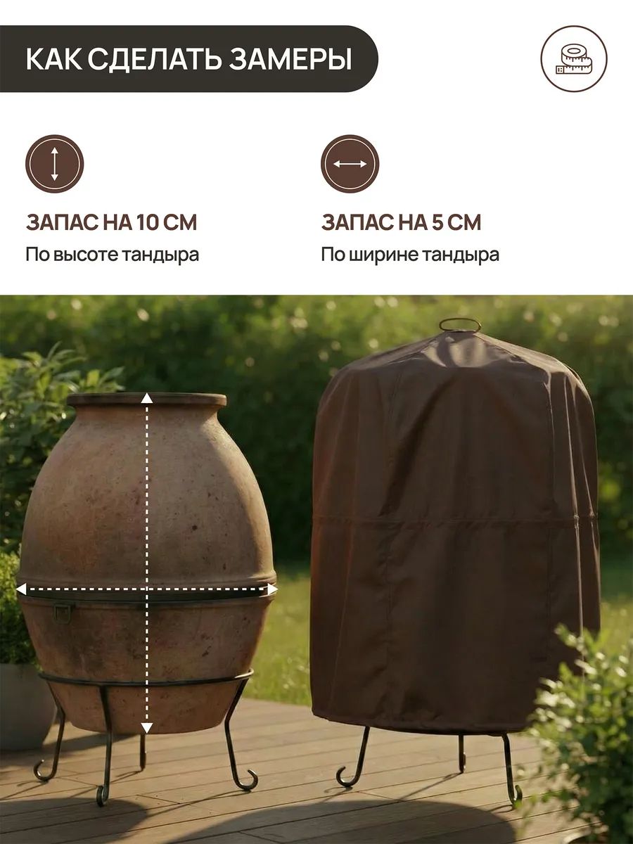 Чехол для тандыра водонепроницаемый 75х105 см — надежная защита тандыра от дождя, снега, влаги, солнца, пыли и грязи. Уличный чехол на тандыр продлевает срок службы печи, предотвращает растрескивание от влаги, образование плесени и выгорание от ультрафиолета. Тент на тандыр подходит для круглогодичного использования: летом защищает от солнца и пыли, зимой — от снега, мороза и осадков. Идеален для дачи, сада и загородного участка.