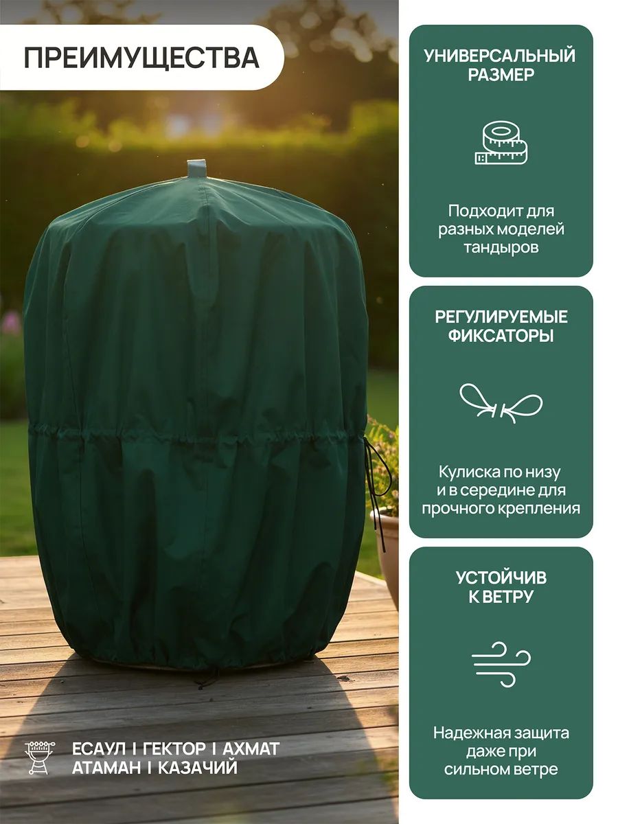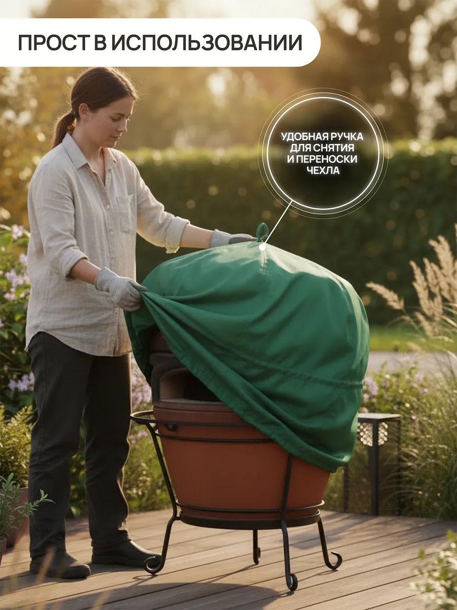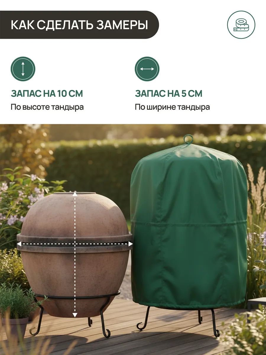 Чехол для тандыра водонепроницаемый 75х105 см — надежная защита тандыра от дождя, снега, влаги, солнца, пыли и грязи. Уличный чехол на тандыр продлевает срок службы печи, предотвращает растрескивание от влаги, образование плесени и выгорание от ультрафиолета. Тент на тандыр подходит для круглогодичного использования: летом защищает от солнца и пыли, зимой — от снега, мороза и осадков. Идеален для дачи, сада и загородного участка.