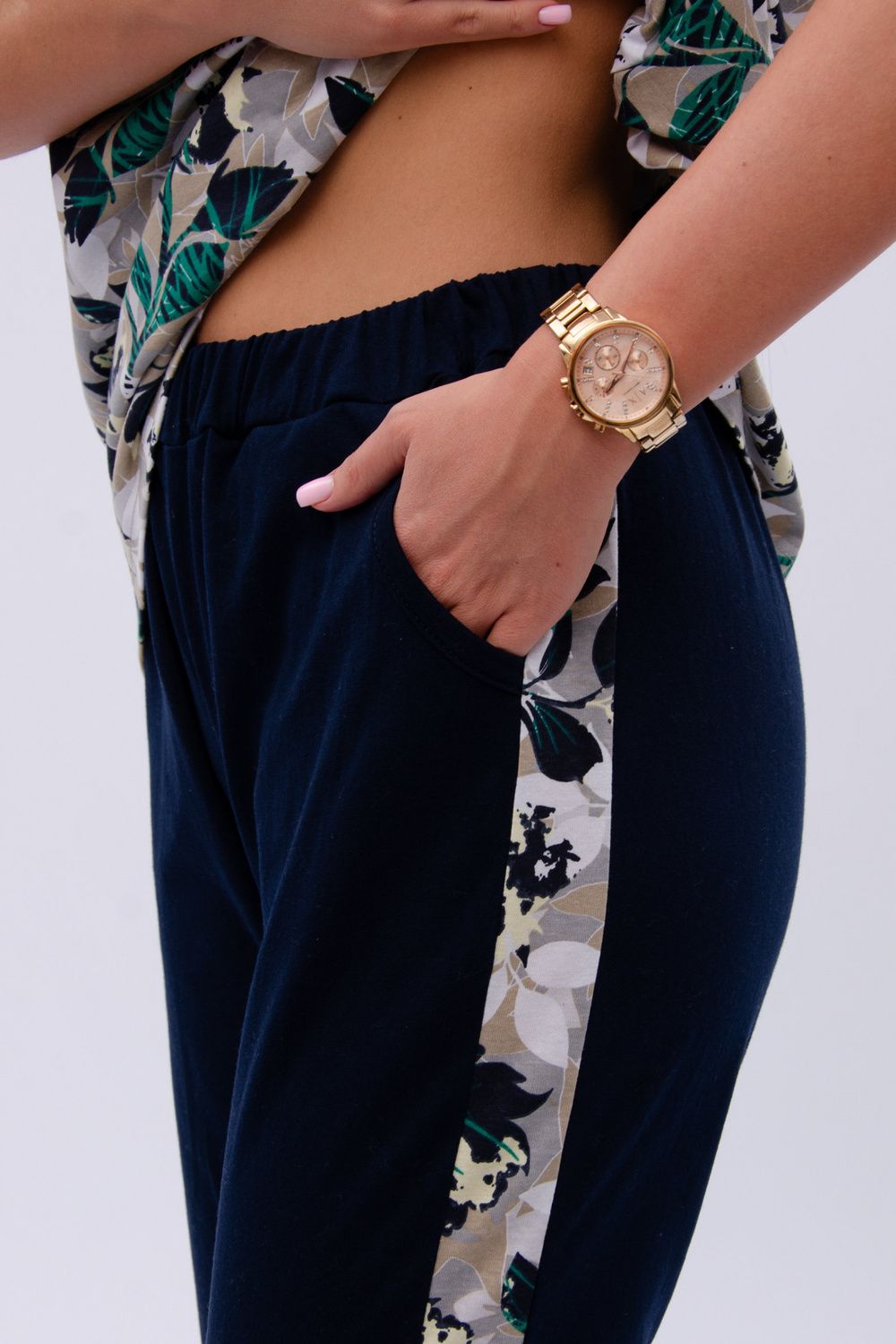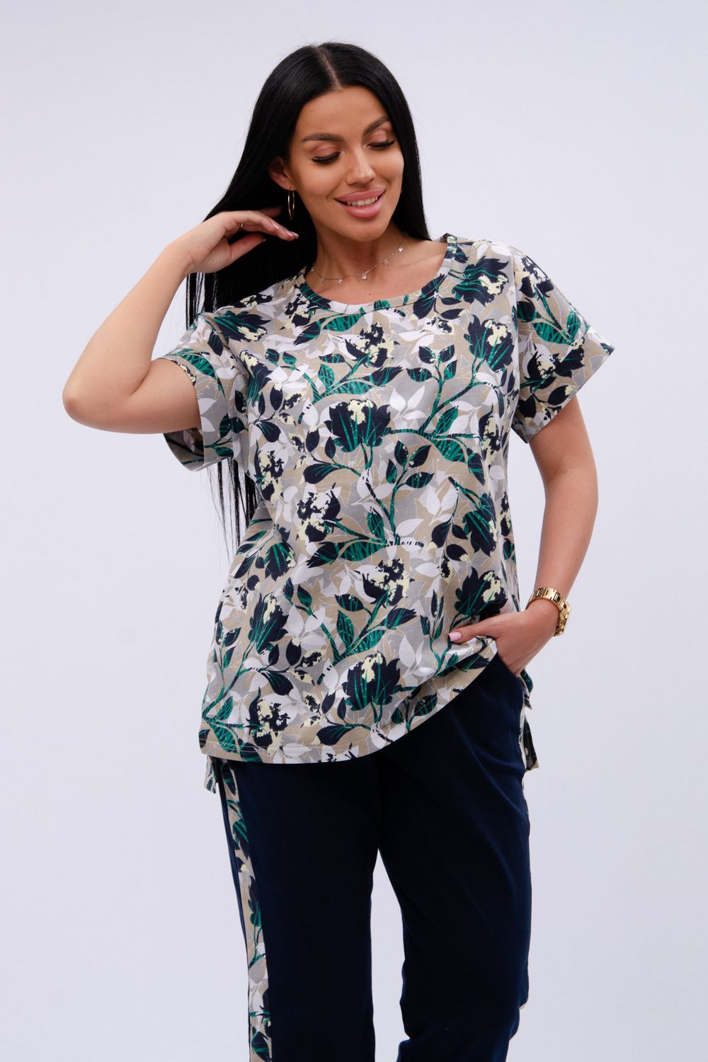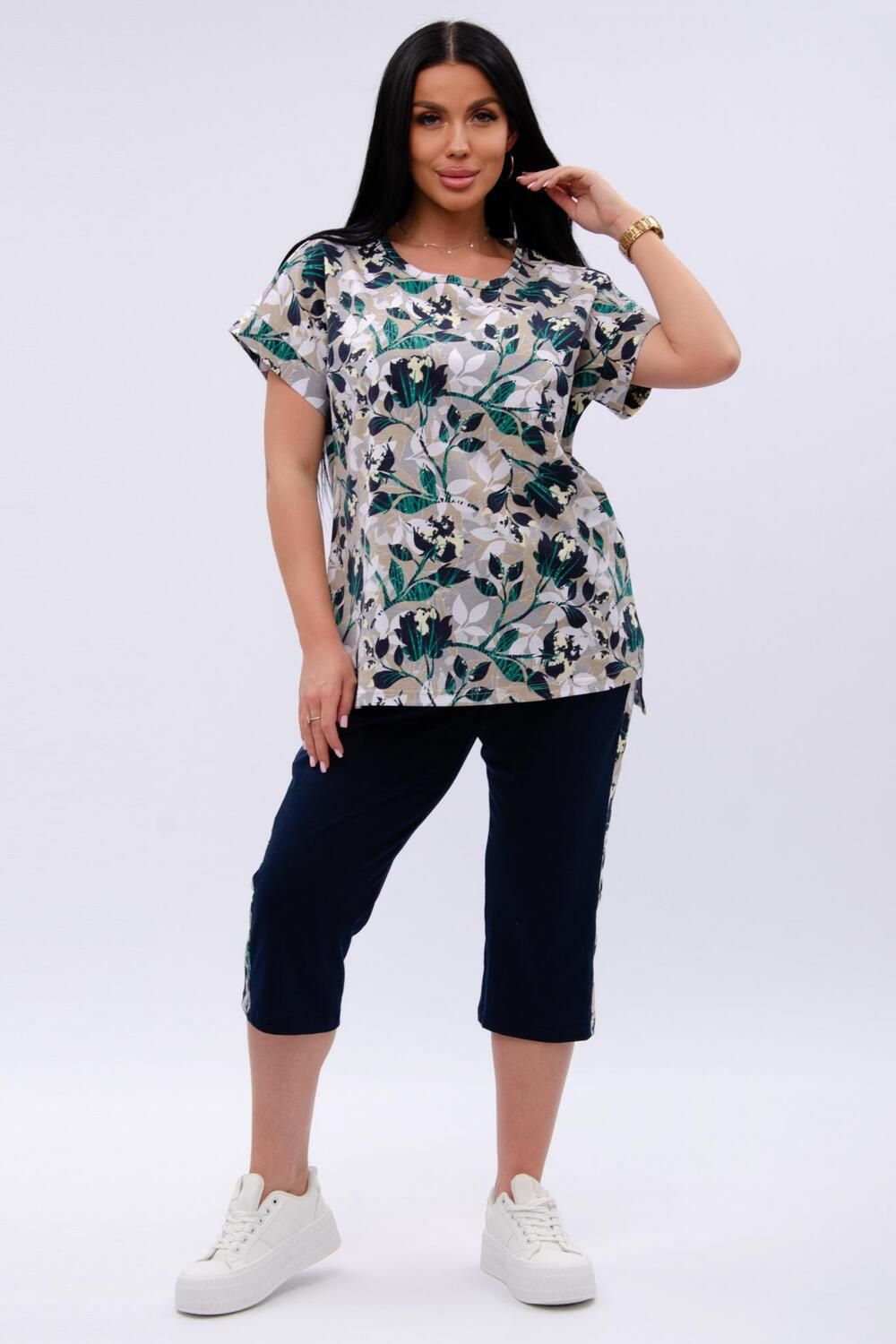 Женский костюм из футболки и бриджей — отличный выбор для дачного сезона и прогулок. Бриджи черного цвета из 100% хлопка обеспечивают комфорт и свободу движения, что особенно важно для активного отдыха на свежем воздухе или дома.
