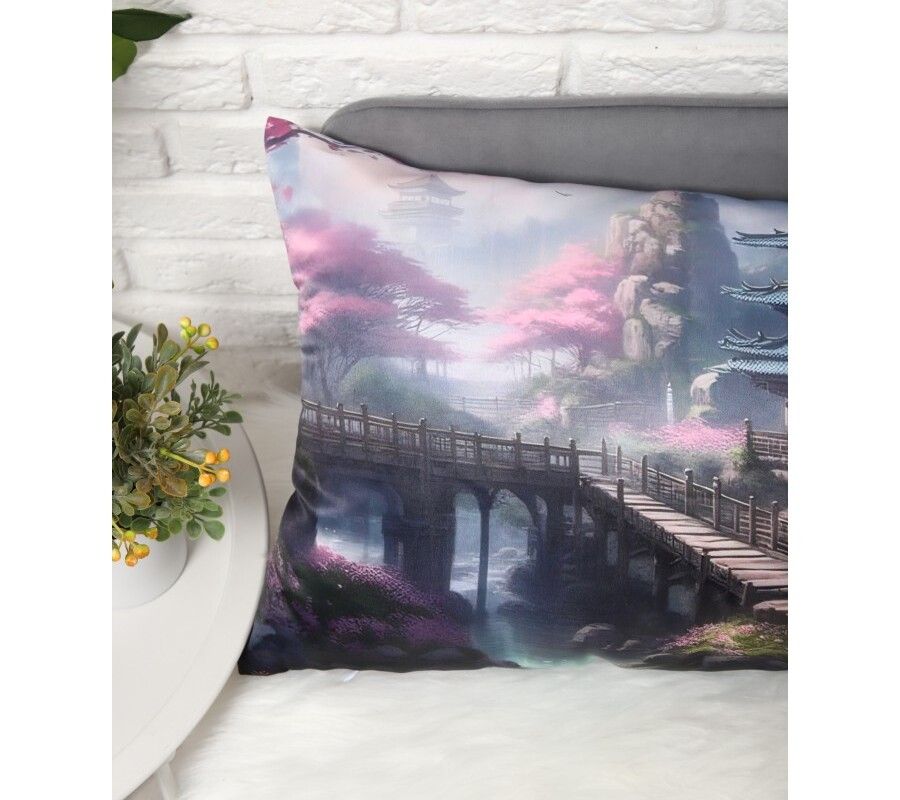Красивая декоративная наволочка 40х60 см с пейзажем в мотивах Японии из атласа Ивановского производства выполнена из высококачественного полиэстера, что делает ее долговечной и простой в уходе. Атлас - блестящая, яркая, приятная на ощупь ткань, благодаря чему изделие из атласа очень красочные, привлекают внимание и поднимают настроение.