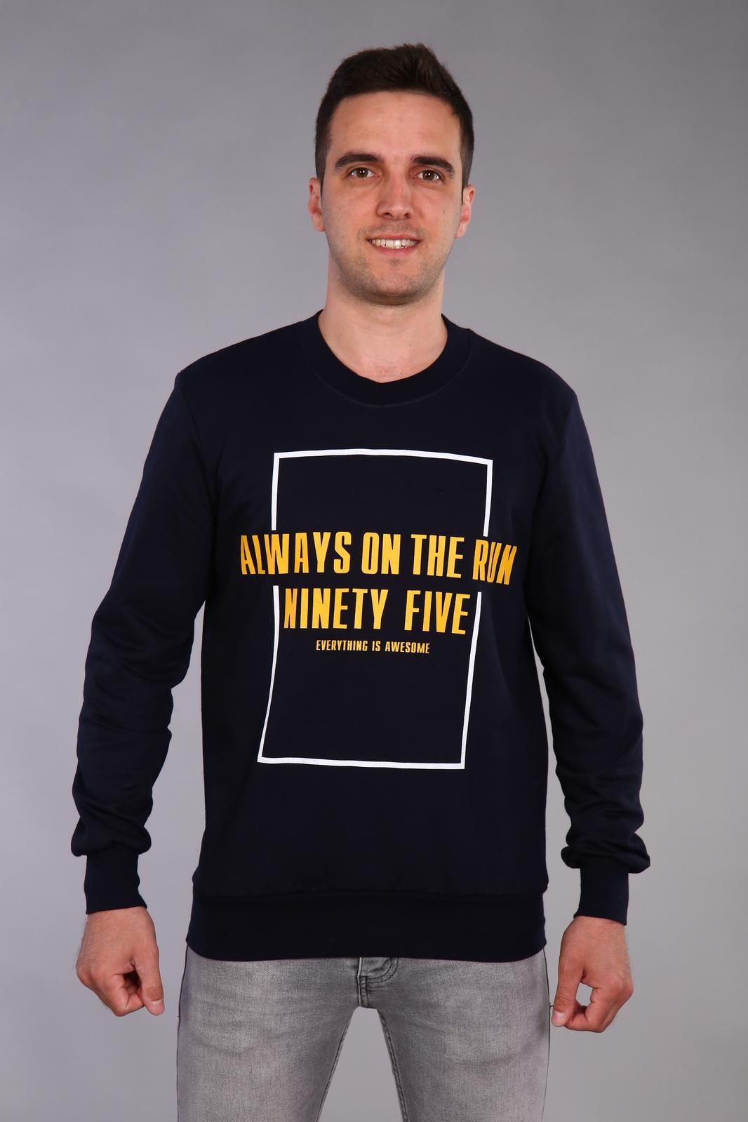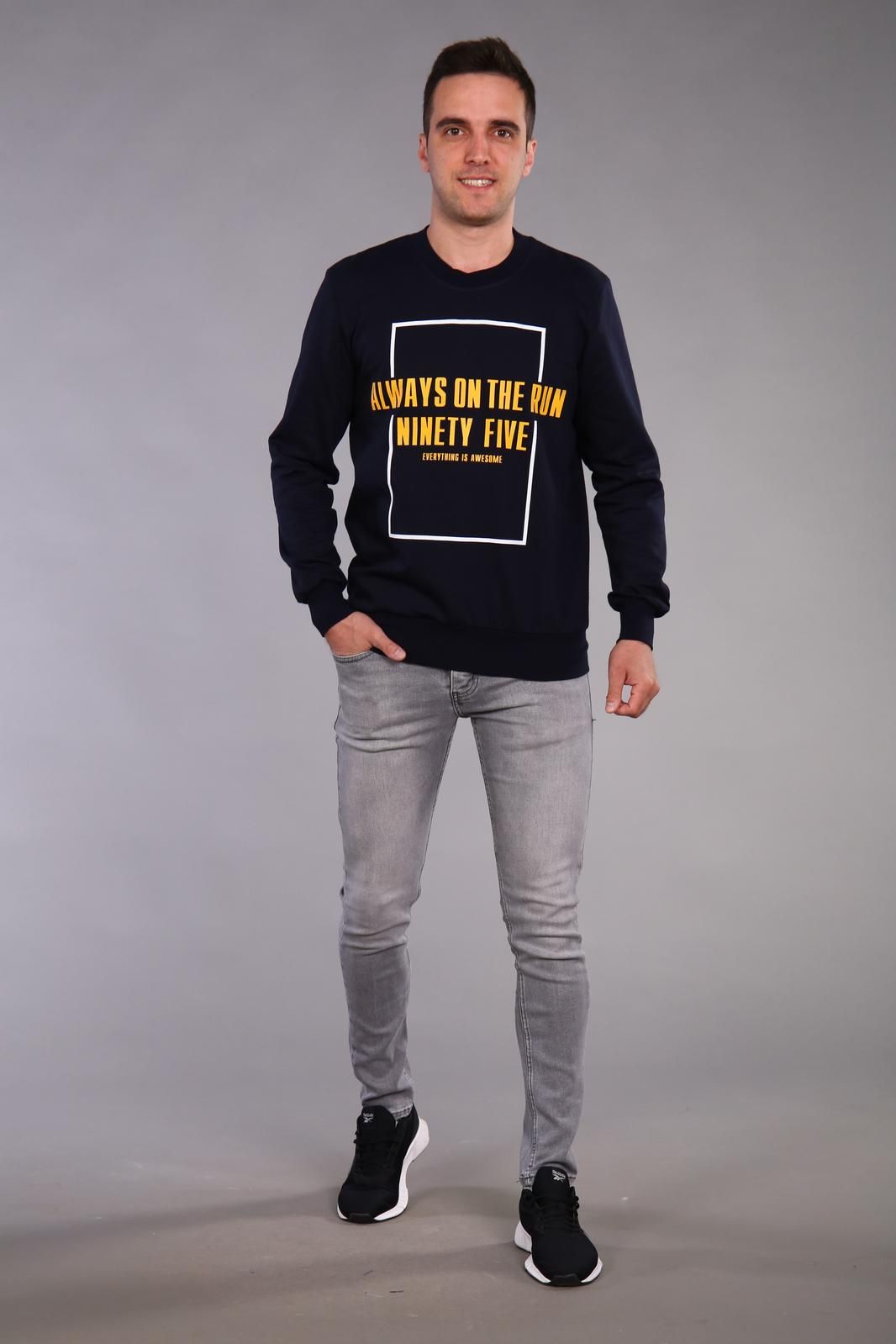 Толстовка классического покроя с длинным рукавом и принтом на полочке. Горловина, пояс и манжеты выполнены из эластичного материала.