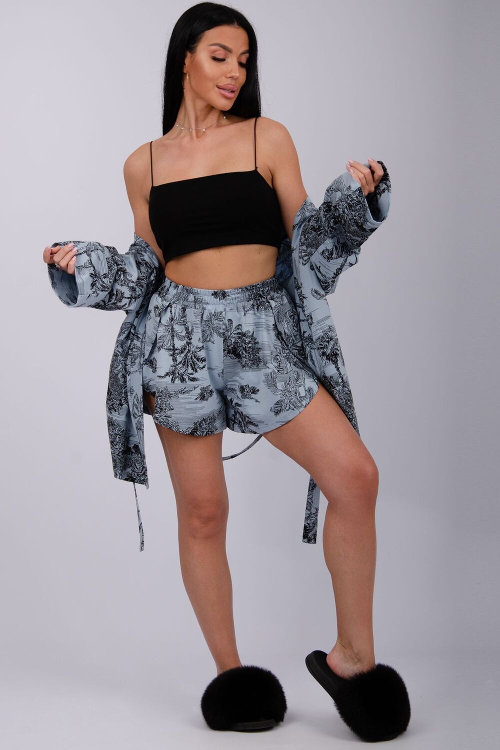 Супер стильный костюм в пижамном стиле - шорты и кимоно халат на поясе для женщин, подойдет для сна и отдыха, подойдет для сна и отдыха и зимой, и летом. А также станет прекрасным акцентом в базовом гардеробе и подойдет для создания расслабленного весеннего оверсайз образа на вечер или пижамную вечеринку. Мягкая приятная к телу струящаяся ткань и свободный силуэт обеспечивает комфорт во время вашего путешествия на море или отдыха. Наш комплект из 2-х предметов подчеркнет женственность и сексуальность.
