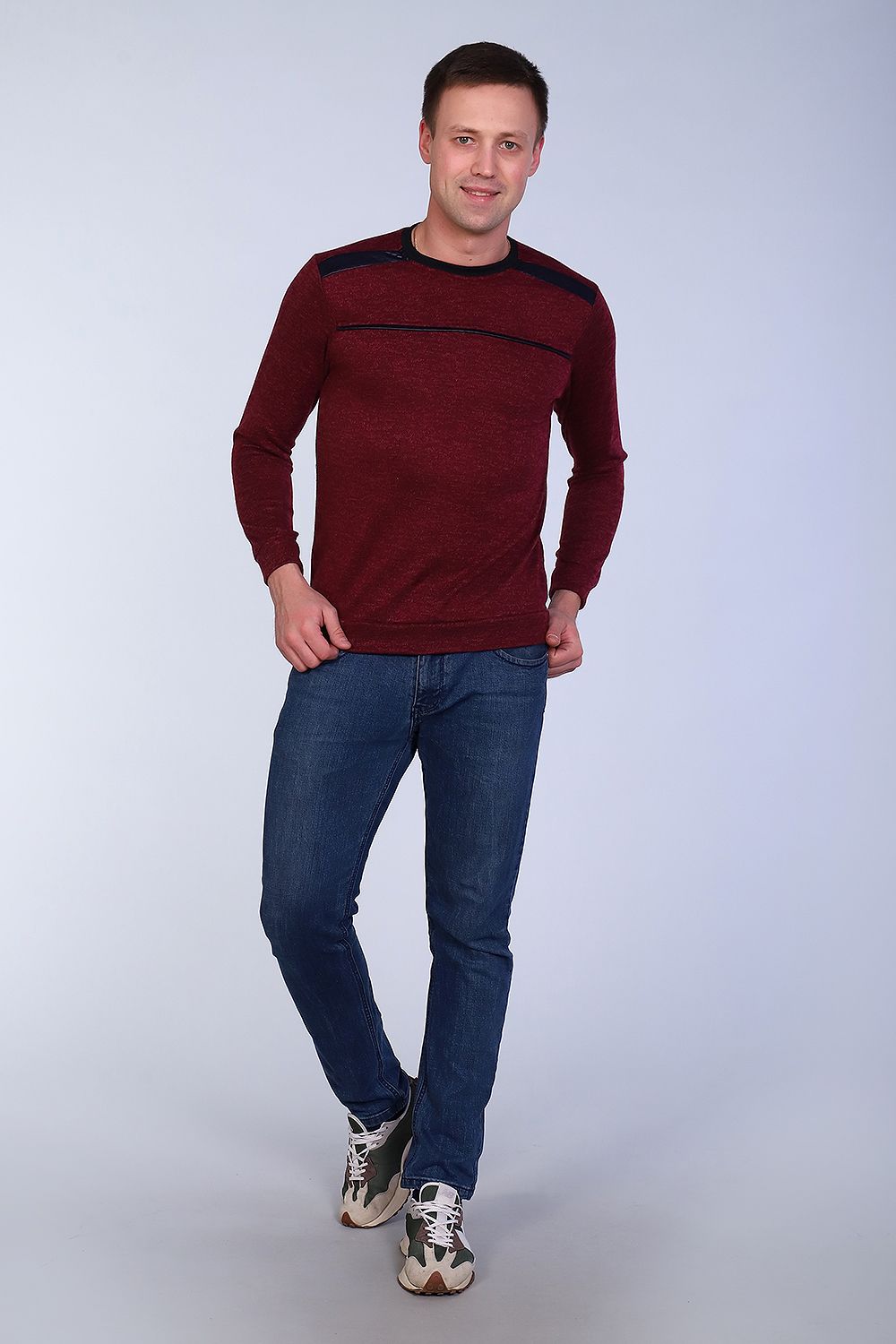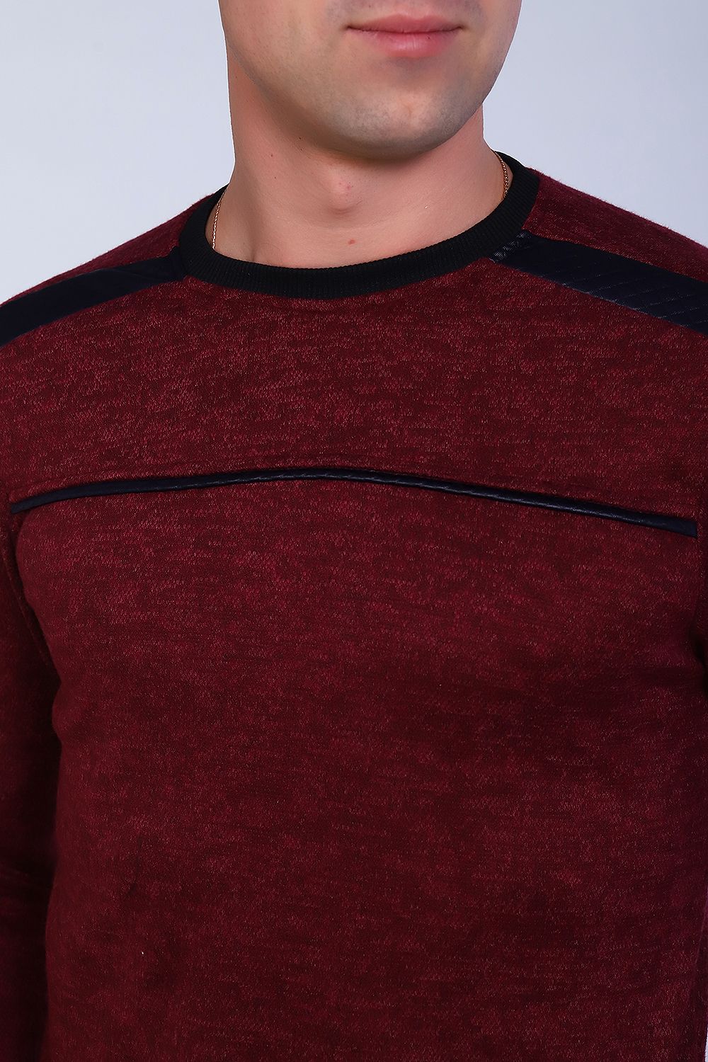 Модный и стильный мужской джемпер, длинный рукав на манжете. В плечевых швах вставки из эко-кожи. Округлый воротник, низ изделия также на манжете. Маломерит. Джемпер подходит для среднего и маленького роста. Практично и удобно.