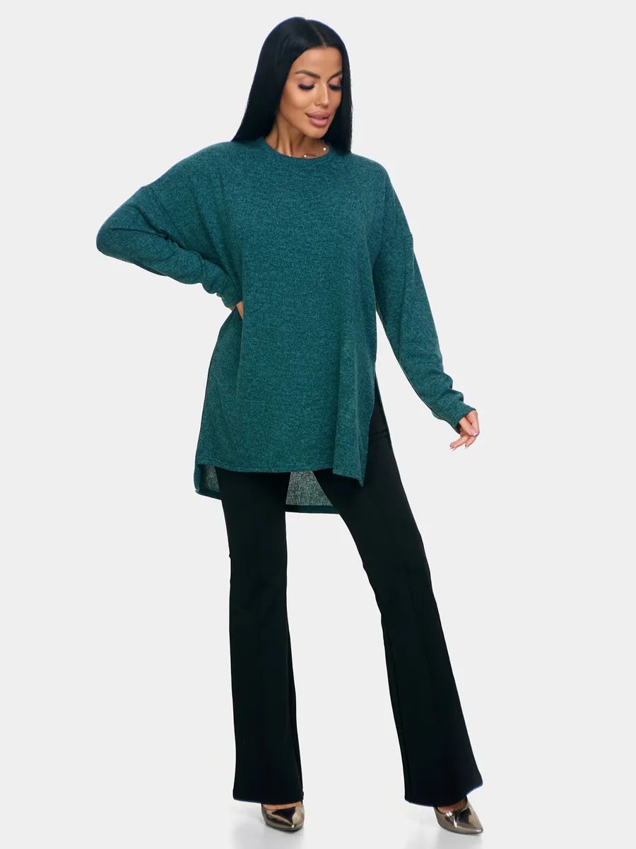 Длинный джемпер из ангоры софт обволакивает мягкостью, нежностью и теплом. Трикотажный пуловер меланжевый с длинными рукавами и с округлым вырезом горловины. Свободный крой и разрезы по бокам идеальны для любого типа фигуры. Трикотажный джемпер отлично подойдет для беременных и для женщин plus size.