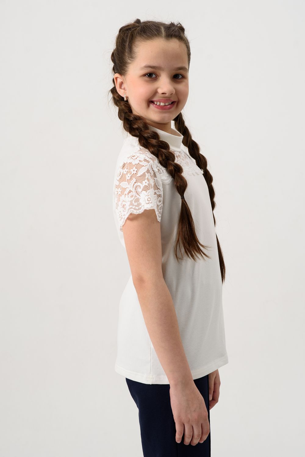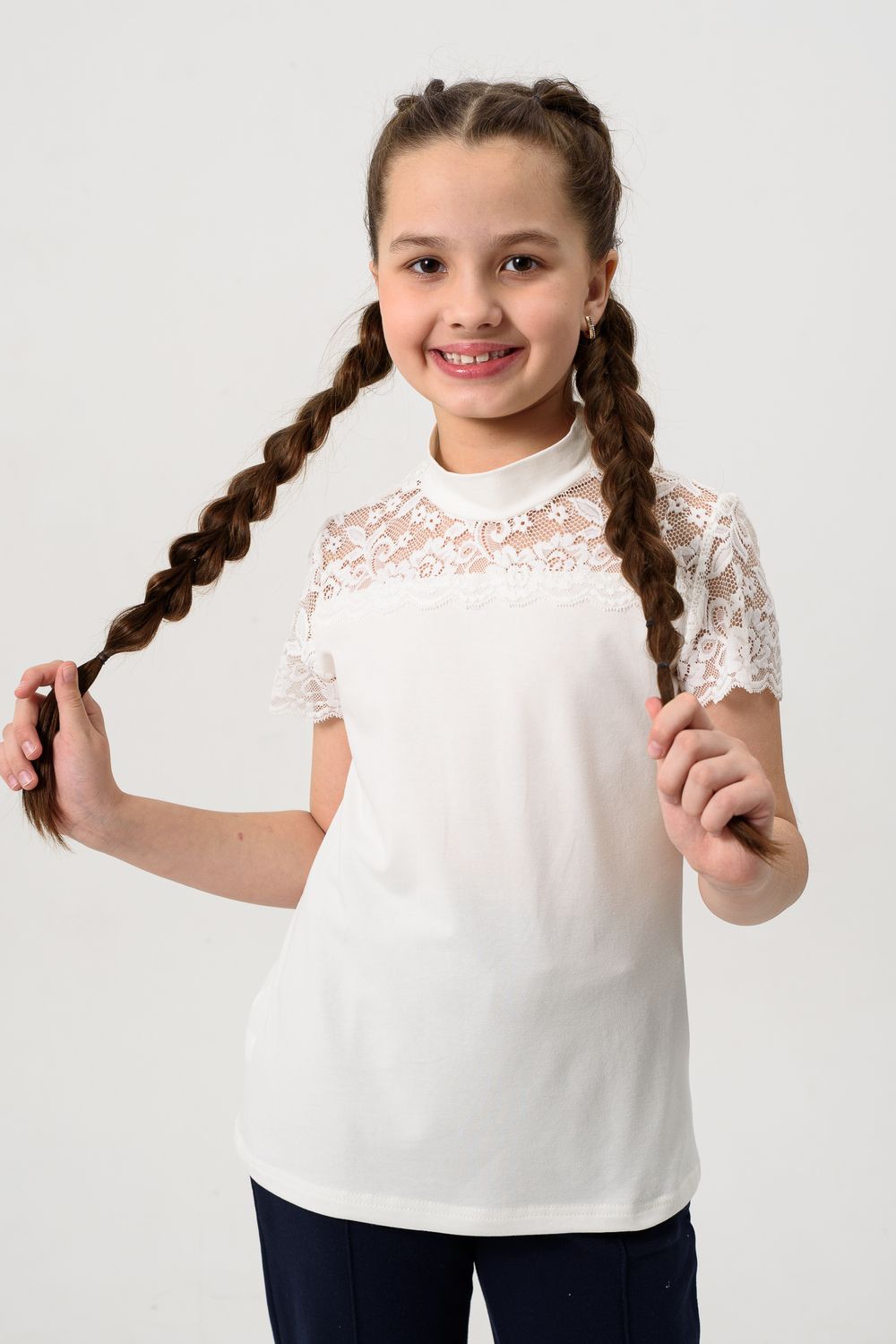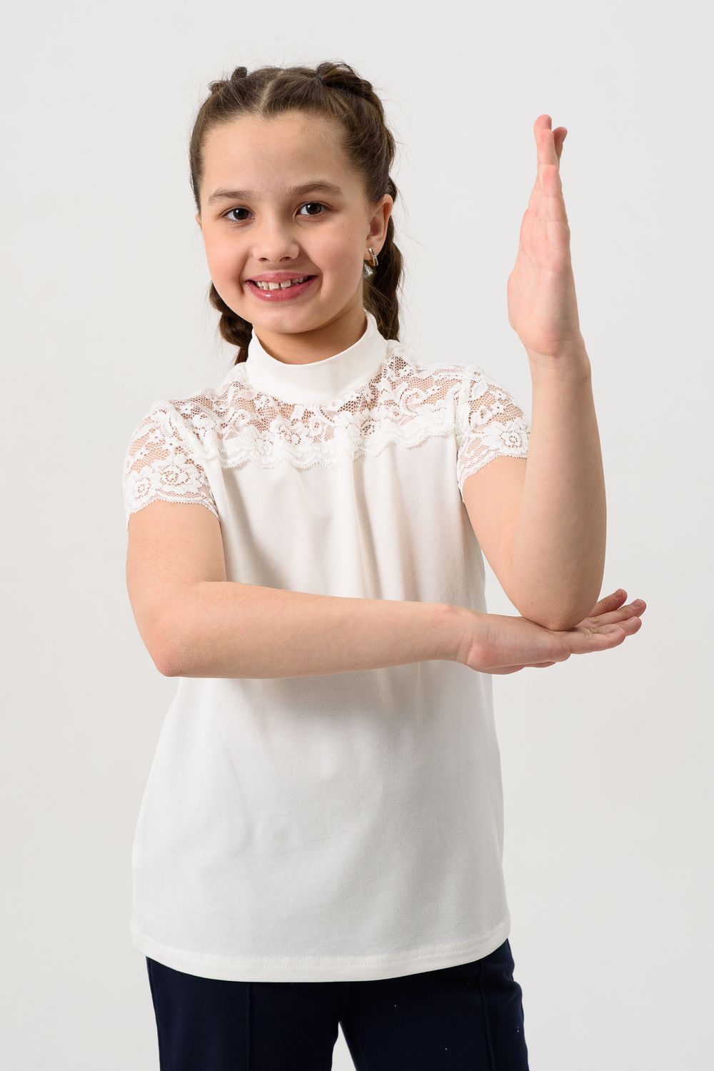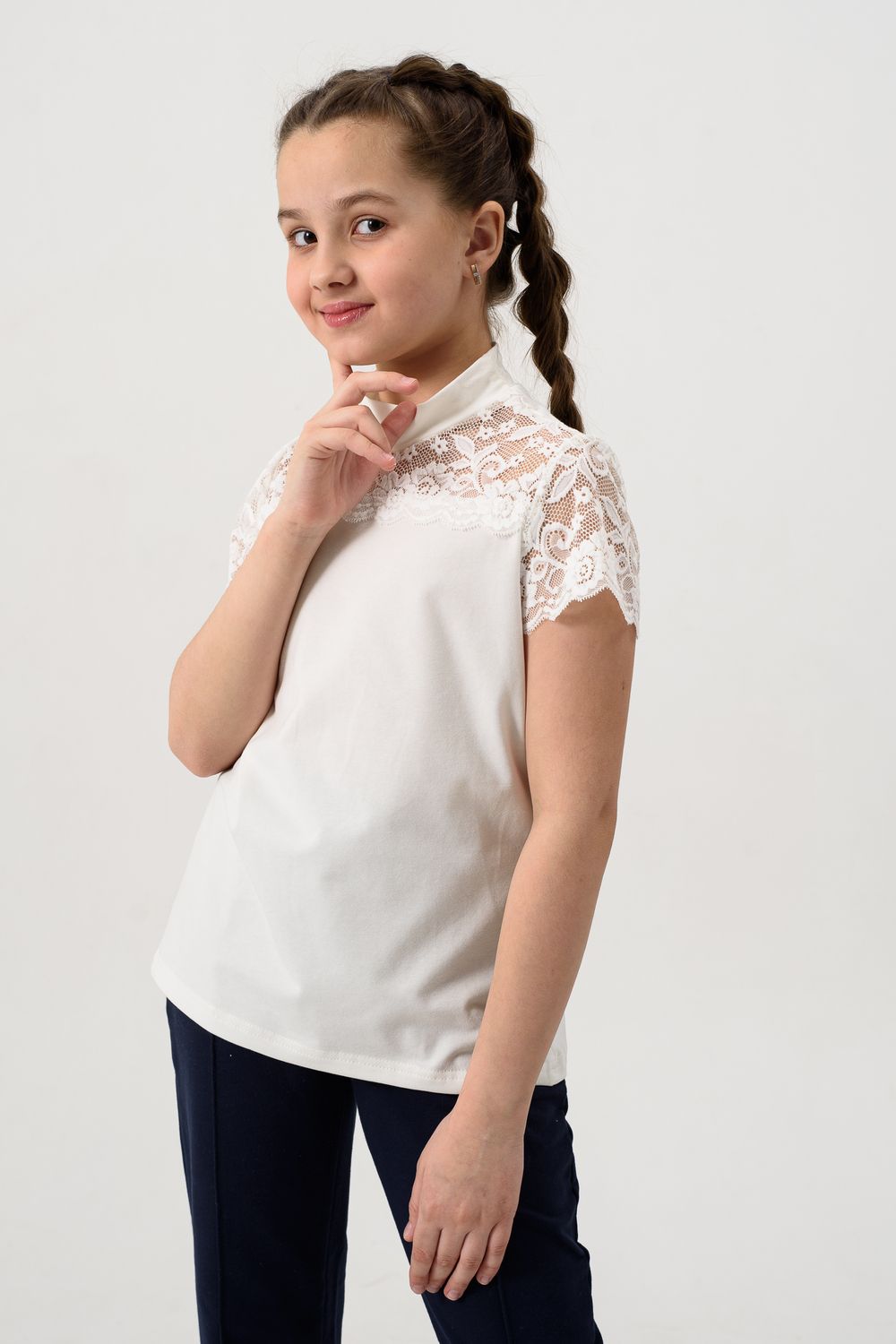 Блузка для девочек младшего и старшего школьного возраста, из трикотажного однотонного полотна – кулирка с лайкрой и эластичного кружева (дизайн и ширина кружева может меняться). Блузка полуприлегающего силуэта, с втачным коротким рукавом, с воротником – стойкой. Спереди отрезная кружевная кокетка. На спинке отсутствуют линии членения. Рукав одношовный, выполнен из эластичного кружева. Низ изделия подогнут.