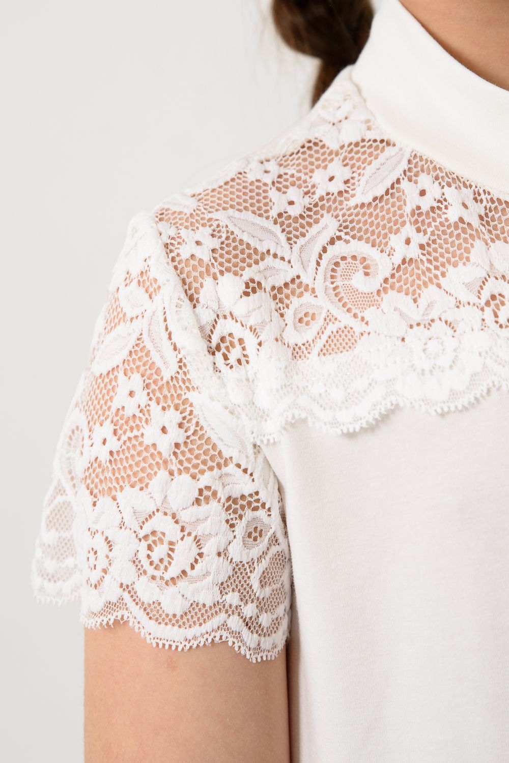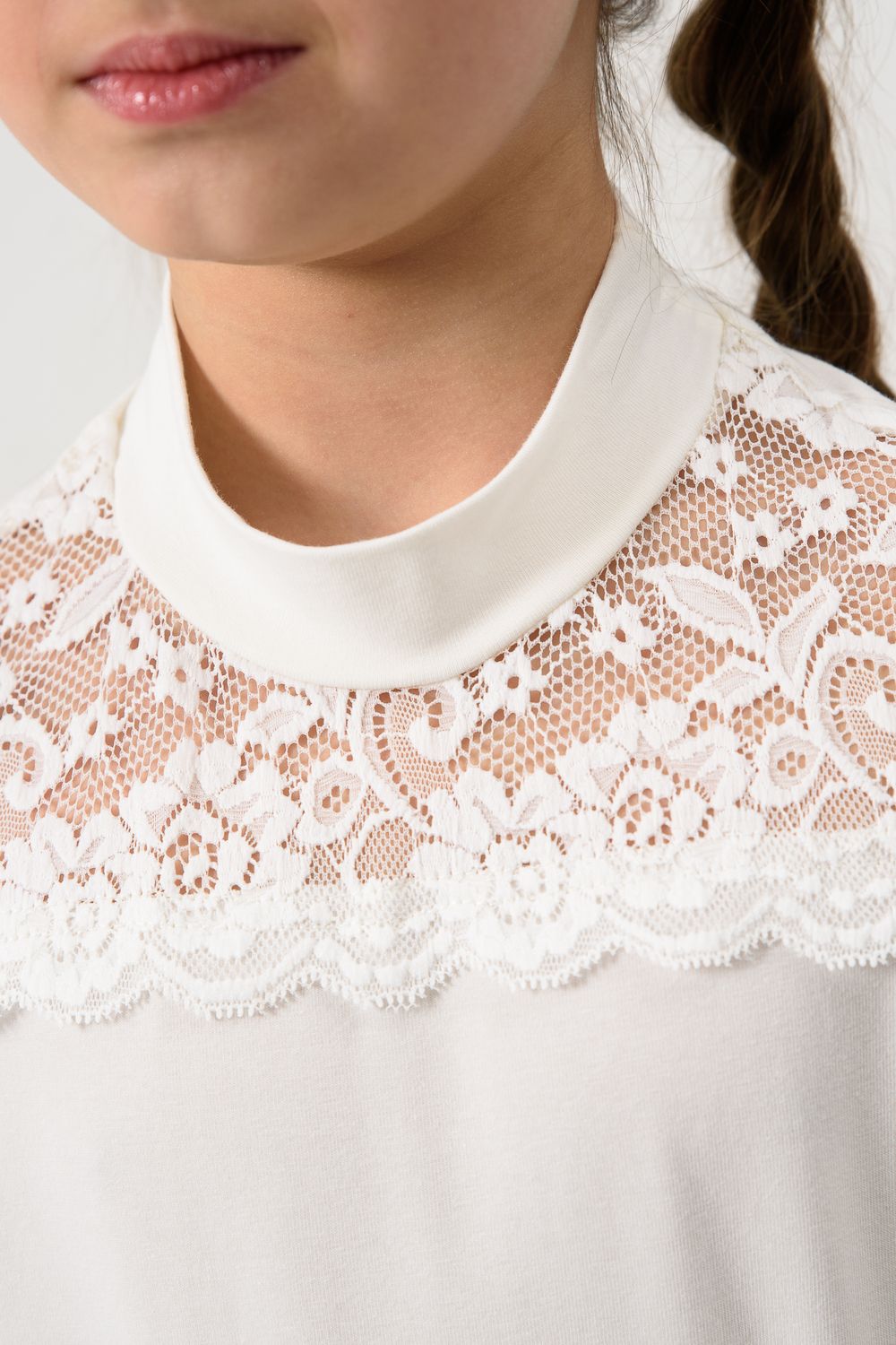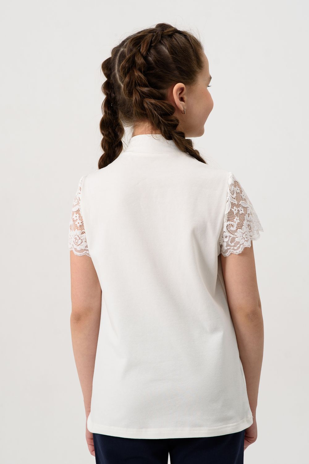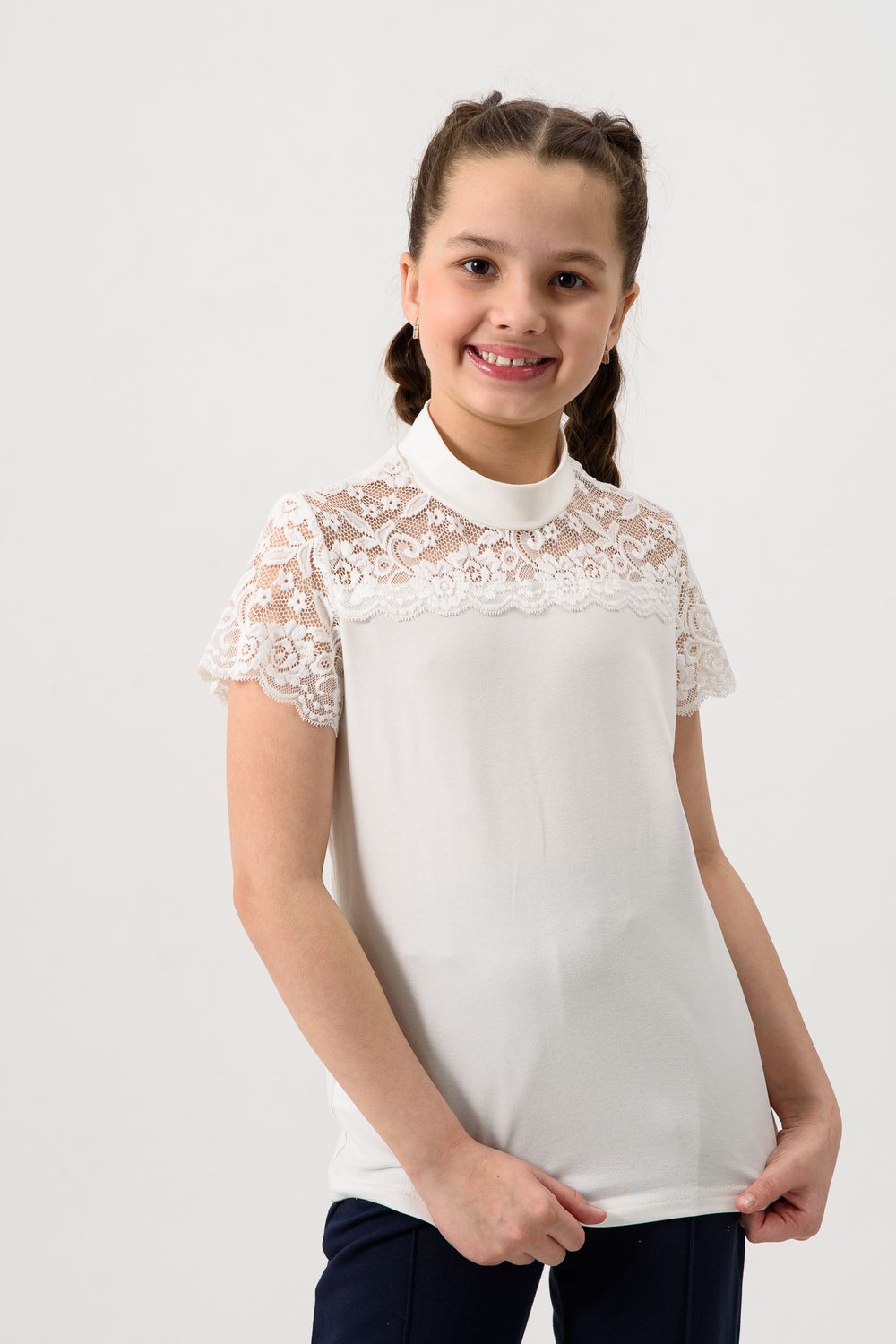 Блузка для девочек младшего и старшего школьного возраста, из трикотажного однотонного полотна – кулирка с лайкрой и эластичного кружева (дизайн и ширина кружева может меняться). Блузка полуприлегающего силуэта, с втачным коротким рукавом, с воротником – стойкой. Спереди отрезная кружевная кокетка. На спинке отсутствуют линии членения. Рукав одношовный, выполнен из эластичного кружева. Низ изделия подогнут.