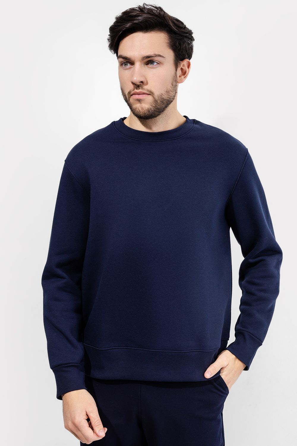 Джемпер из трикотажного футера с теплым подчесом. Длина до середины бедер, силуэт прямой. Линия плеча спущена. Рукава длинные, с притачными манжетами. Горловина круглой формы. Отличный вариант для стильных городских образов!