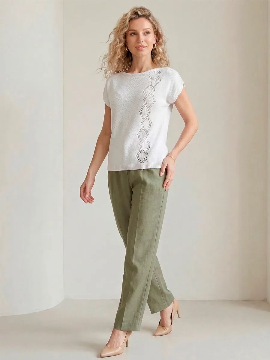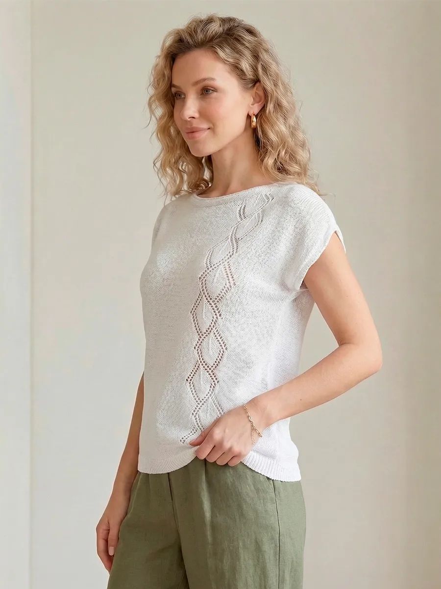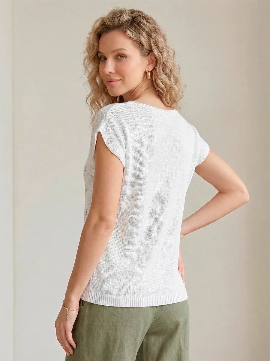 Футболка летняя вязаная - настоящая находка для ценителей стильных и комфортных вещей. Ее ажурная отделка придает изысканный вид, добавляя немного ретро-стиля в ваш образ. Модный дизайн делает базовую футболку универсальной для любого случая - будь то вечерние прогулки или праздничные мероприятия. Нарядная футболка с приталенной посадкой замечательно впишется в образ любой модницы. Однотонная футболка с вырезом лодочка станет замечательным подарком на любой праздник. Большие размеры и удобный свободный крой делают эту оверсайз футболку идеальным выбором как для беременных, так и для высоких и невысоких женщин. Классическая футболка с длинной посадкой и авторским рисунком в виде ромбов подойдет для офиса, школы и для домашнего отдыха. Она подходит для девушек и женщин всех возрастов.